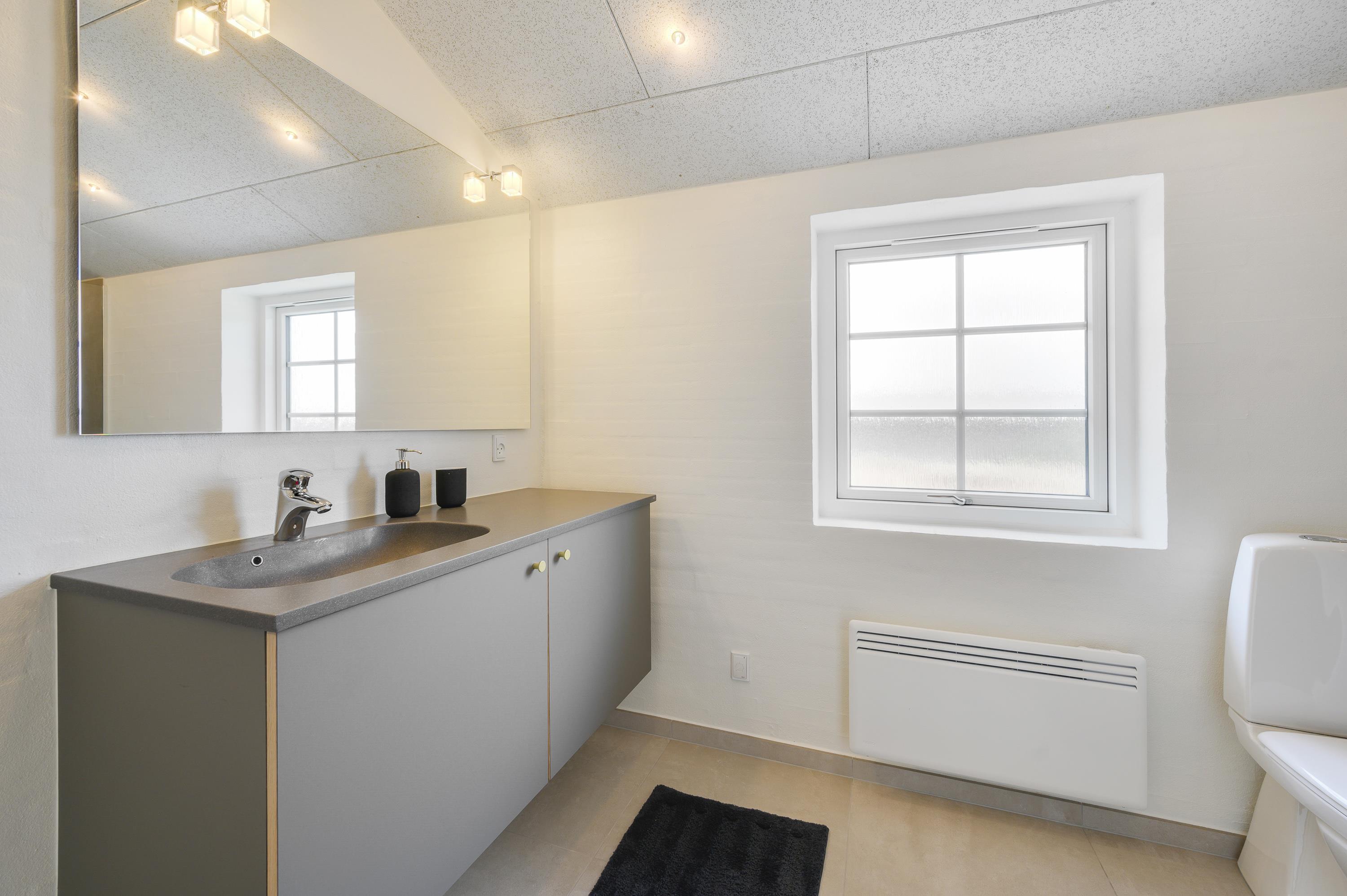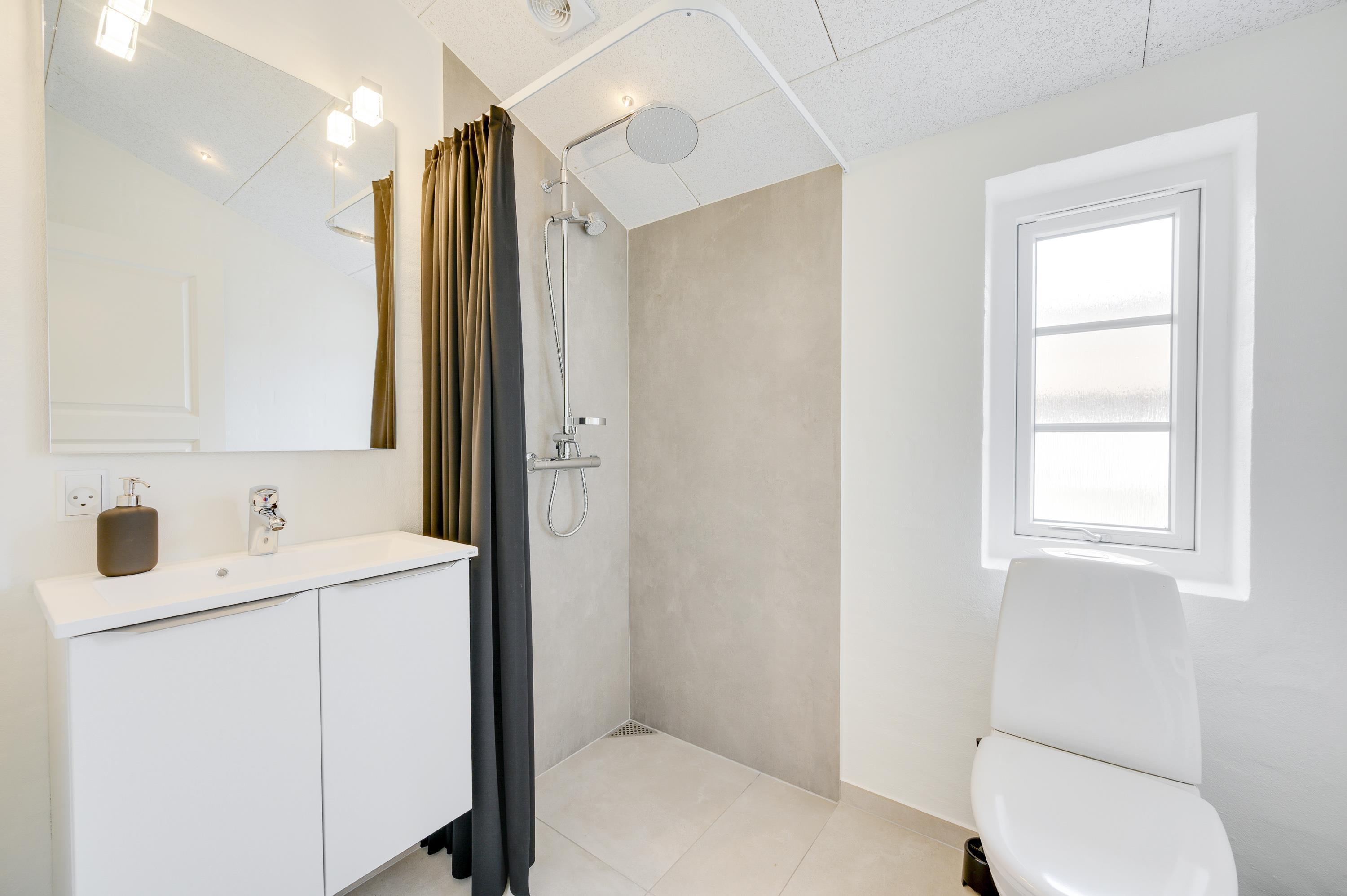 På det store badeværelse finder I sommerhusets store højdepunkt – den skønne sauna. Det er det helt perfekte sted at være, når I trænger til afslapning. På dette badeværelse er der desuden 2 brusere.