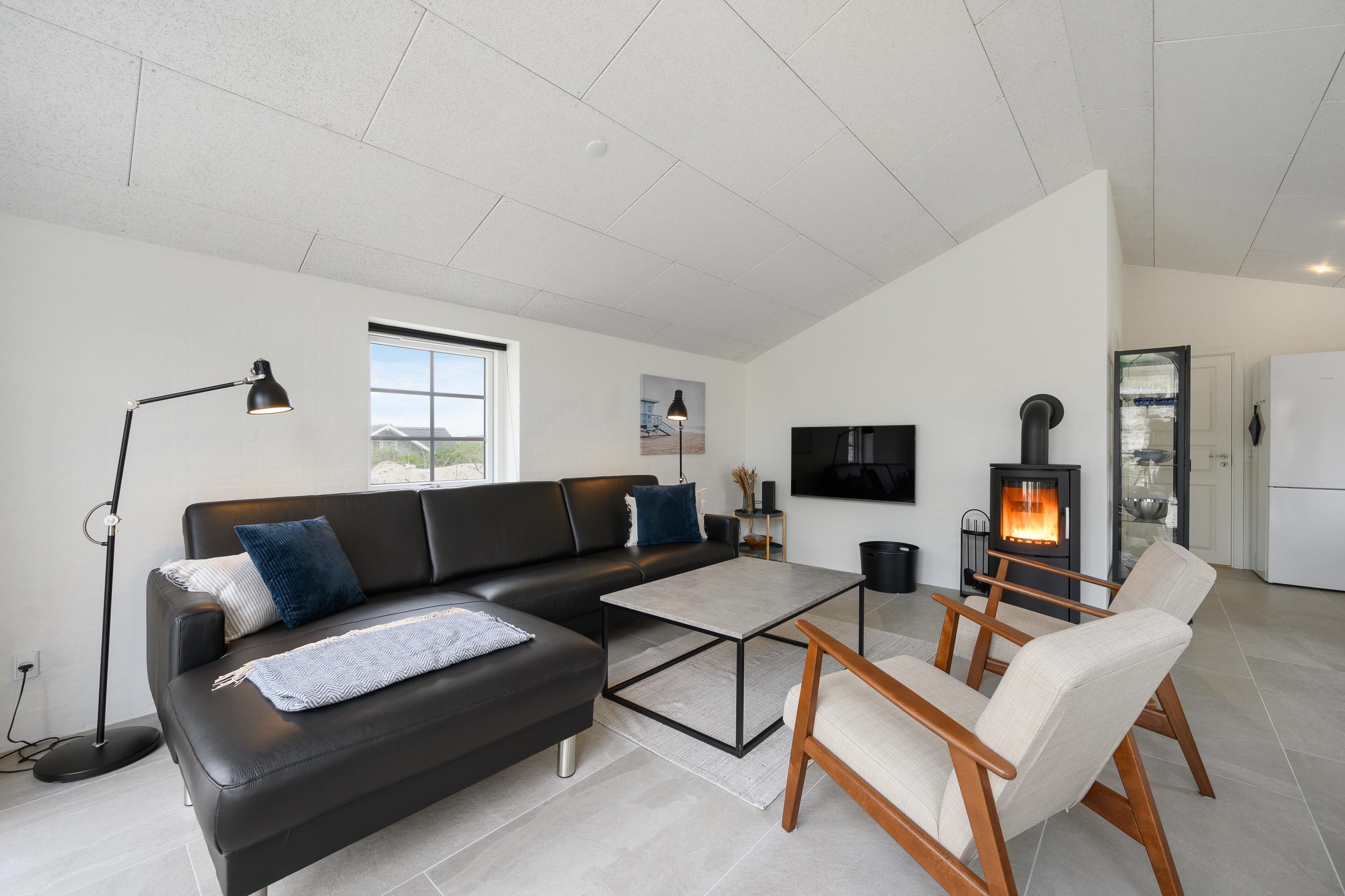 Sommerhusets hjerte er det store opholdsrum, der forener køkken, stue og spiseplads i ét. Her kan I nyde mange hyggelige stunder med hinanden, hvad end det er med fælles madlavning, et hyggeligt spil eller en god film i tv’et. Top det hele af med at tænde op i brændeovnen, der fuldender den gode feriestemning.