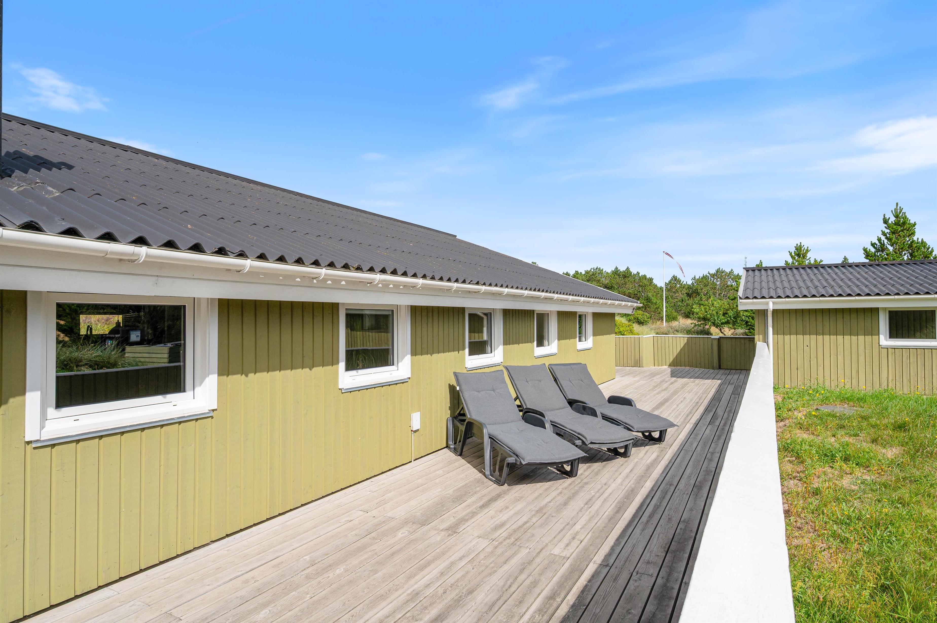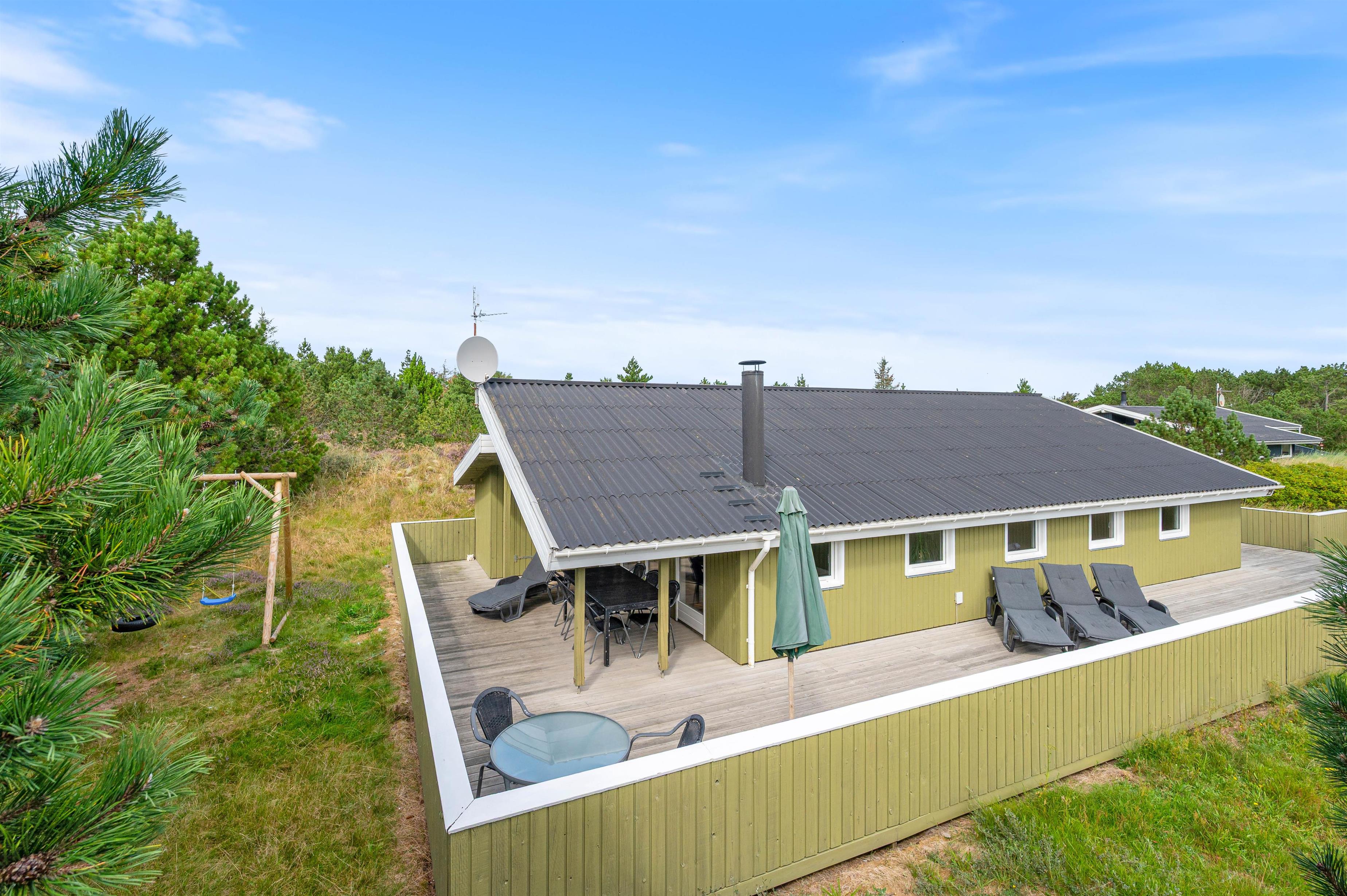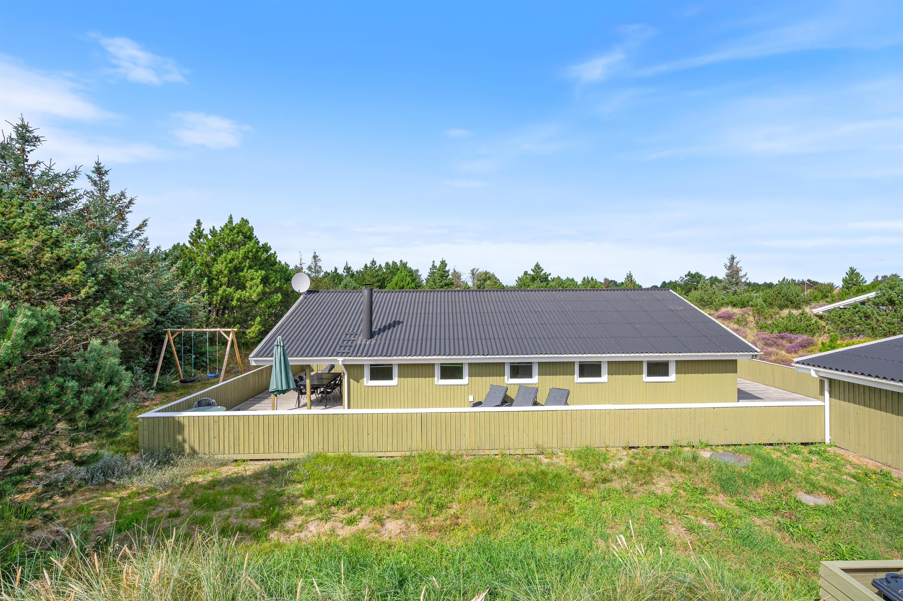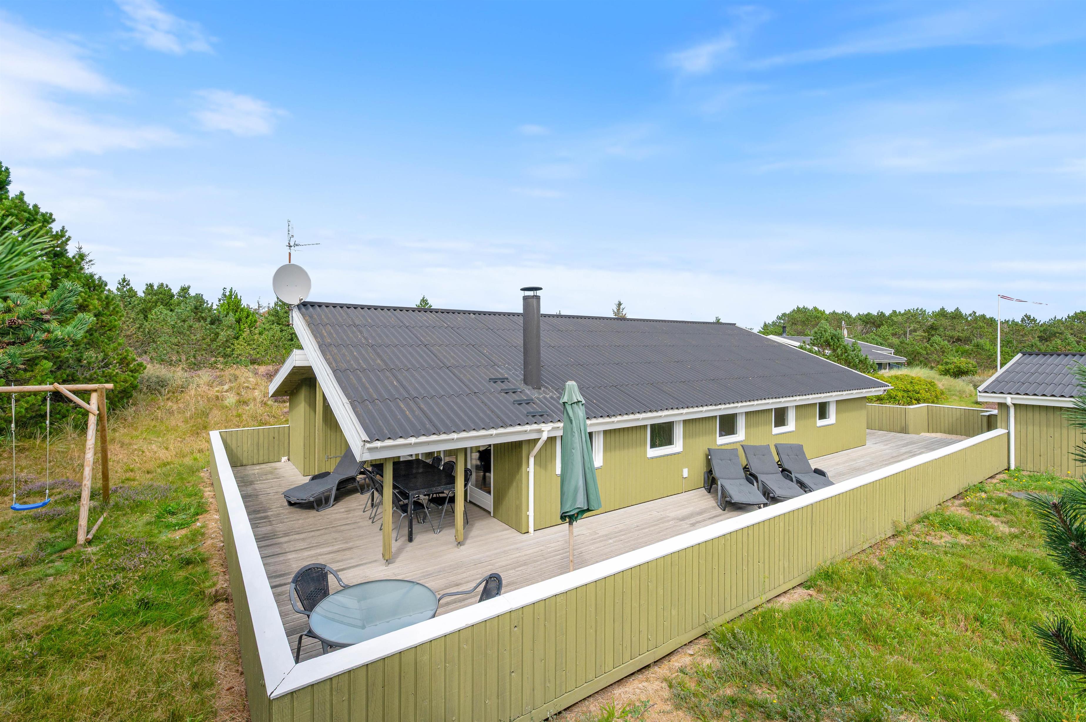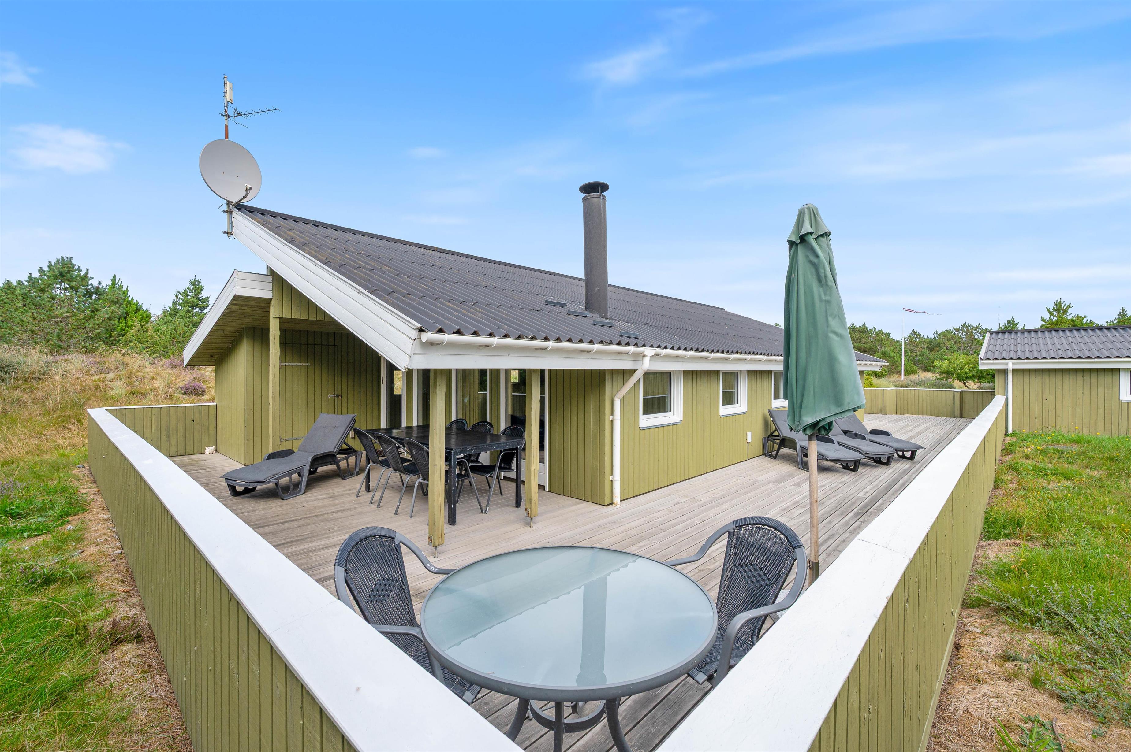 Til feriehuset på Bjerregårdsvej 25 hører en usædvanlig dejlig terrasse. Den er helt aflukket, så I sagtens kan lade småbørn stavre rundt på egen hånd. Terrassen strækker sig omkring tre af feriehusets fire sider og det er storset altid muligt for at finde et dejligt sted med læ. Og skulle den danske sommer vise sig fra sin drilske side, har terrassen også en god hyggekrog med halvtag og afskærmning, så I kan sidde i læ og tørvejr og stadig nyde en hyggelig grillaften.
