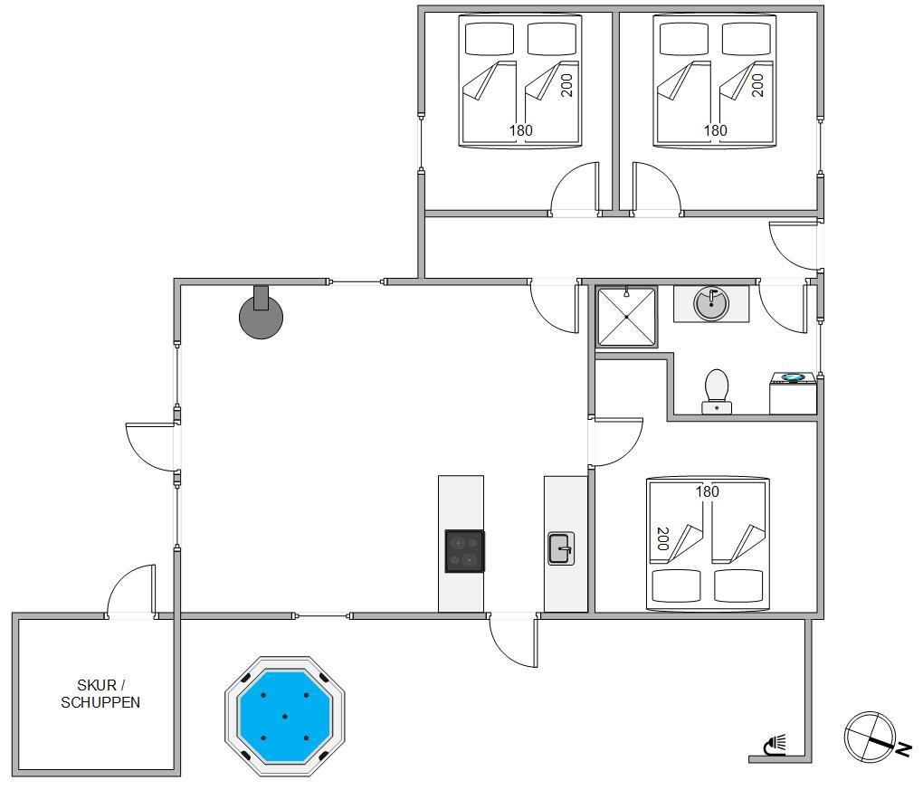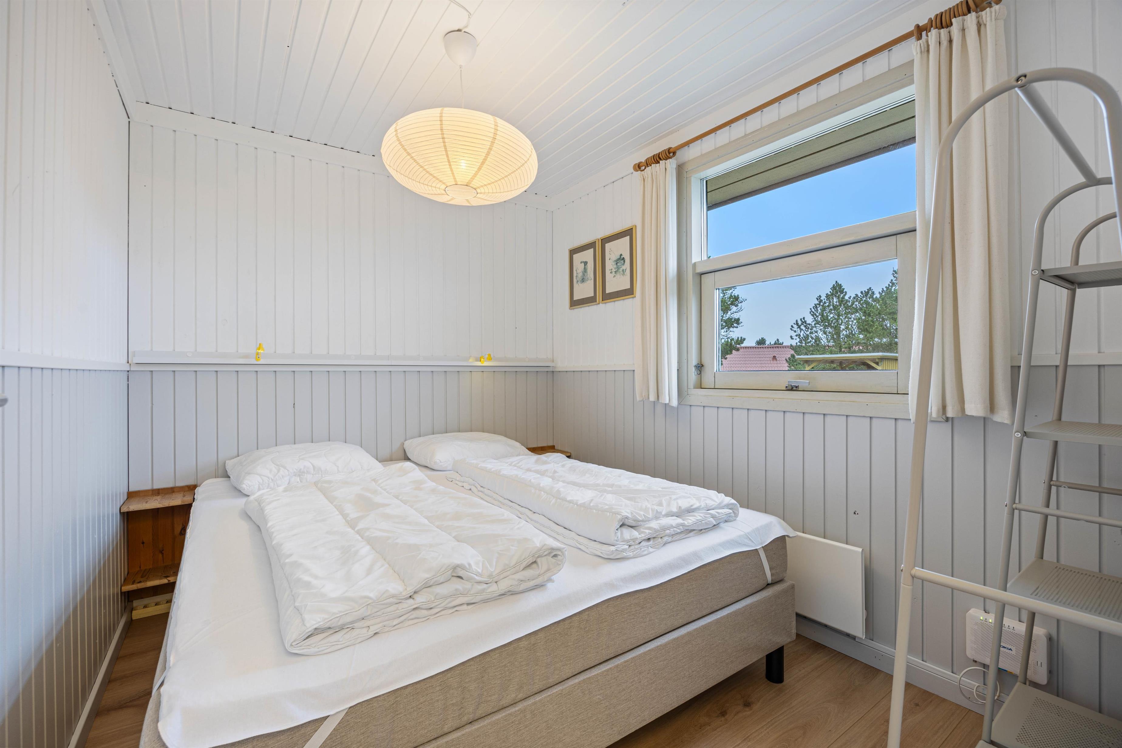 Ellers finder I sommerhuset 3 fine soveværelser – alle lyst indrettet og med komfortable dobbeltsenge. På sommerhusets badeværelse er der gulvvarme, så I undgår at fryse tæerne.