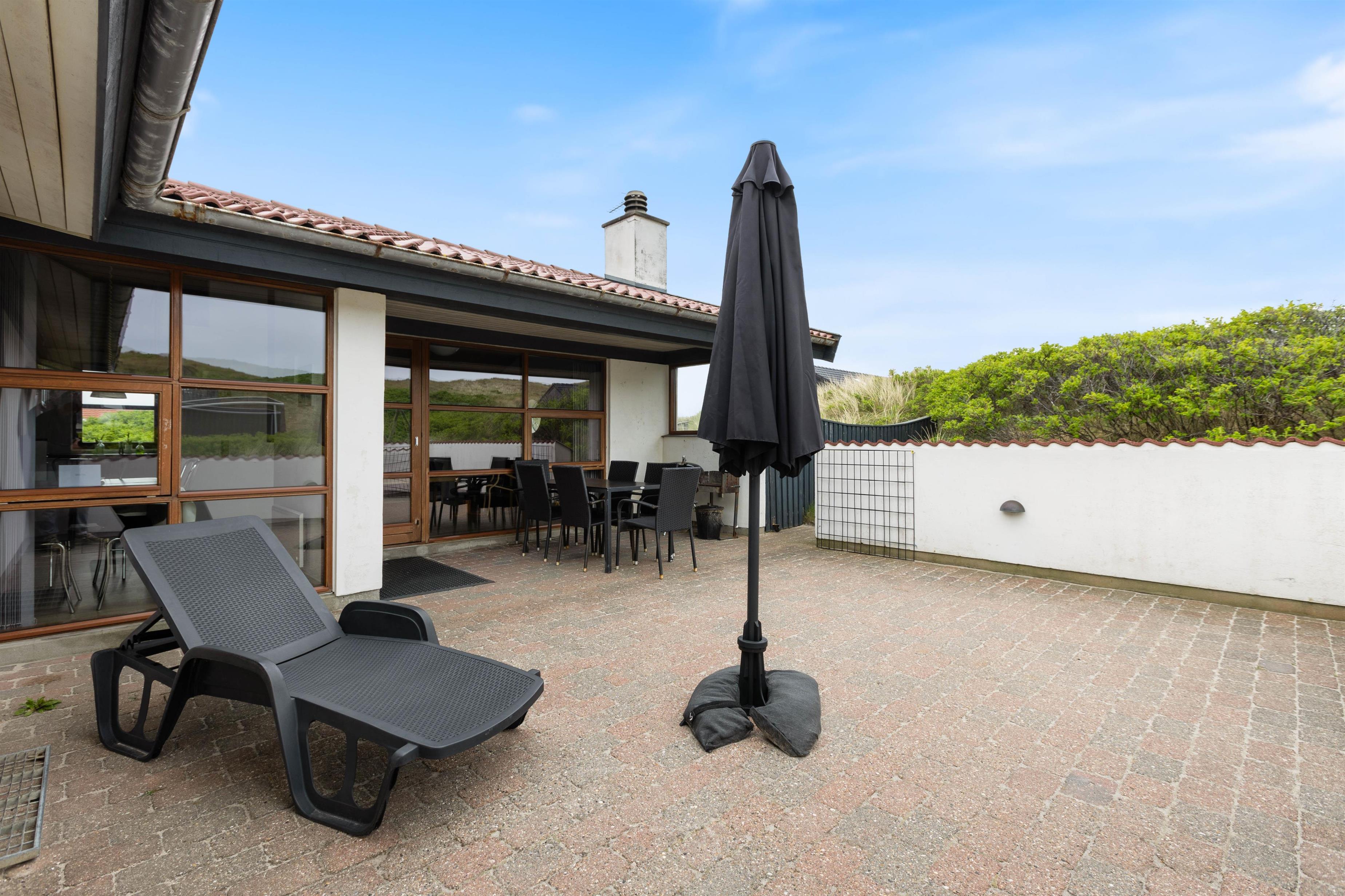 I har direkte adgang til den store, afskærmede og lukkede terrasse fra sommerhusets hyggelige stue. Komfortable havemøbler venter på jer til en lækker grillaften med hele familien. Solen og den nyeste roman kan nydes på liggestolene, mens den delvist overdækkede og afskærmede terrasse giver læ for vinden og mulighed for skygge.