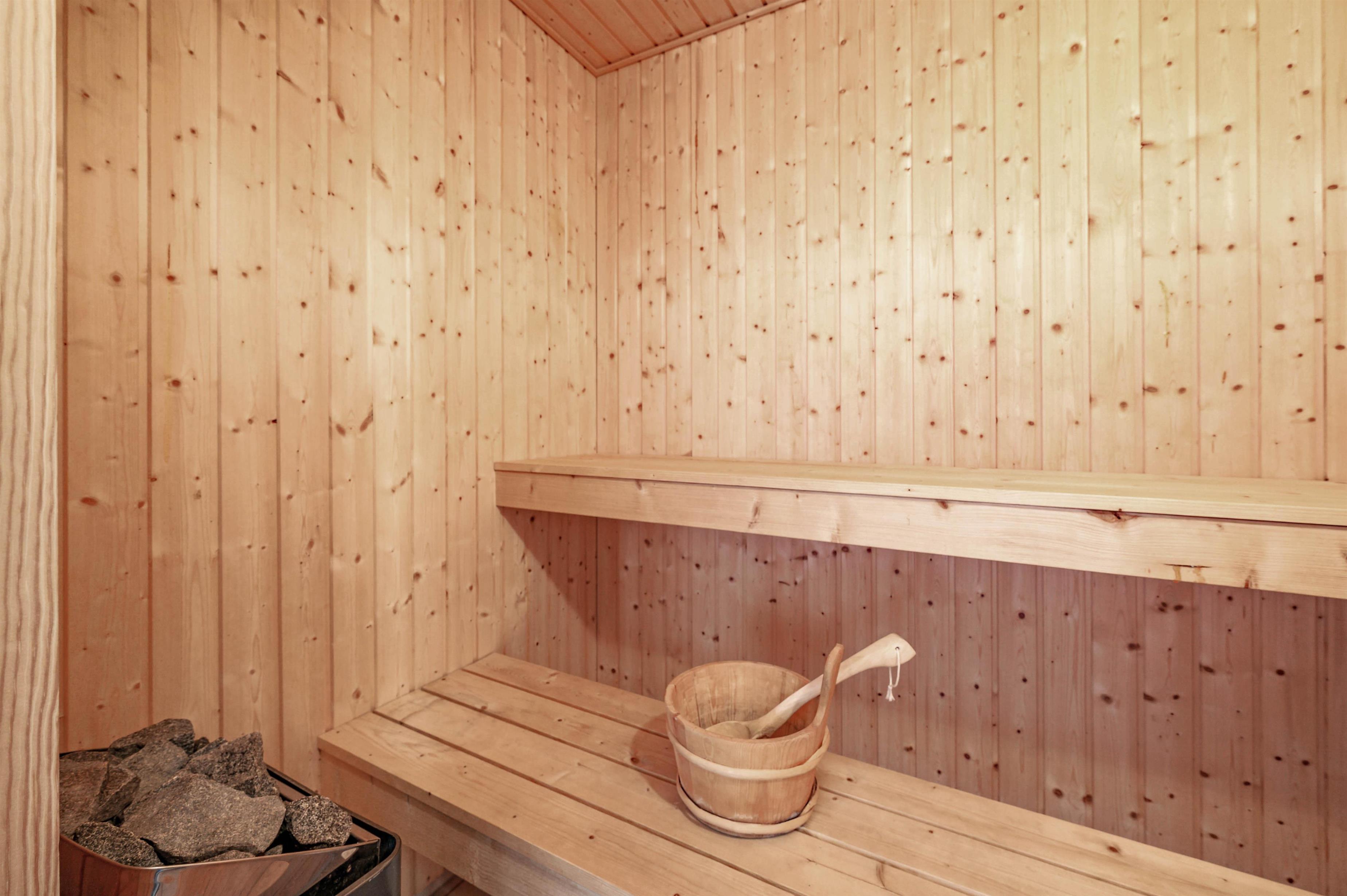 På det lyst indrettede badeværelse er der gulvvarme, og her kan I også holde en god wellnessaften. Her er nemlig både sauna og spa, som sikrer en fuldstændig følelse af velvære.