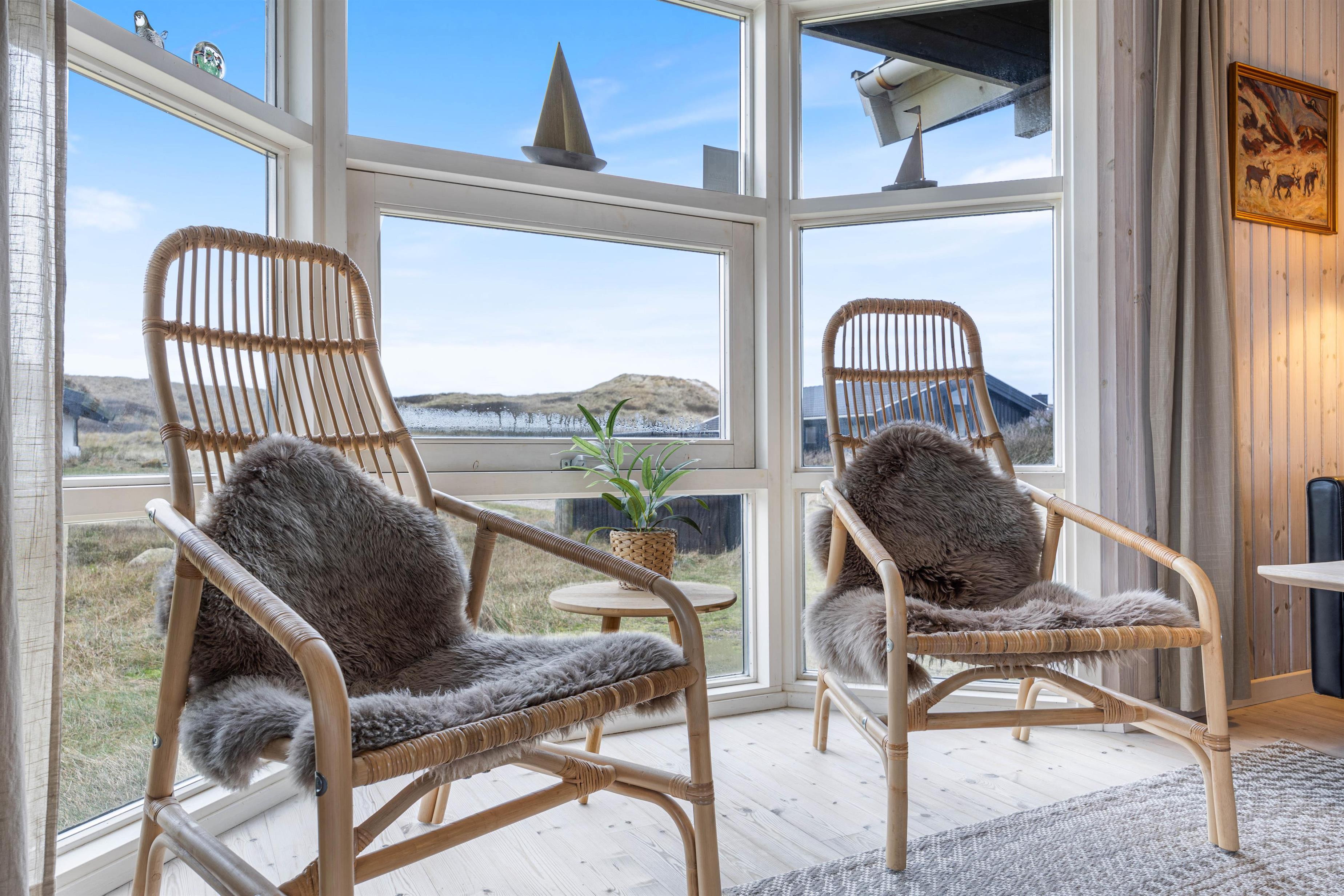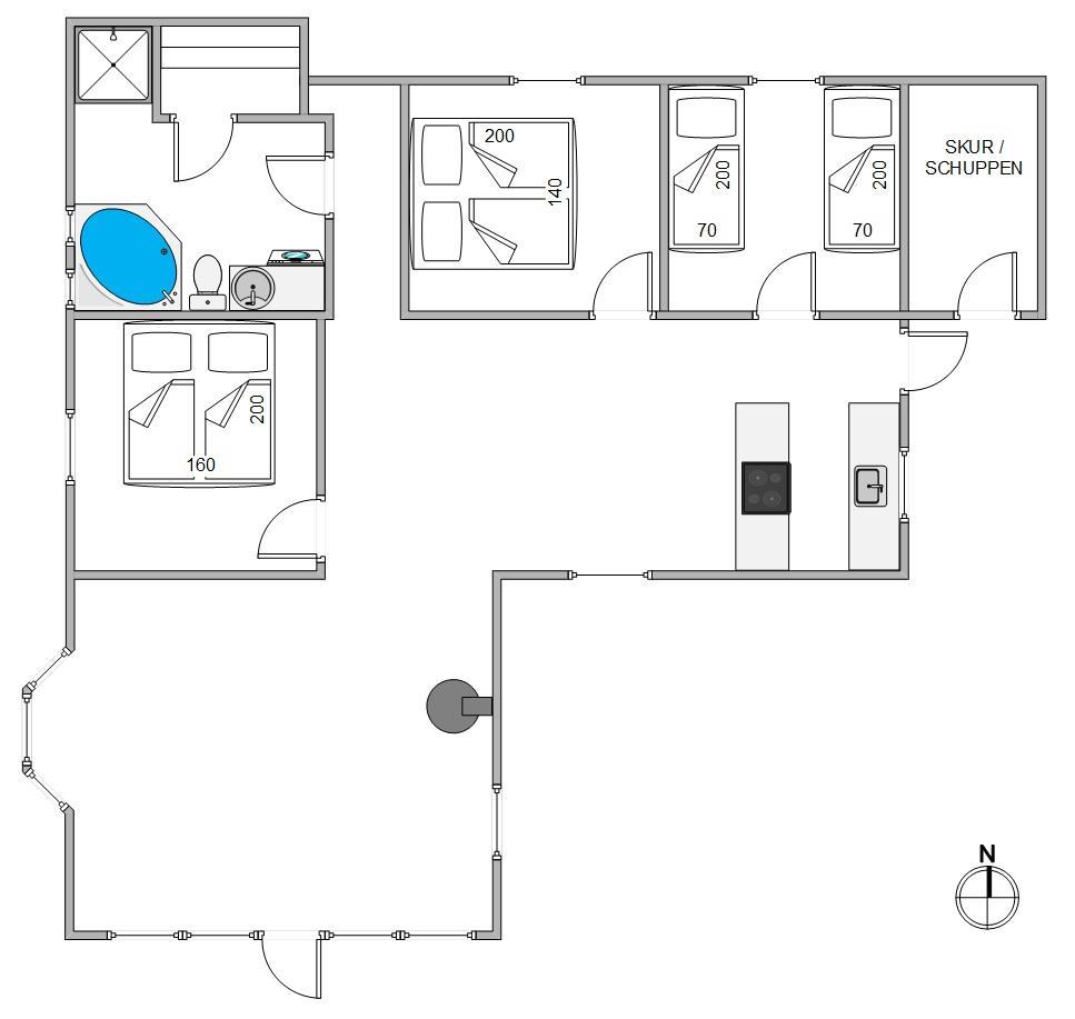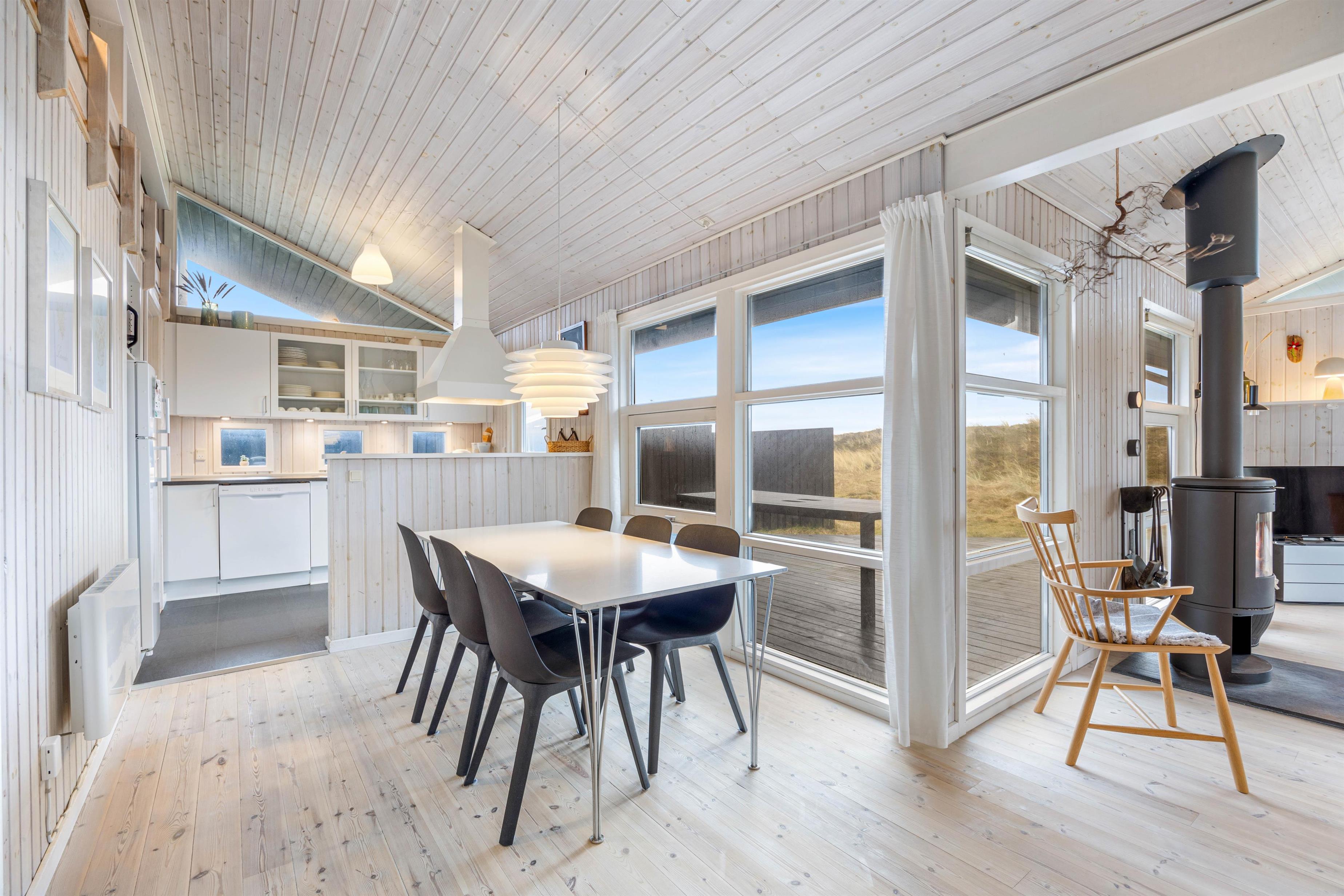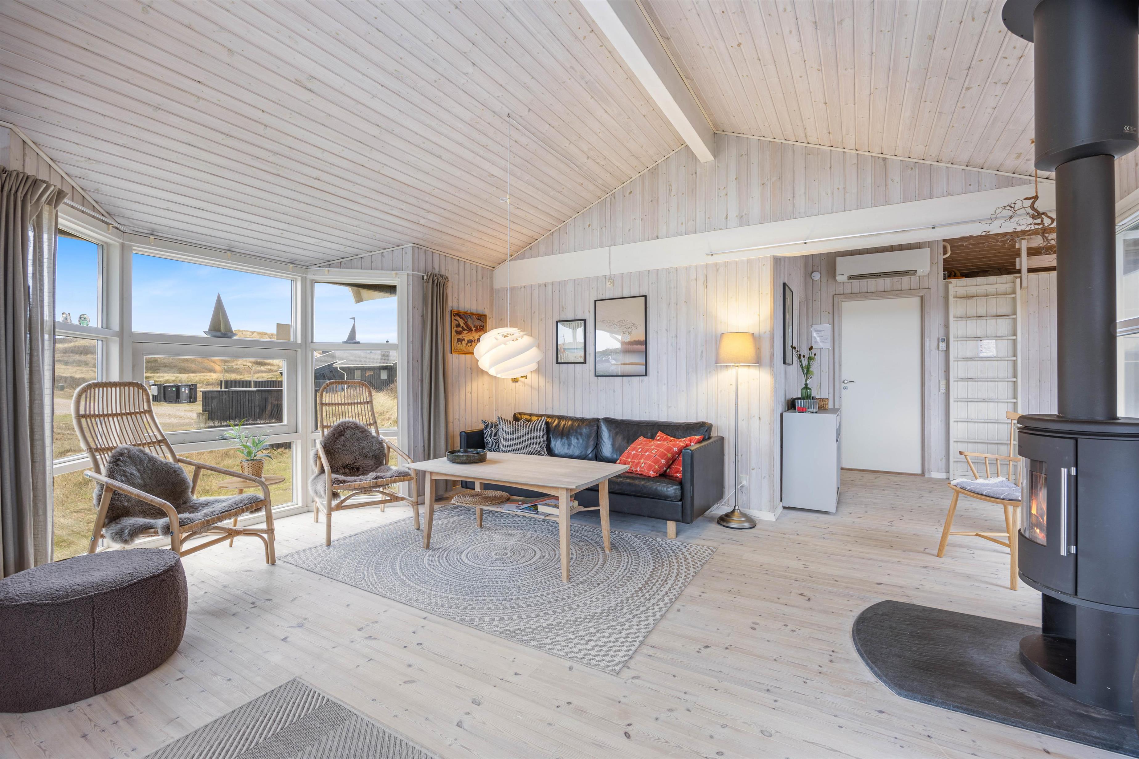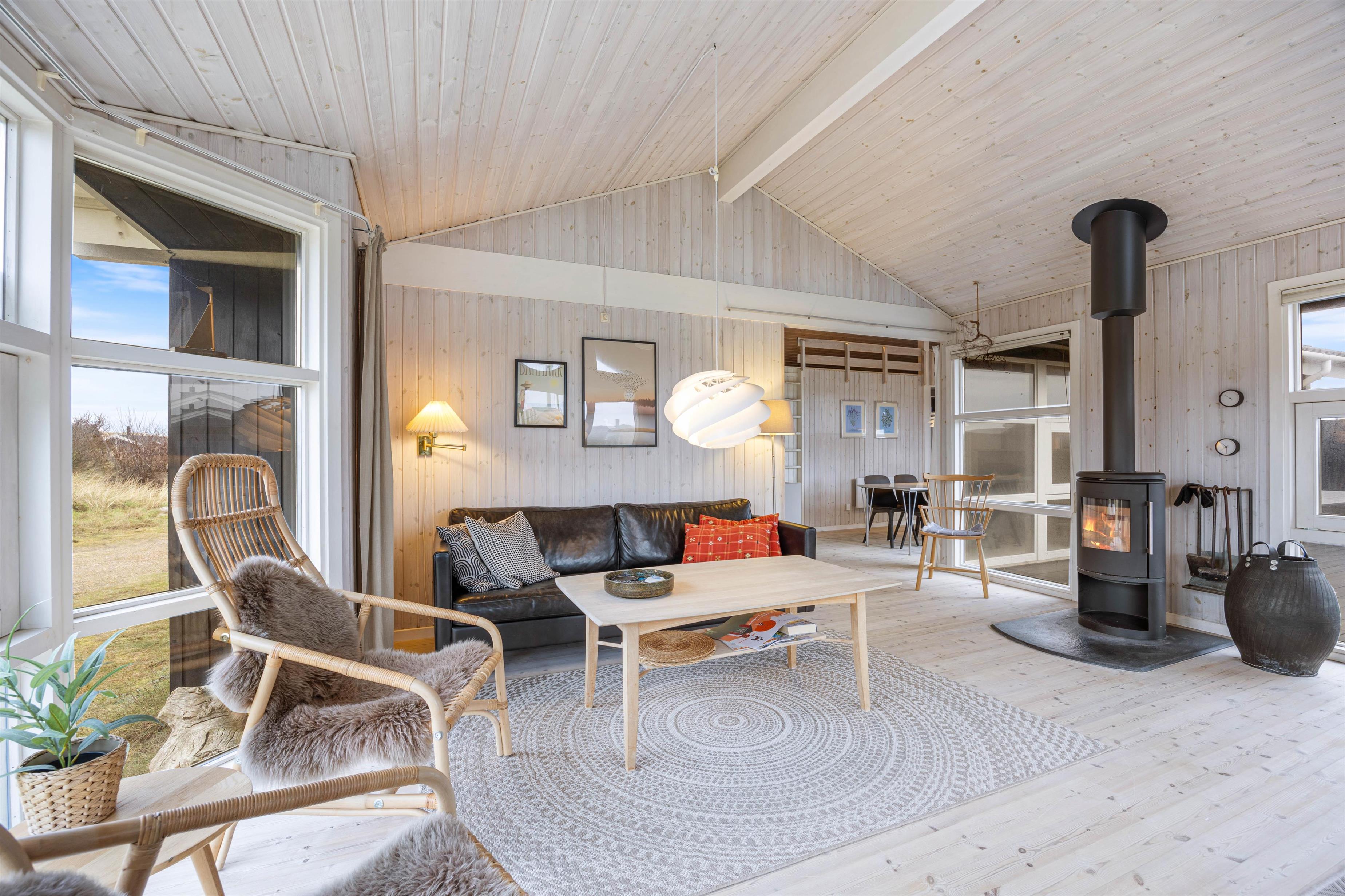 Feriehuset på 89 m2 har 3 fine soveværelser og en hems, hvor der er en ekstra madras. Her kan I hvile ud efter en dejlig dag fyldt med aktiviteter og gode stunder. Stuen er hjertet i feriehuset, og her kan I slappe af foran brændeovnen. Indretningen er lys, og dagslyset strømmer ind gennem de mange vinduer. Her er mange hyggelige kroge, hvor I kan nyde en friskbrygget kop kaffe og en god bog. Fra stuen er der åbent ud til køkkenet og spiseafdelingen, hvor I kan samles om lækre retter og gamle brætspil. Her hænger en energibesparende varmepumpe, så I hurtigt kan holde på varmen. I stuen, ved spisestuen og på alle værelser er der trægulv.