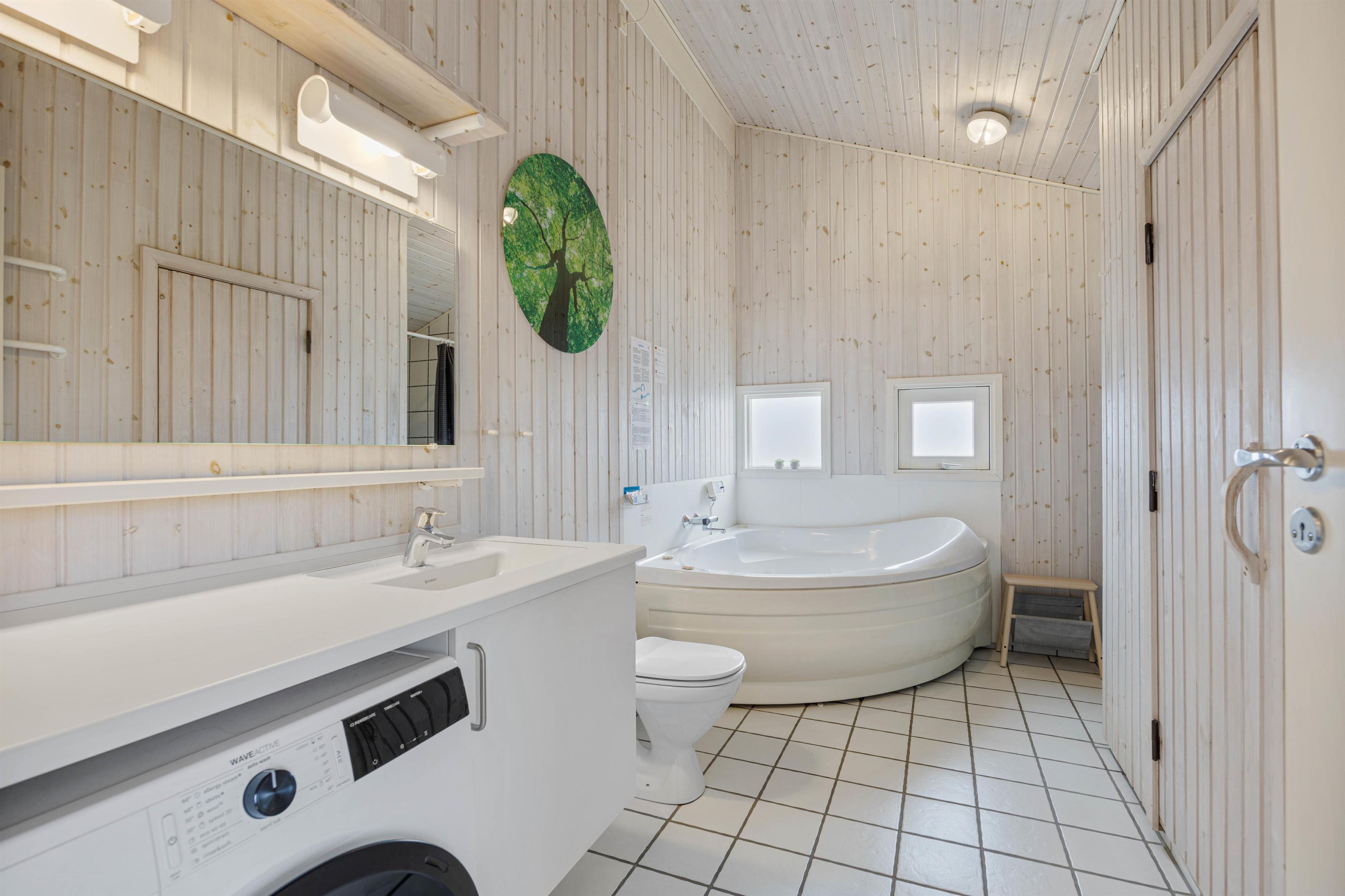 På badeværelset indbyder sauna og boblebadet til en afslappende aften efter en lang dag ved stranden. Her kan I glemme hverdagen for en stund, og på badeværelset er der installeret gulvvarme, så I ikke fryser fødderne om morgenen.