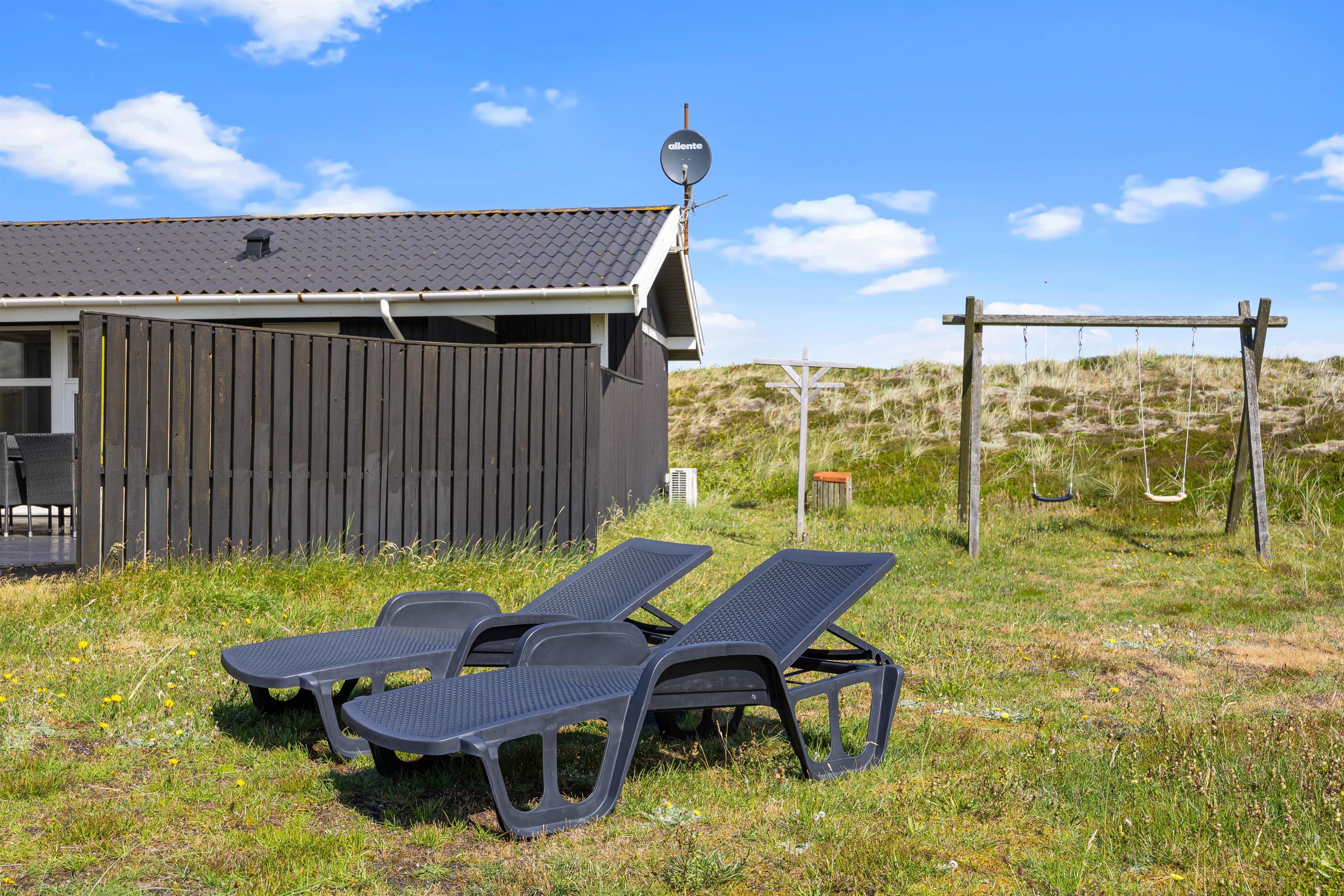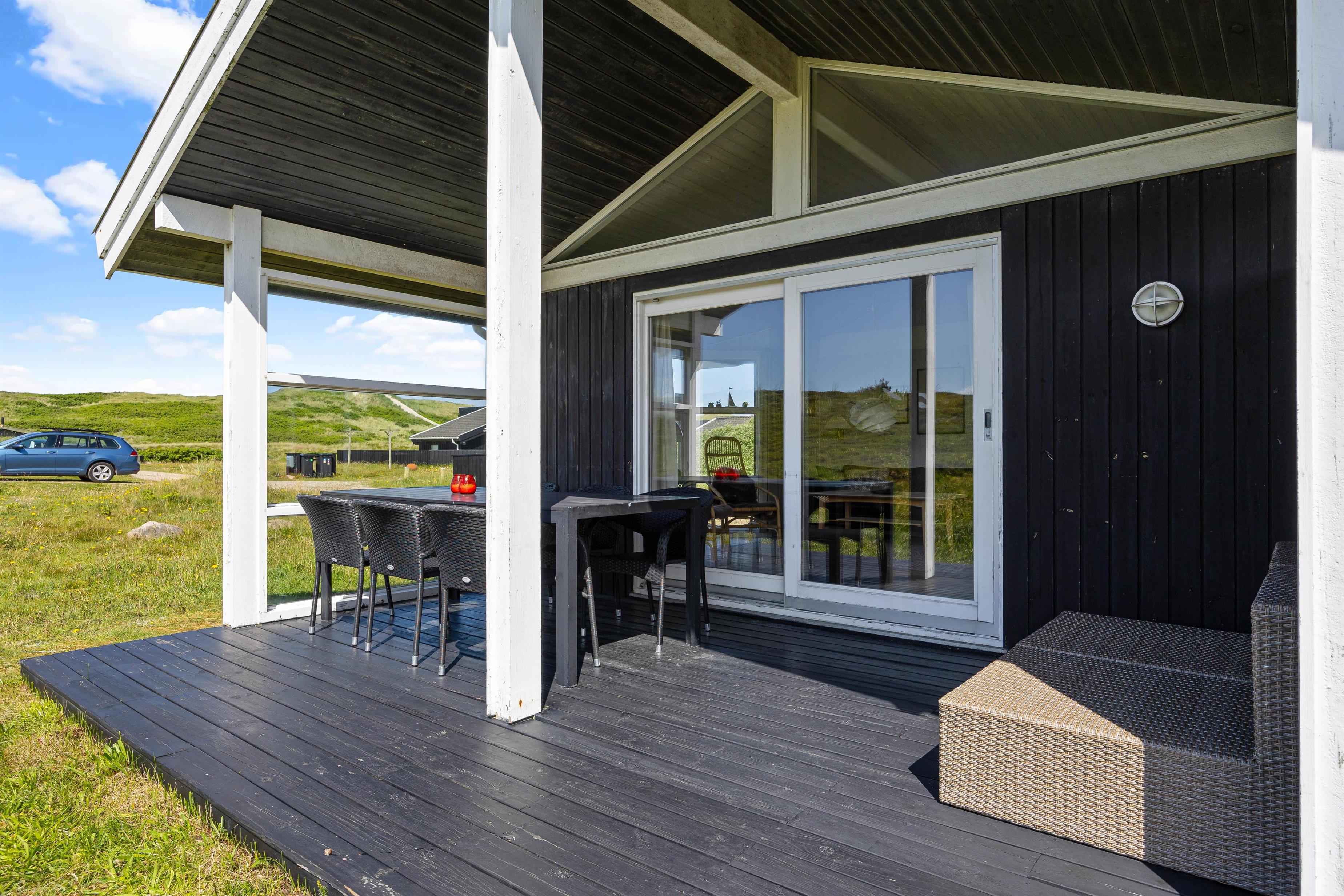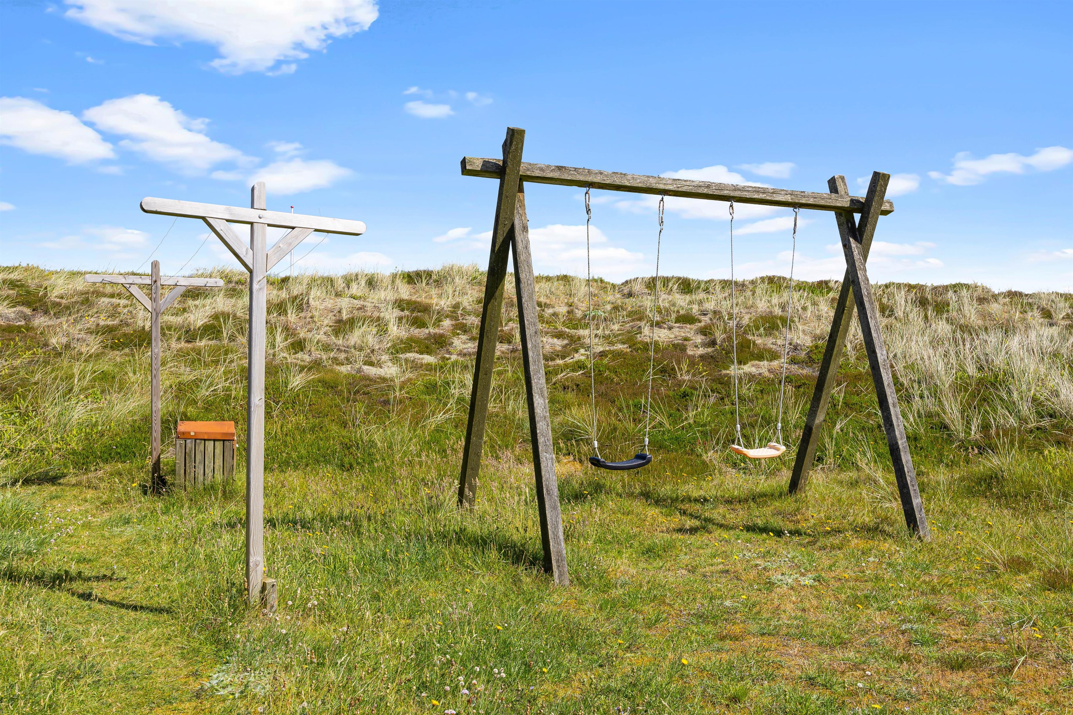 Fra stuen er der udgang til den skønne, store træterrasse. Terrassen er sydvendt og delvist overdækket, så I kan sidde i læ og nyde en lækker brunch med friske rundstykker fra den lokale købmand. Feriehuset har en kul-grill samt havemøbler og liggestole, så I har mulighed for at nyde solstrålerne. Mens der slappes af på terrassen, kan børnene lege på gyngerne. Fuldend aftenen sammen med familien og en lækker sommermenu tilberedt på grillen.