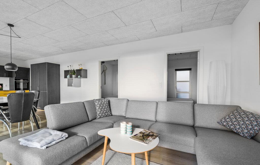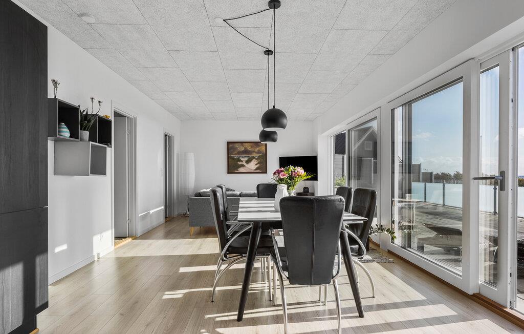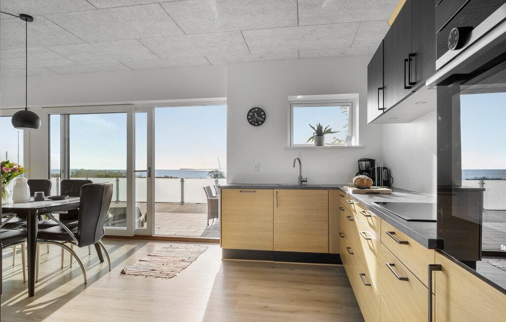 I umiddelbar nærhed af Bjert Strand imponerer jeres feriehus med sin elegante indretning, som skaber en ægte hyggelig atmosfære. I det rummelige opholdsrum med store vinduer og det åbne køkken kan I tilbringe tid sammen, hvad enten det er ved at spille spil, spise eller blot slappe af. Spisebordet giver rigelig plads til alle og inviterer jer til at nyde den fantastiske udsigt over havet. I kan også slappe af på de hyggelige siddepladser i opholdsområdet. En grillmiddag på terrassen som afslutning på dagen er en skøn måde at lade dagen ebbe ud på.
