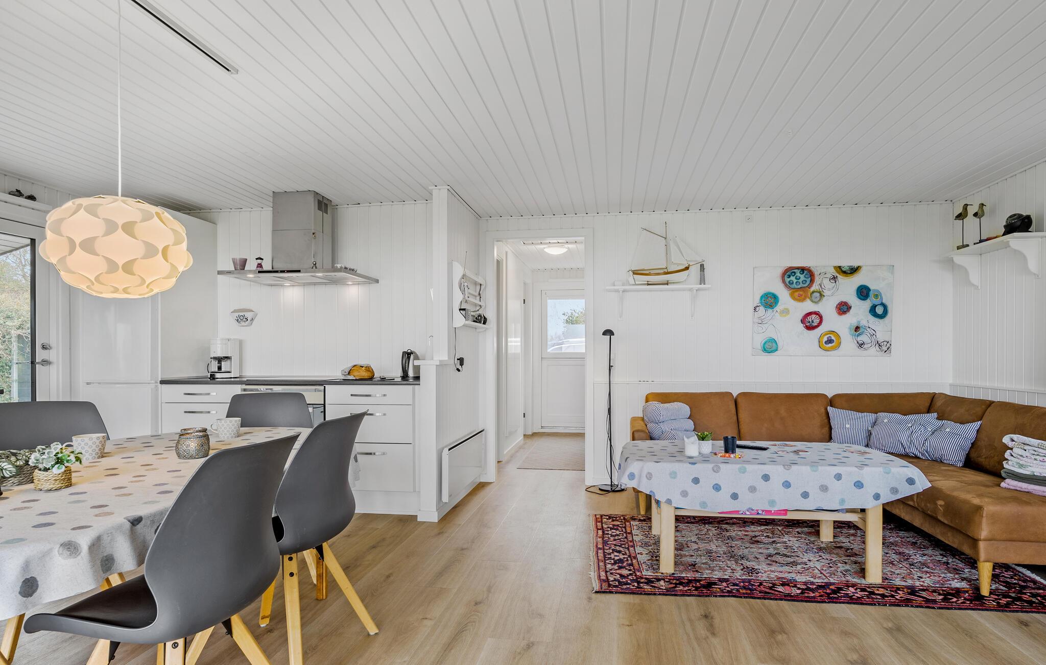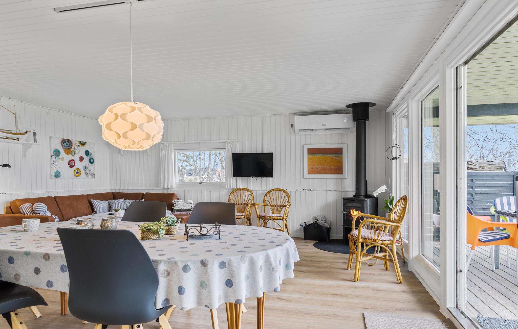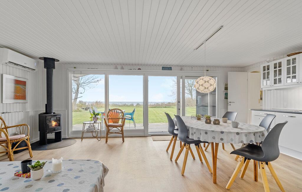Jeres feriehus, beliggende direkte ved Bjert Strand, byder på en stilfuld, åben indretning, der straks skaber en indbydende atmosfære. Den rummelige opholdsstue med store vinduer og åbent køkken indbyder til fælles stunder, hvad enten det er til spisning, spil eller blot afslapning ved den varme brændeovn. Ved spisebordet er der plads til hele familien, og I kan nyde den vidunderlige udsigt over havet. Slå jer ned i den hyggelige sofa og lad sjælen finde ro.