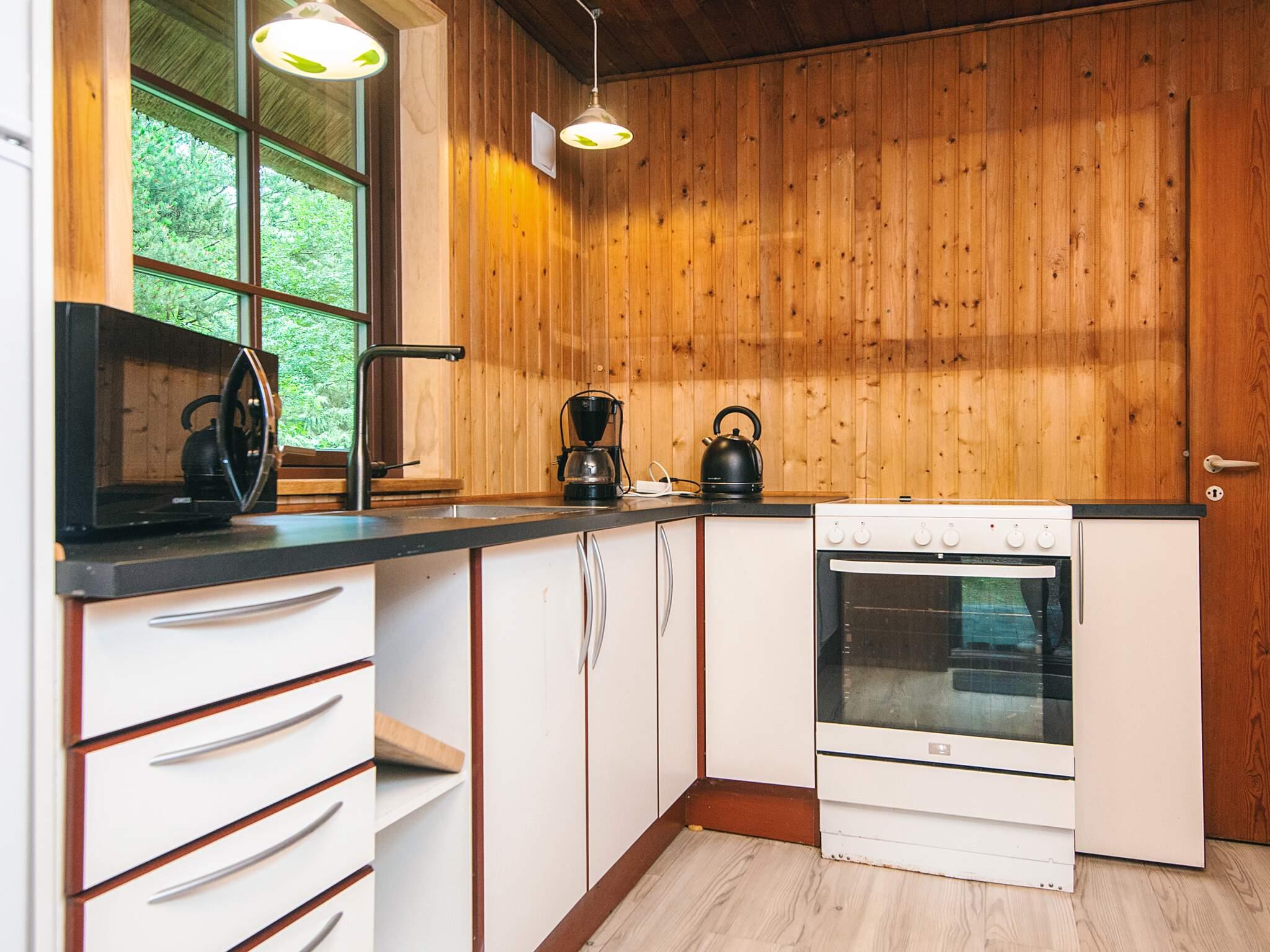 Sommerhuset er af ældre dato og indrettet efter bedste danske sommerhustradition. Stråtaget og brændeovnen understreger dette og bidrager til oplevelsen af ægte hygge. I stueplan finder I husets køkken, et værelse med dobbeltseng, toilet og bad og en opholds- og spisestue i åben forbindelse. På 1. sal er der tv-stue med et lille arbejdsbord samt et værelse med to gode køjesenge til to voksne og to børn. Huset er ikke egnet til gangbesværede eller kørestolsbrugere. Der er udgang til en mindre terrasse fra spisestuen, ligesom der er en lille platform ved husets indgang gennem køkkenet.