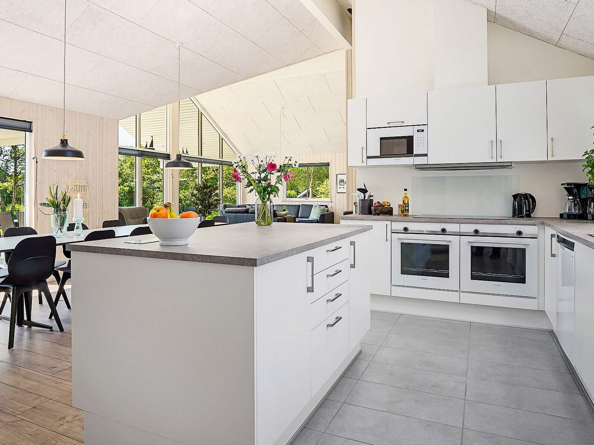 Det naturlige samlingssted er det store og arkitektonisk spændende rum med kombineret stue og køkken. Køkkenet er velindrettet, så der er ingen problemer, der kan være flere kokke og køkkenassistenter involveret i det fælles
