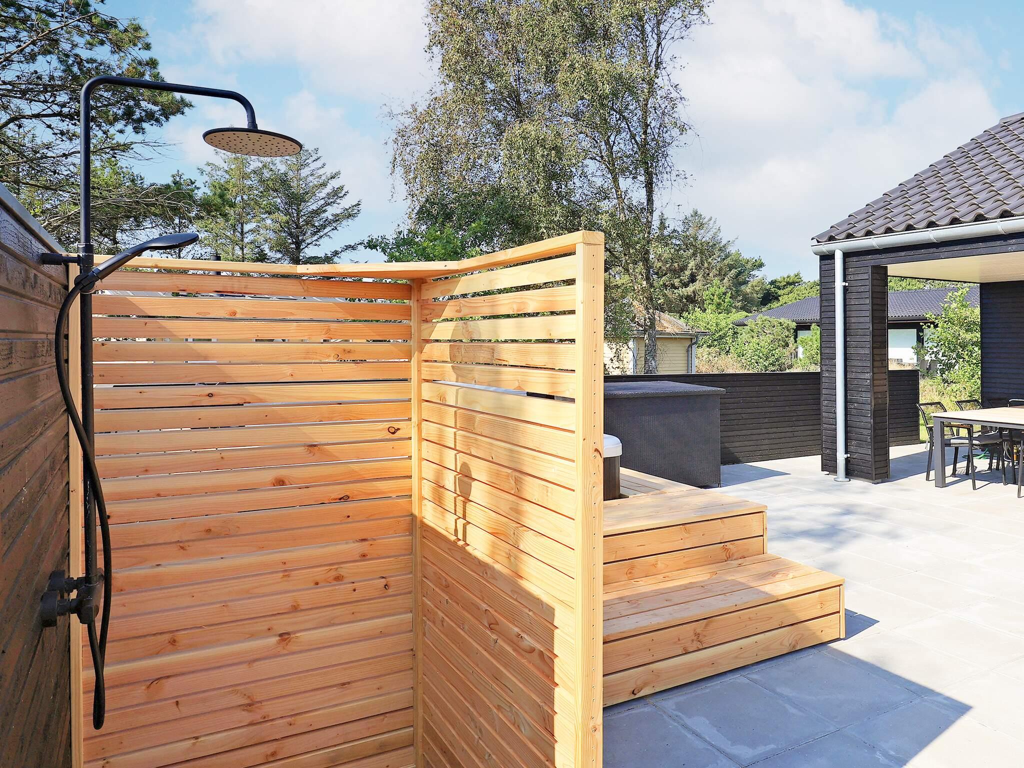 Udendørsarealerne er designet til nydelse på alle årstider. Terrassen omfatter en overdækket sektion med terrassevarmer, hvilket gør det muligt at spise eller slappe af udendørs, selv når aftenen er køligere. En indhegnet sektion sikrer privatlivets fred, og den udendørs bruser tilføjer et strejf af luksus efter en tur til stranden eller en dukkert i spabadet.