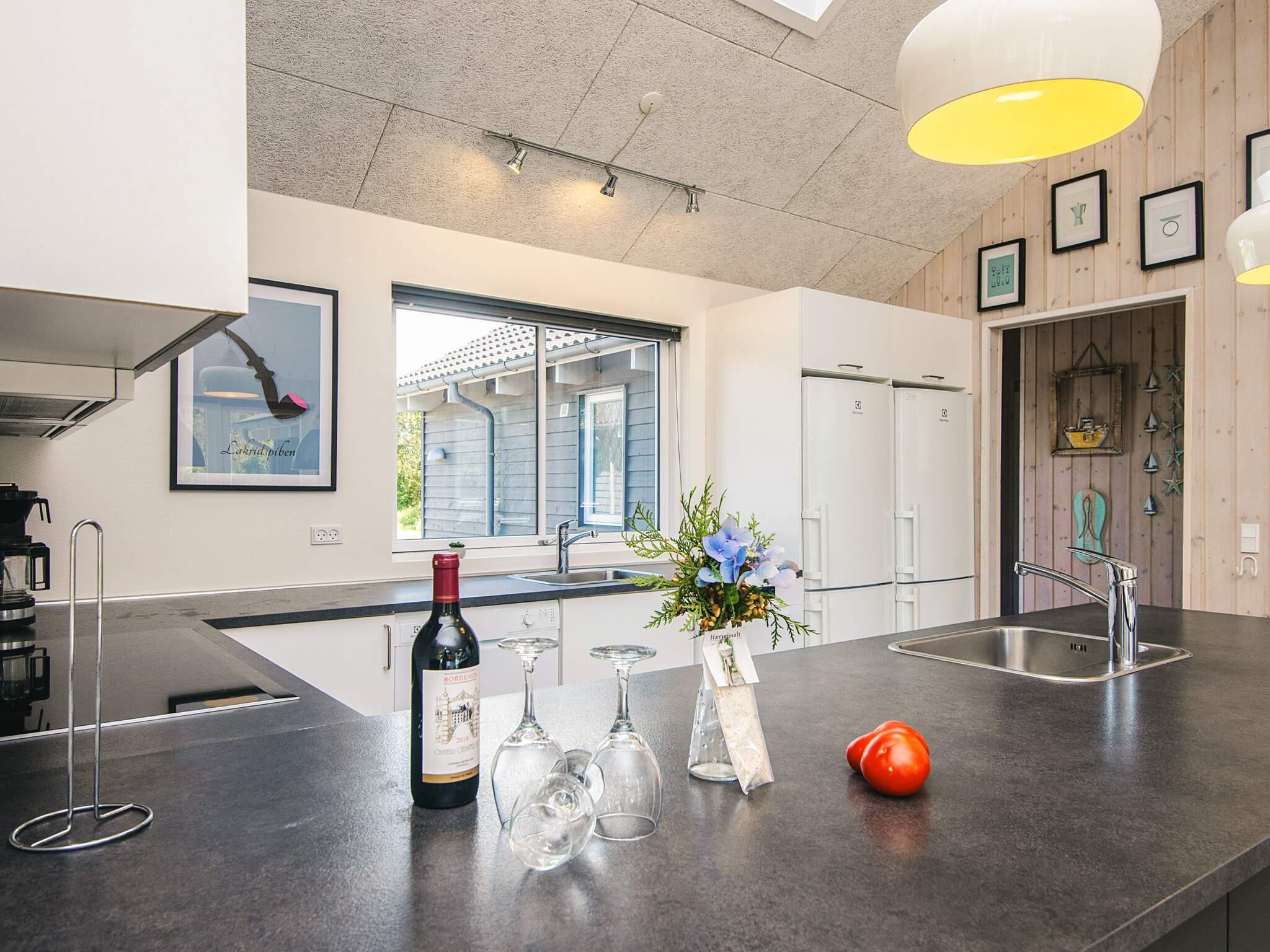 Det naturlige samlingspunkt er det store og arkitektonisk spændende rum med kombineret stue og køkken. Køkkenet er velindrettet, så der uden problemer kan være flere kokke og køkkenskrivere om den fælles madlavning. Der forefindes to ovne, to køle-/fryseskabe, et ekstra køleskab ved baren, to opvaskemaskiner, to kaffemaskiner og en stor induktionsplade. Husets tørretumbler findes også i køkkenet. Der er for dette sommerhus gjort ekstra meget ud af, at der er ekstra service til når den fine fest skal holdes. Der forefindes ekstra mange rødvinsglas, hvidvinsglas, cocktailglas, og tallerkner.