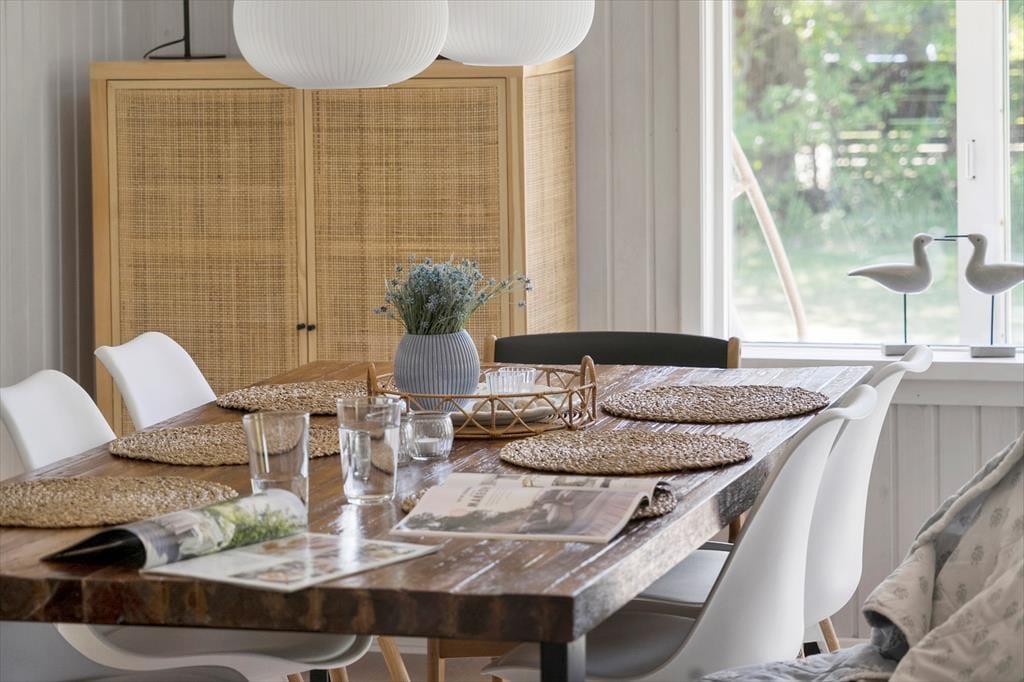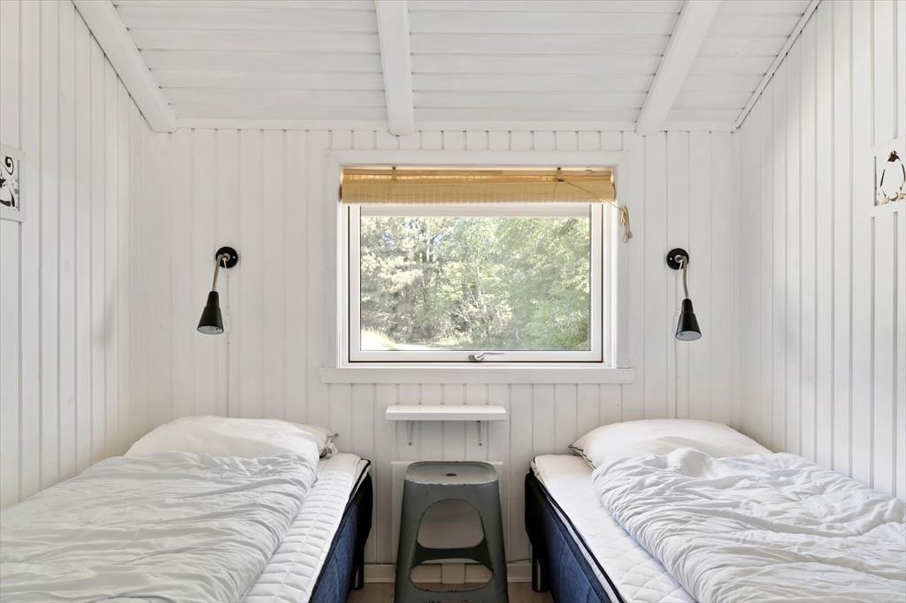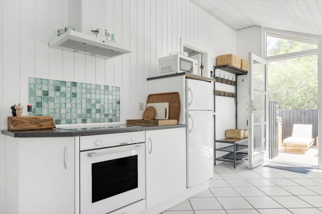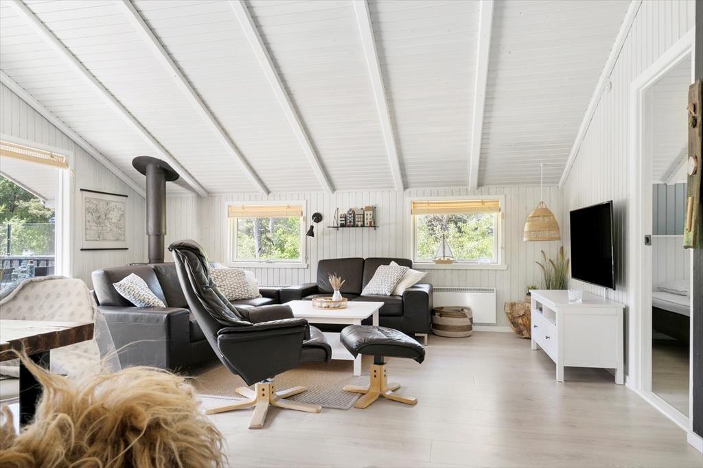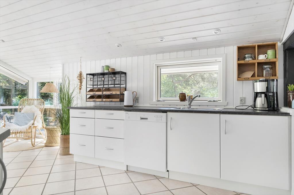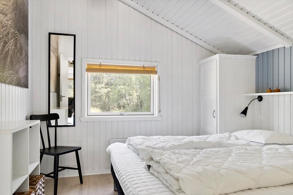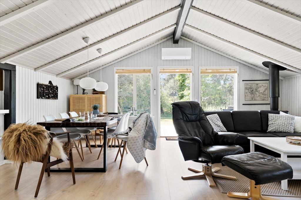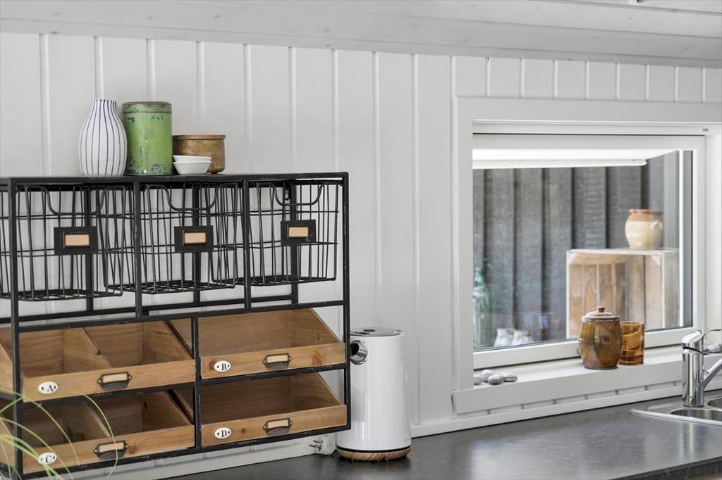 Både ude og inde præsenterer det 95 m2 store træsommerhus sig på tjekket vis. Rummenes lyse farvetoner og pæne interiør skaber en rar og indbydende atmosfære, og der er flere skønne steder at nyde livet – alt efter om I vil slappe af i nærheden af brændeovnen, kræse om maden i køkkenet eller tage en stille stund i badeværelsets topersoners spabad. Ved det store vinduesparti i køkkenet er der sågar indrettet en lille hyggekrog, hvor man kan nyde sollyset og udsigten med en varm kop kaffe eller en god bog. Når det er tid til at sige godnat, har I tre gode soveværelser at trække jer tilbage på, og hvis I får brug for at vaske tøj på ferien, er der både vaskemaskine og tørretumbler i udhuset.