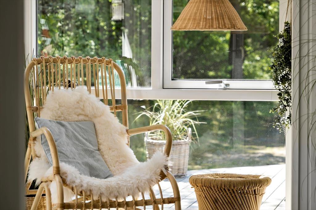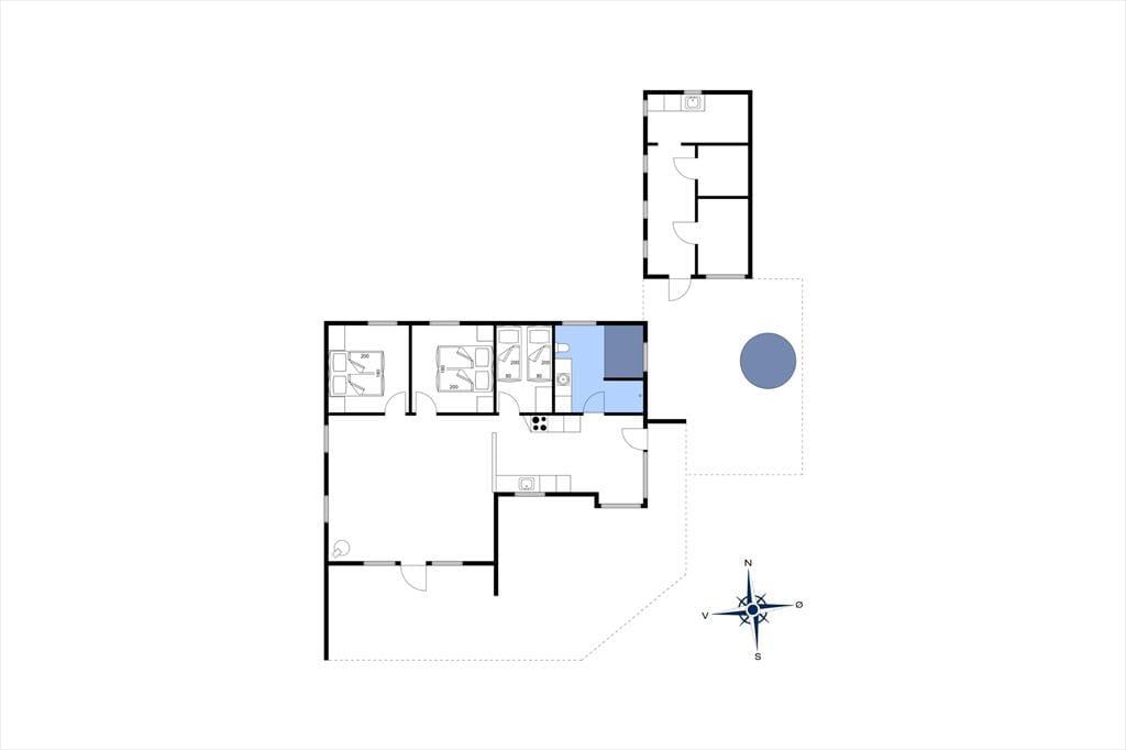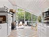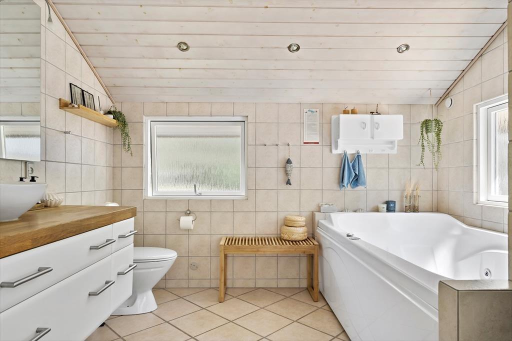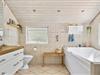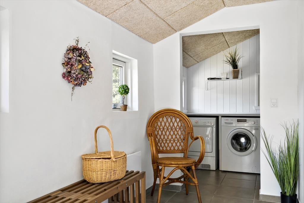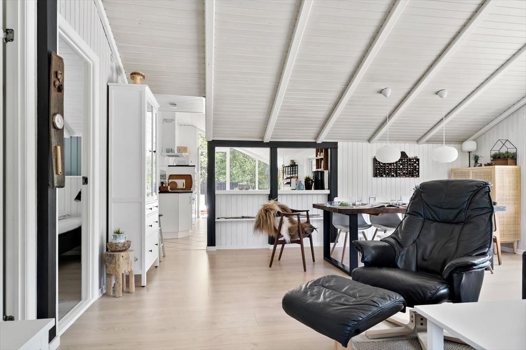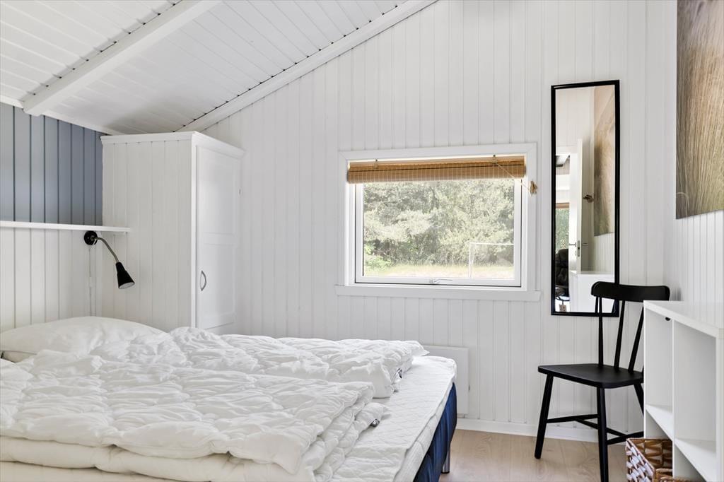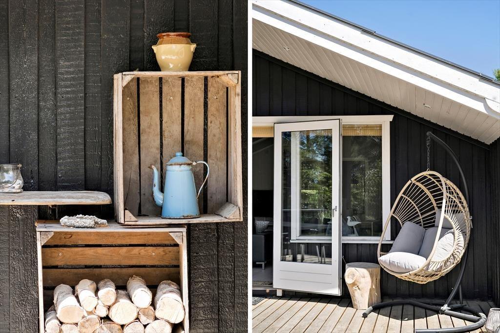 Både ude og inde præsenterer det 95 m2 store træsommerhus sig på tjekket vis. Rummenes lyse farvetoner og pæne interiør skaber en rar og indbydende atmosfære, og der er flere skønne steder at nyde livet – alt efter om I vil slappe af i nærheden af brændeovnen, kræse om maden i køkkenet eller tage en stille stund i badeværelsets topersoners spabad. Ved det store vinduesparti i køkkenet er der sågar indrettet en lille hyggekrog, hvor man kan nyde sollyset og udsigten med en varm kop kaffe eller en god bog. Når det er tid til at sige godnat, har I tre gode soveværelser at trække jer tilbage på, og hvis I får brug for at vaske tøj på ferien, er der både vaskemaskine og tørretumbler i udhuset.