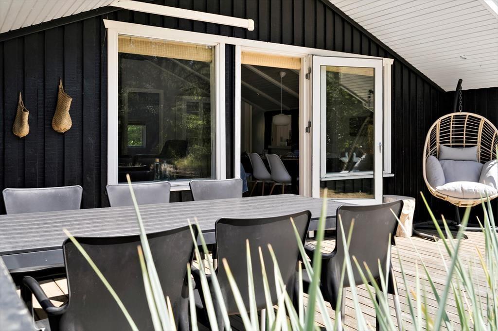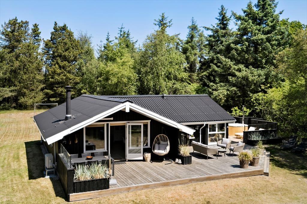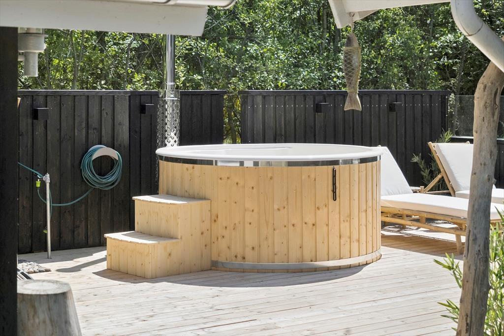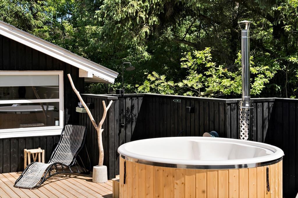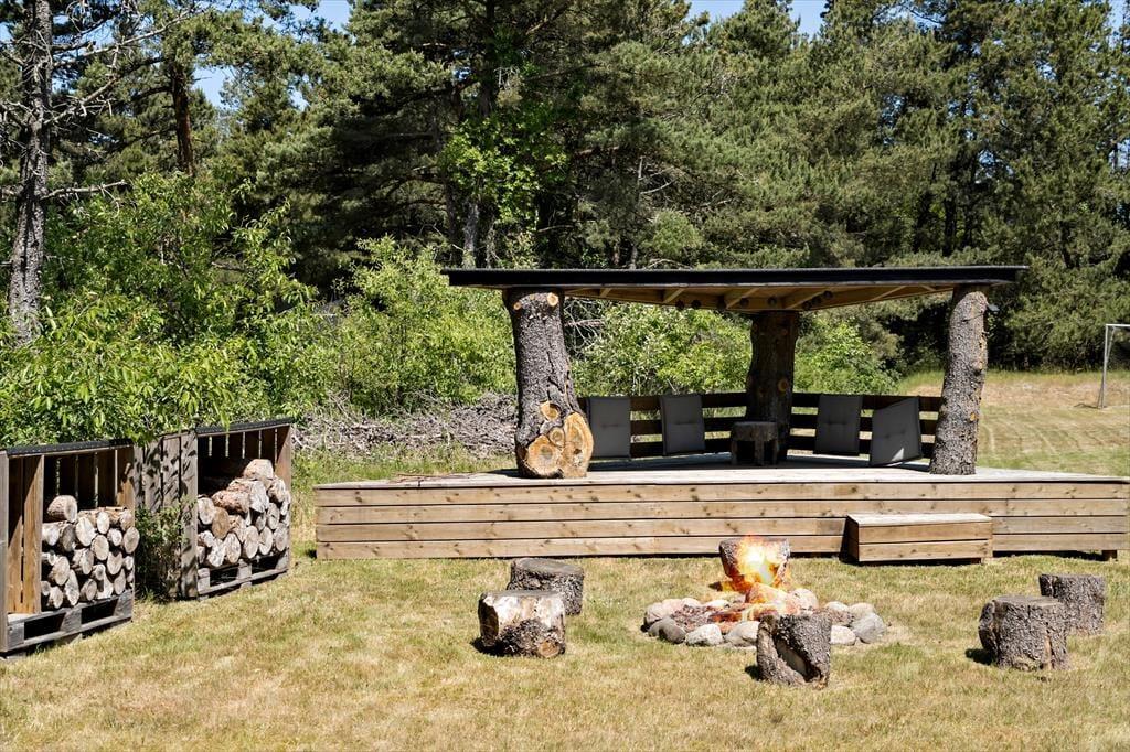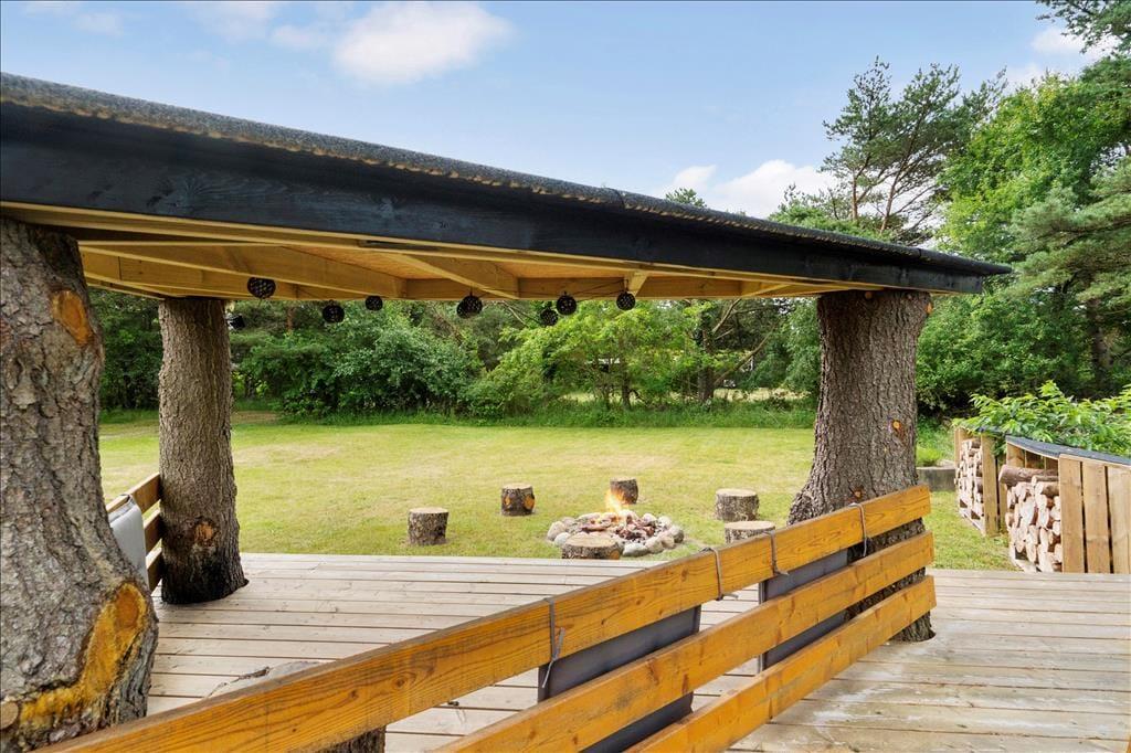 Både leg og afslapning kan oplagt finde sted på den 2658 m2 store naturgrund, der breder sig rundt om sommerhuset. En stor og delvist overdækket træterrasse er orienteret mod syd, og mod øst er der etableret et dejligt wellnessområde med vildmarksbad og udendørs bruser. Der er også anlagt et hyggeligt miljø med bålsted, og derudover har I god plads til at lege og spille bold på græsplænen.
