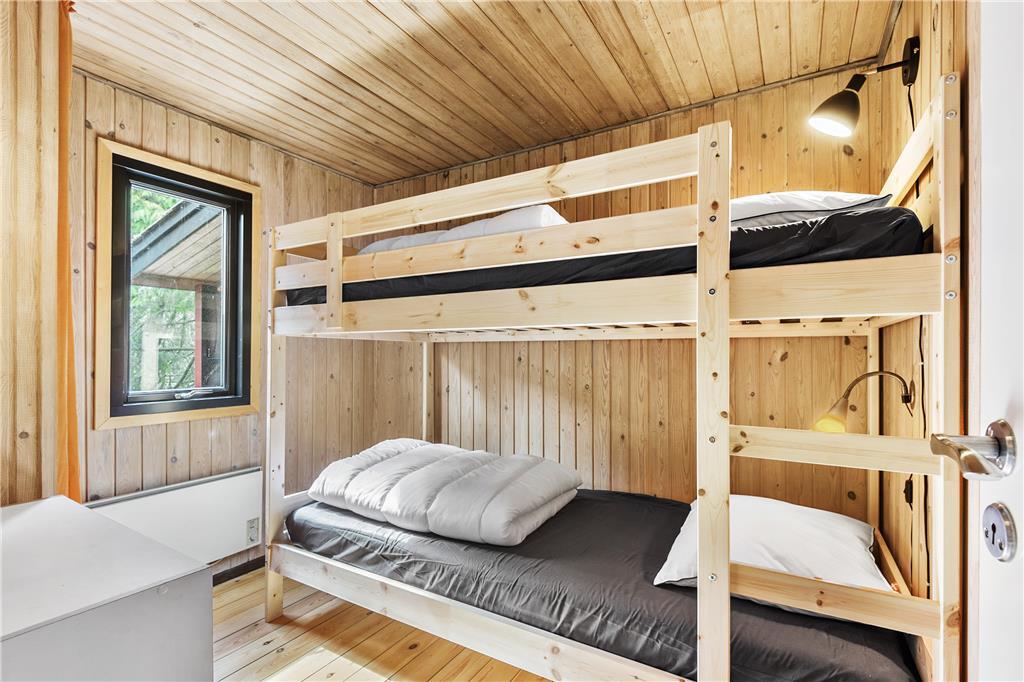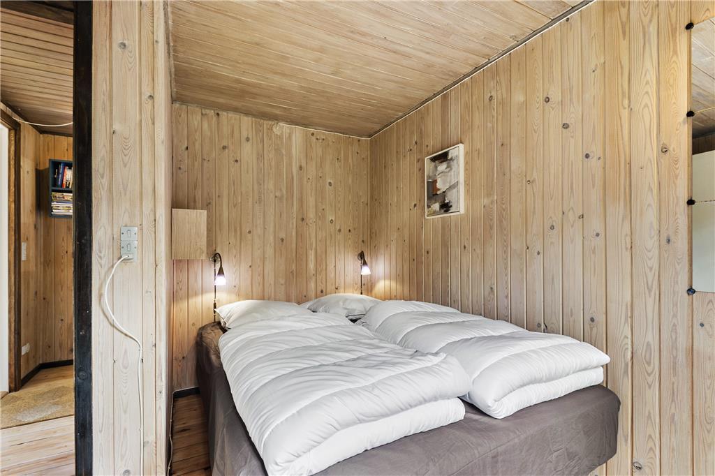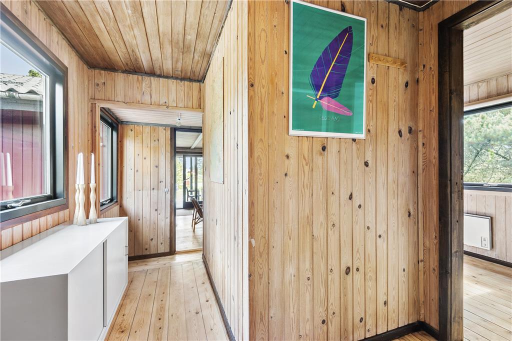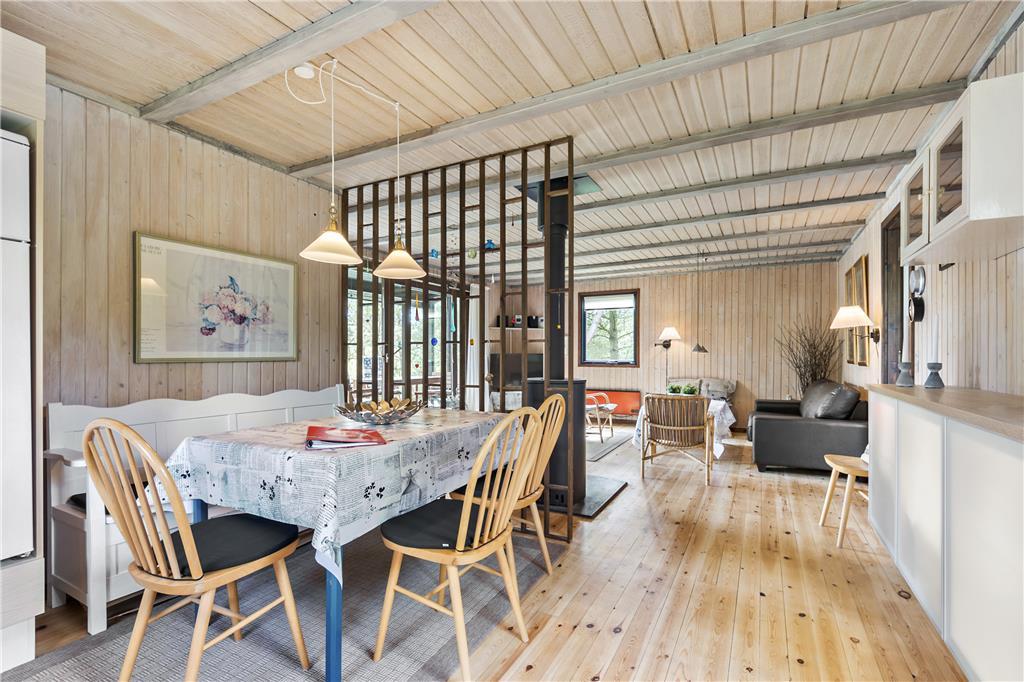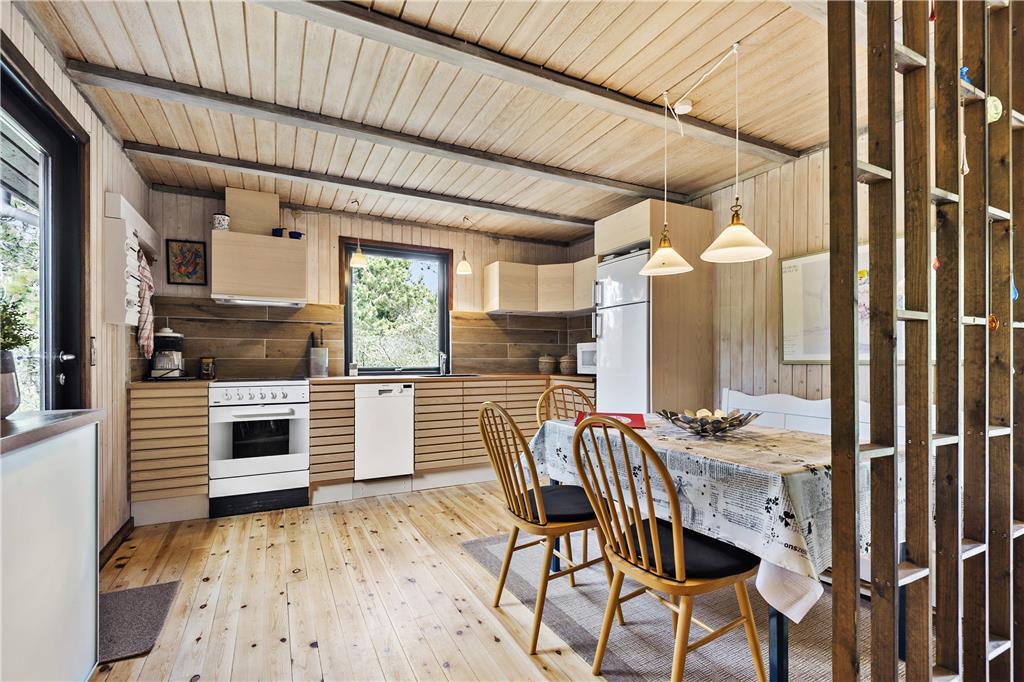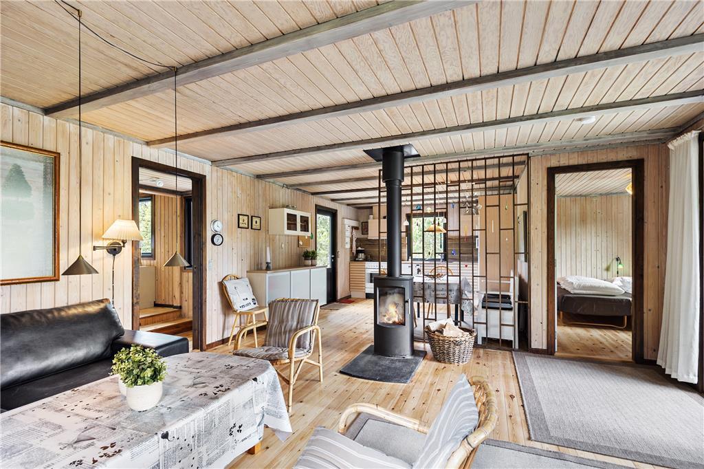 I kommer ind af døren til køkkenet, som er helt ny istandsat med et lækkert Svane køkken i lyse farver og en hyggelig spiseplads med transparent skillevæg ind til stuen. Stuen er indrettet med brændeovn og stemningsfuld sofa arrangement. Fra stuen er der direkte adgang til sydterrassen gennem den store skydedør. Der er tre rigtig gode værelser, to med dobbeltseng og et med en køjeseng, alle værelser har skabsplads. Badeværelset er ligesom køkkenet ny istandsat, det er lyst og lækkert med bruseniche og vaskemaskine.