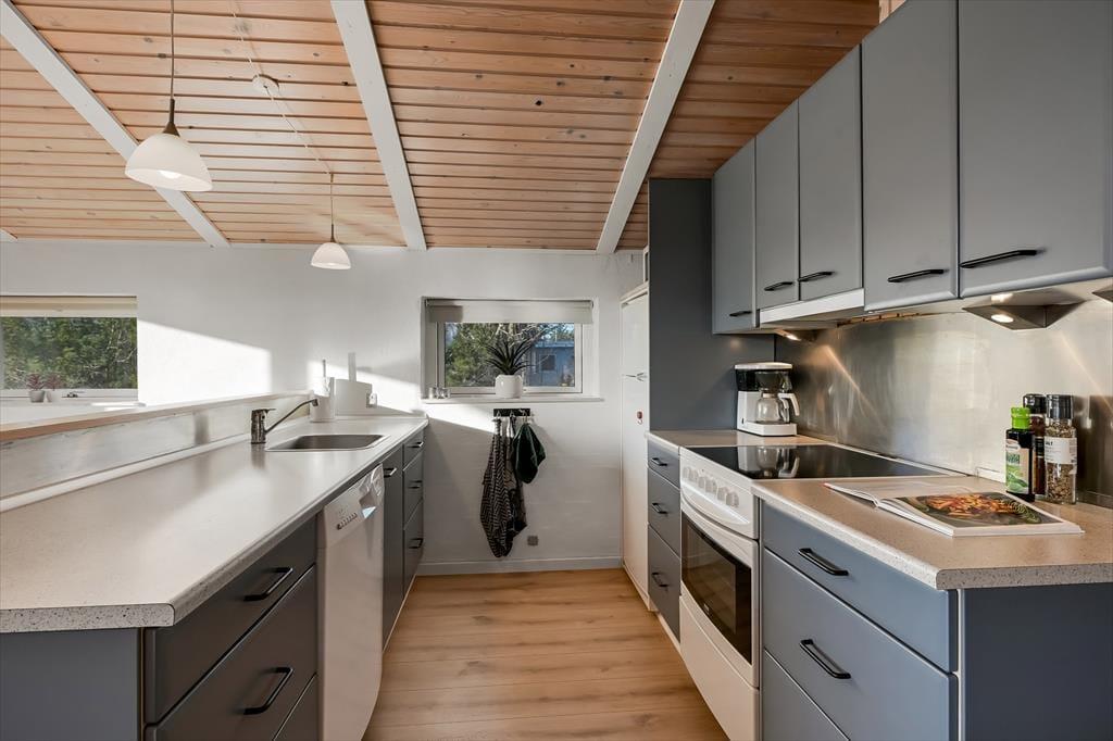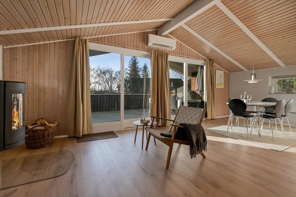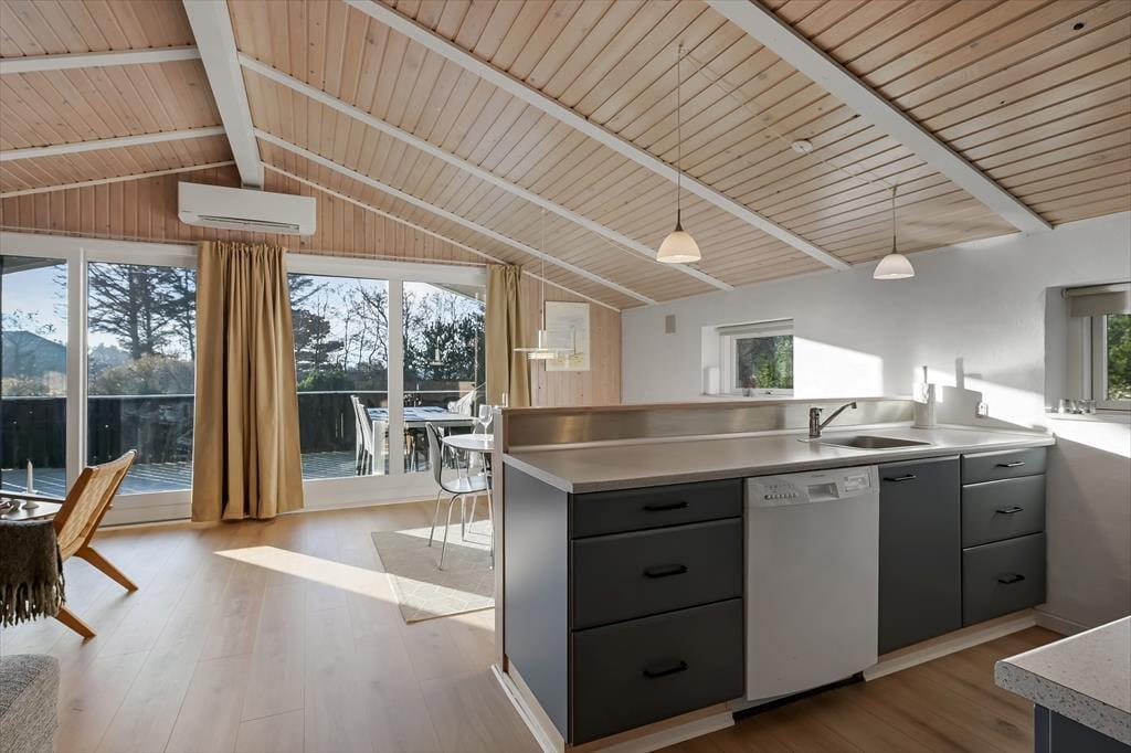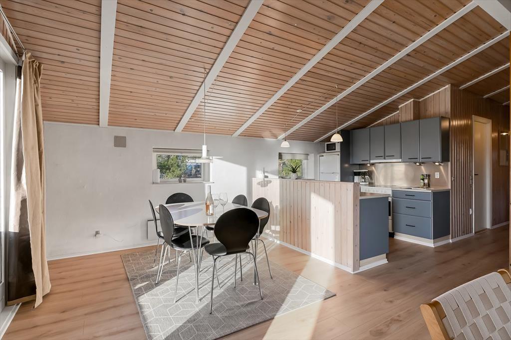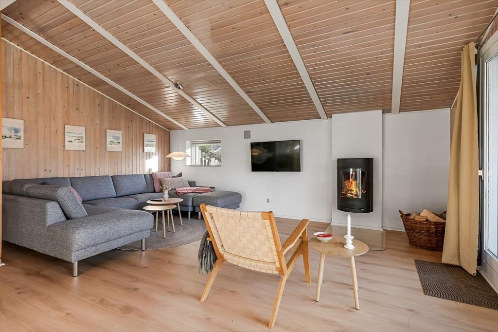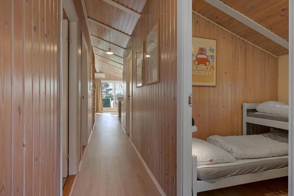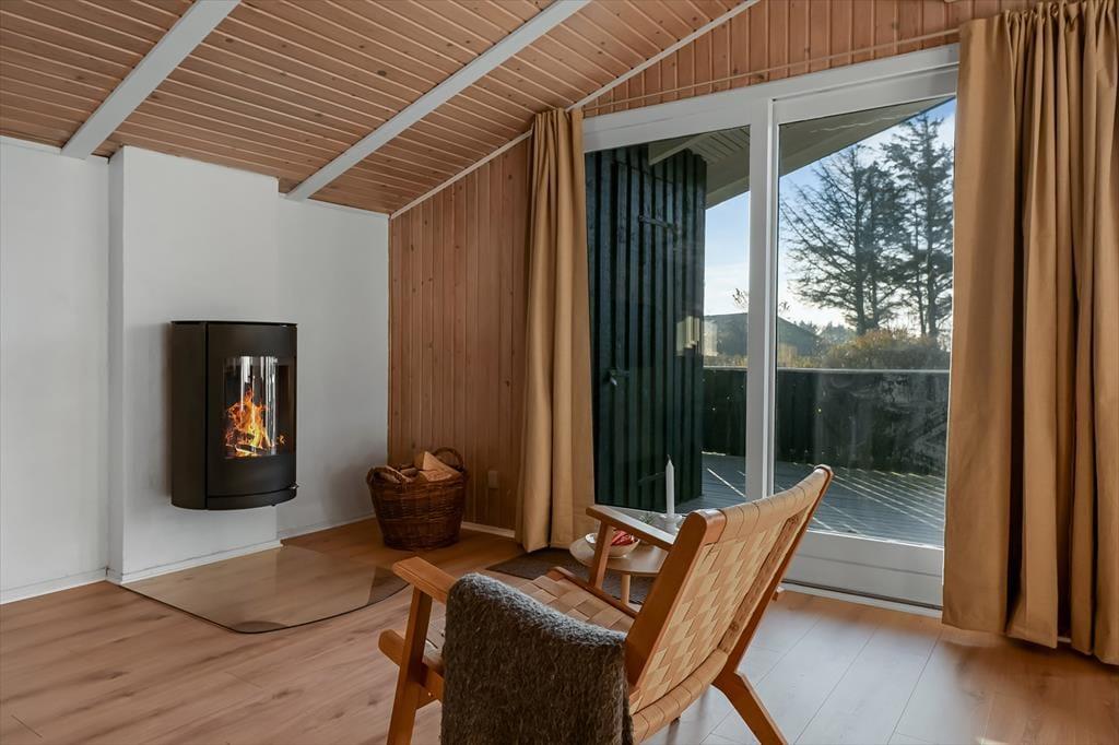 I det hyggelige alrum er der god plads til alle - det er velindrettet med spisebord, sofahjørne og brændeovn. Fra Køkken- og alrummet er der direkte udgang til den sydvendte terrasse. Fra køkkenet kan man være med i aktiviteterne, da det ligger i åben forbindelse stuen. Dejligt, lyst badeværelse med bruser og sauna. Der er 2 soveværelser med dobbeltsenge og et køjerum med plads til to. Det er muligt at tilslutte egen billader til huset.