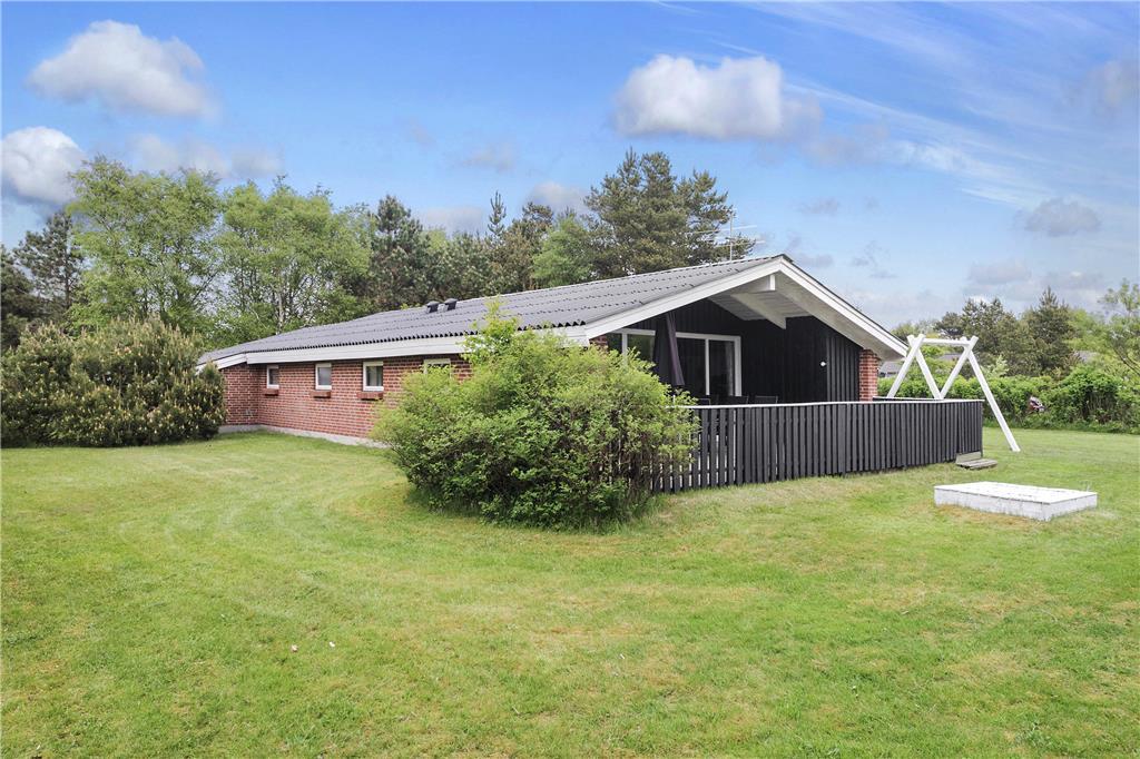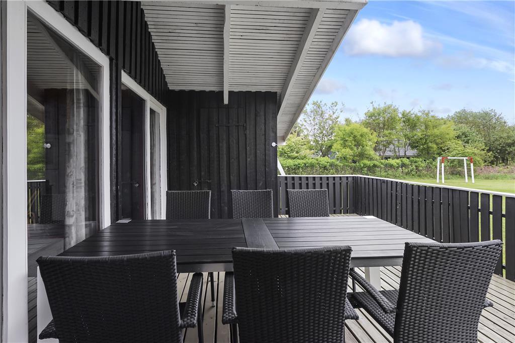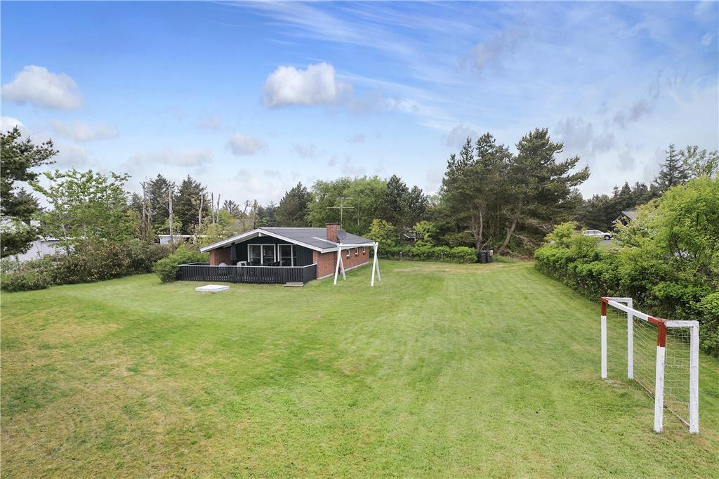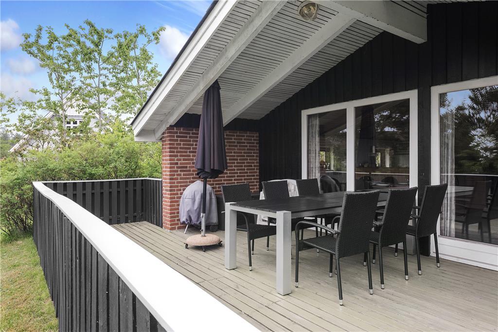 Huset ligger på en stor grund med masser af plads til udendørsaktiviteter. Her er både gynge, sandkasse til glæde for børn. Den dejlige terrasse er delvis overdækket og med udsyn over haven.