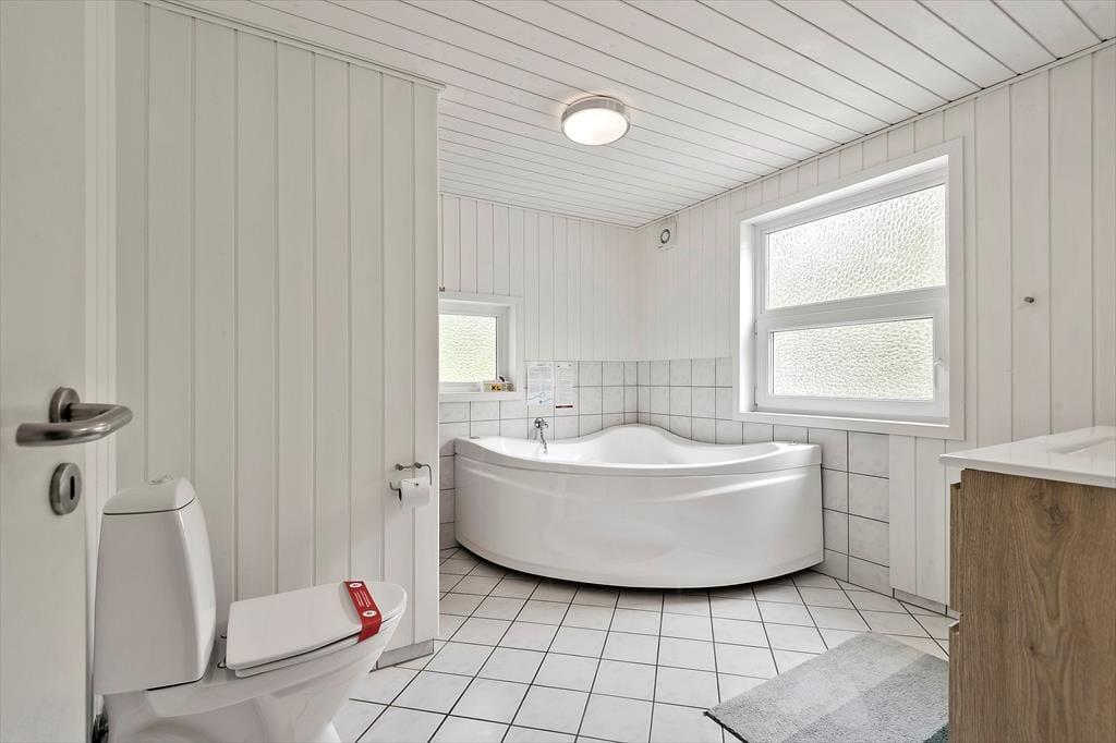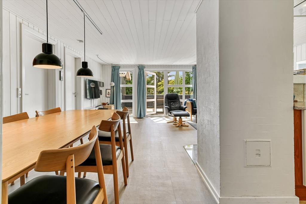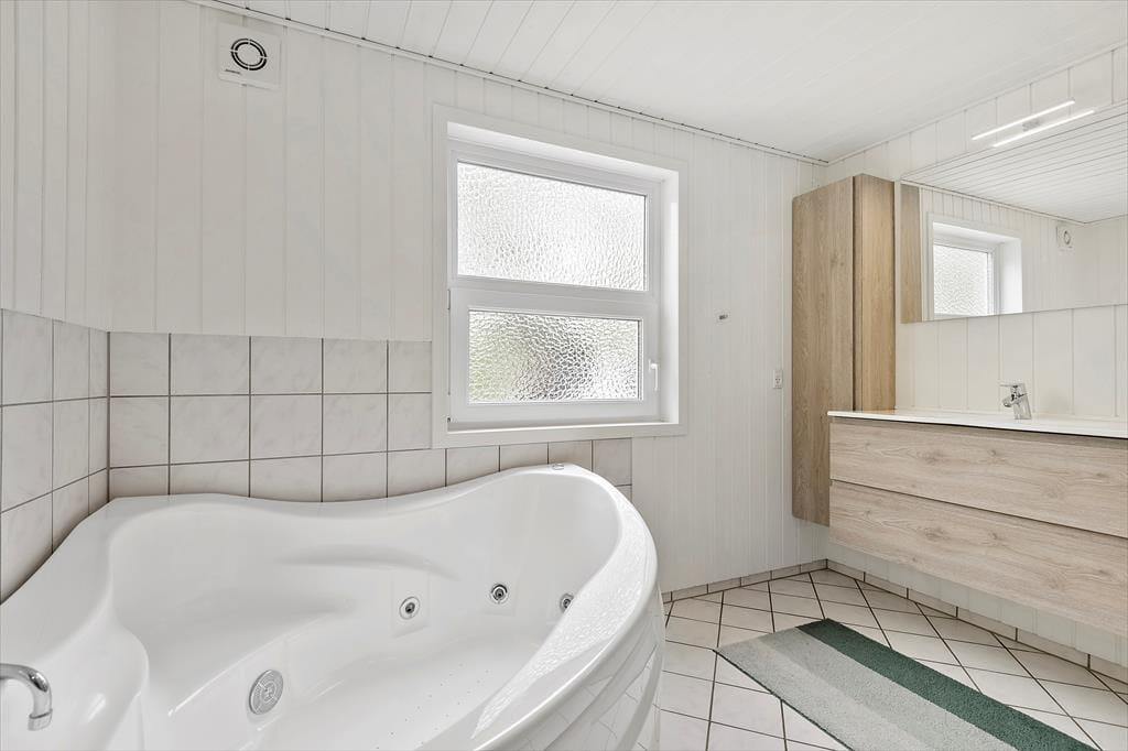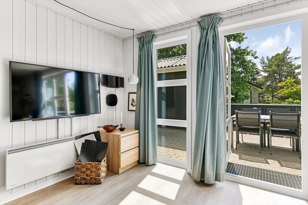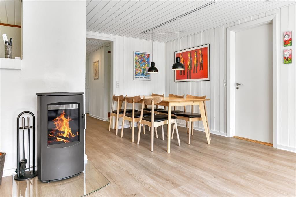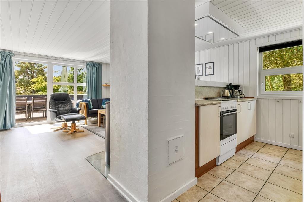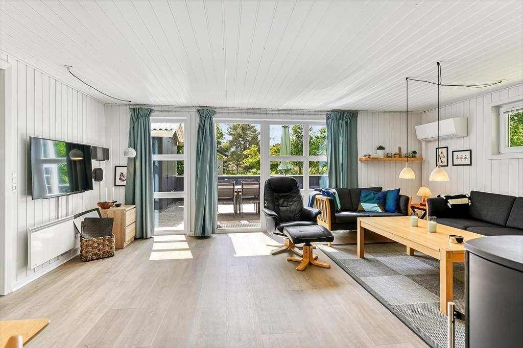 Dette sommerhus har alt hvad I skal bruge til en god ferie. Der er et stort køkkenalrum/stue med god plads til 6 personer, her er spiseplads, en dejlig stue med brændeovn hvorfra der er direkte udgang til den lukkede terrassen. I huset er der tre gode dobbelt værelser med skabsplads. Der er to badeværelser med brus, i det ene er også spa og sauna. Entréen er indrettet med vask, tørretumbler og vaskemaskine.