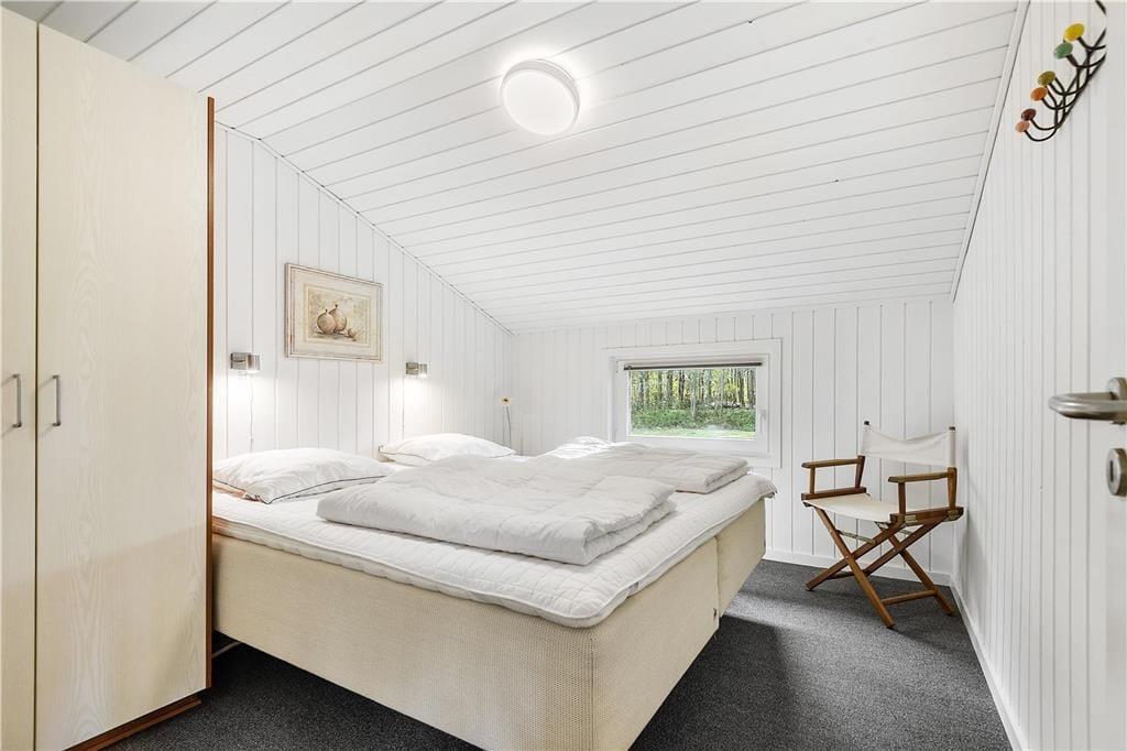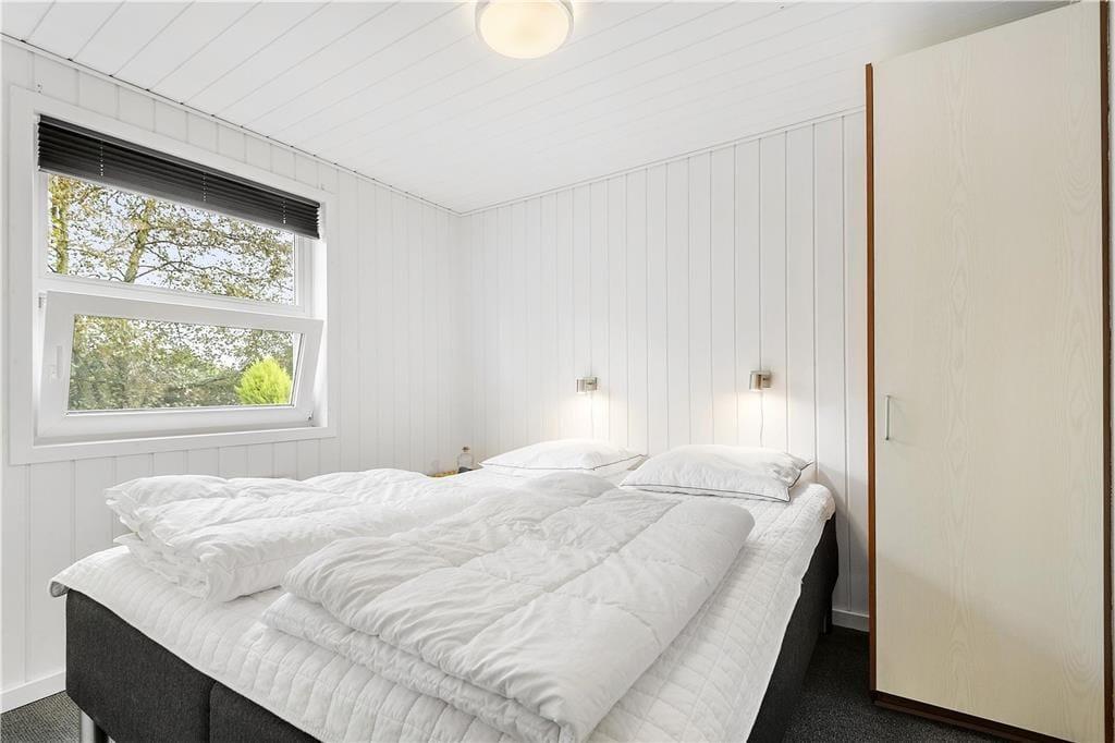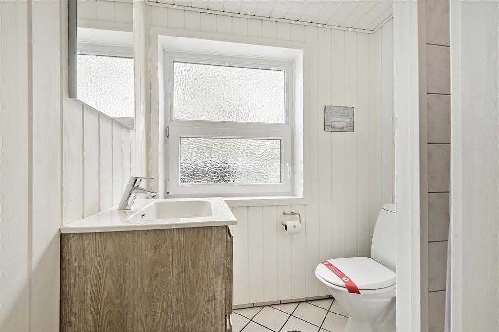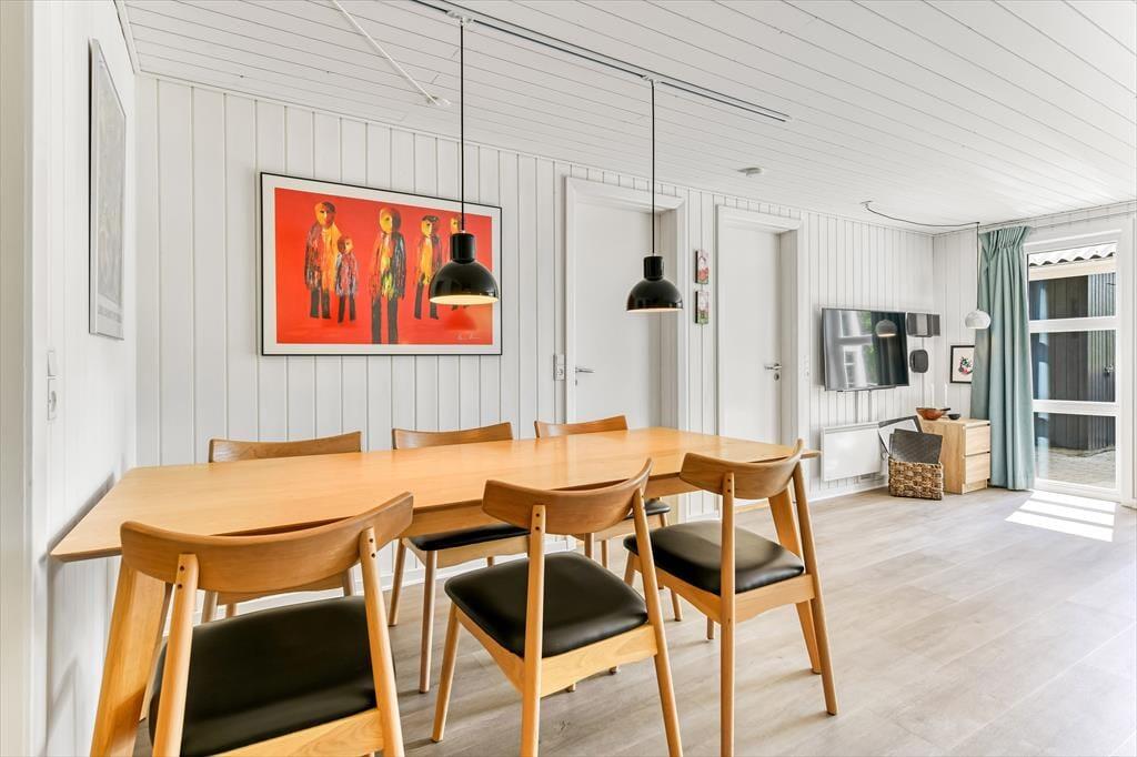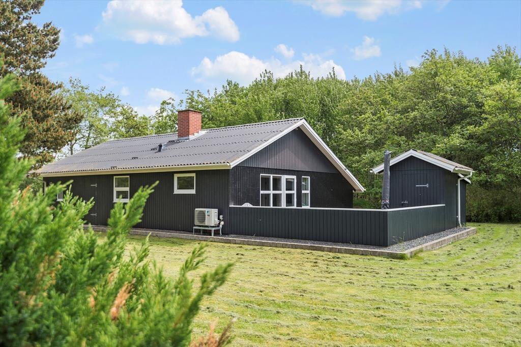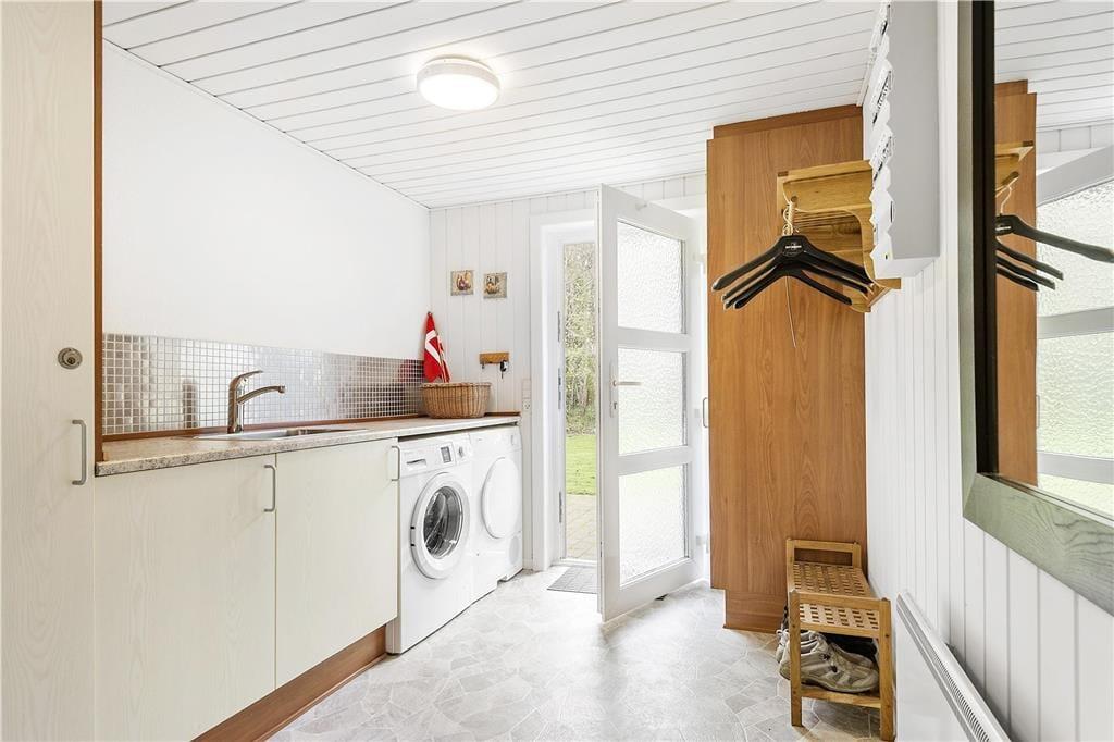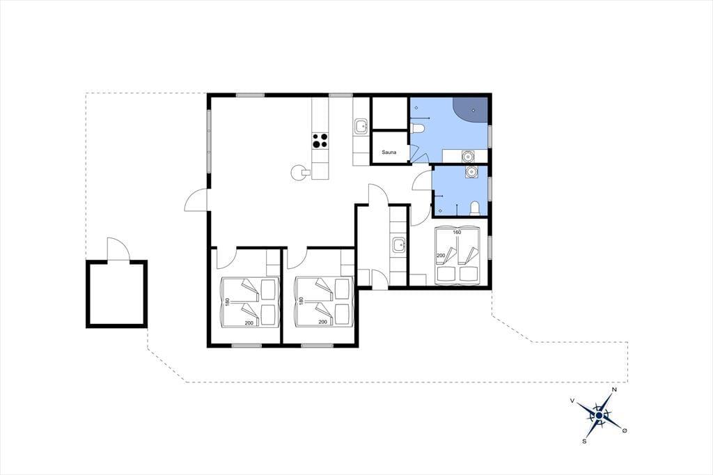 Dette sommerhus har alt hvad I skal bruge til en god ferie. Der er et stort køkkenalrum/stue med god plads til 6 personer, her er spiseplads, en dejlig stue med brændeovn hvorfra der er direkte udgang til den lukkede terrassen. I huset er der tre gode dobbelt værelser med skabsplads. Der er to badeværelser med brus, i det ene er også spa og sauna. Entréen er indrettet med vask, tørretumbler og vaskemaskine.