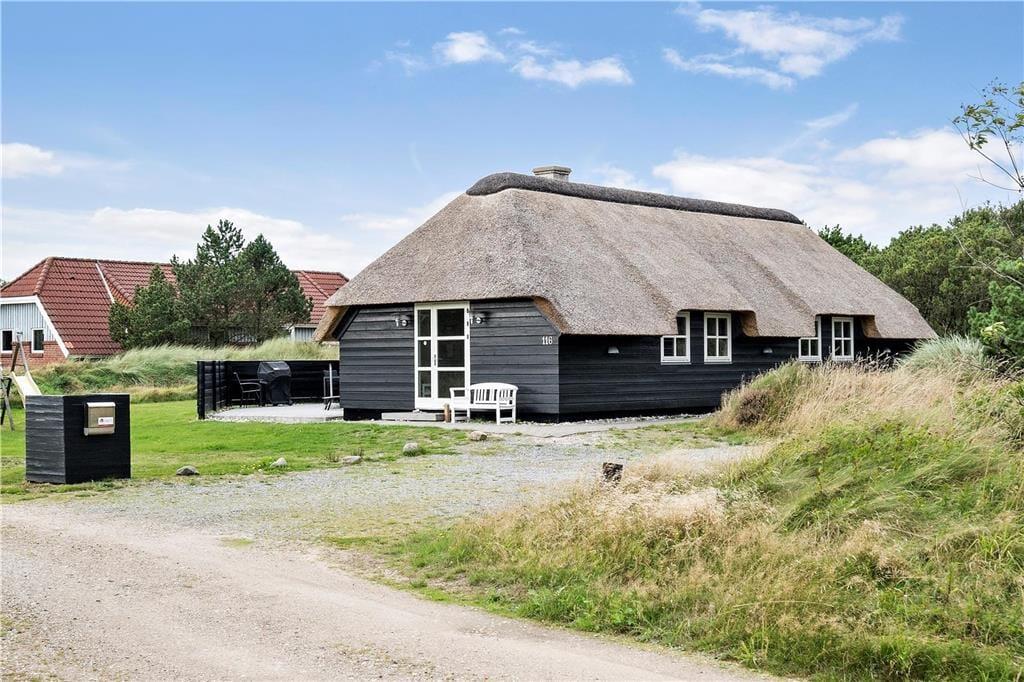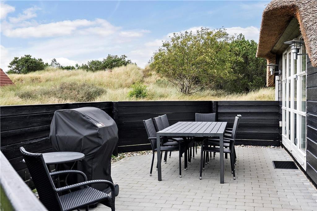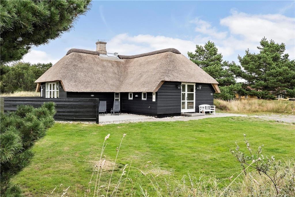 Både inde og ude er der masser af dejlige opholdspladser i dette rummelige og særdeles hyggelige sommerhus i Blåvand. Det stråtækte hus kan rumme op til otte personer – så I kan med andre ord sagtens invitere bedsteforældrene eller jeres gode venner med på sommerferie.