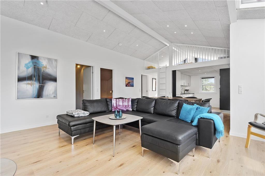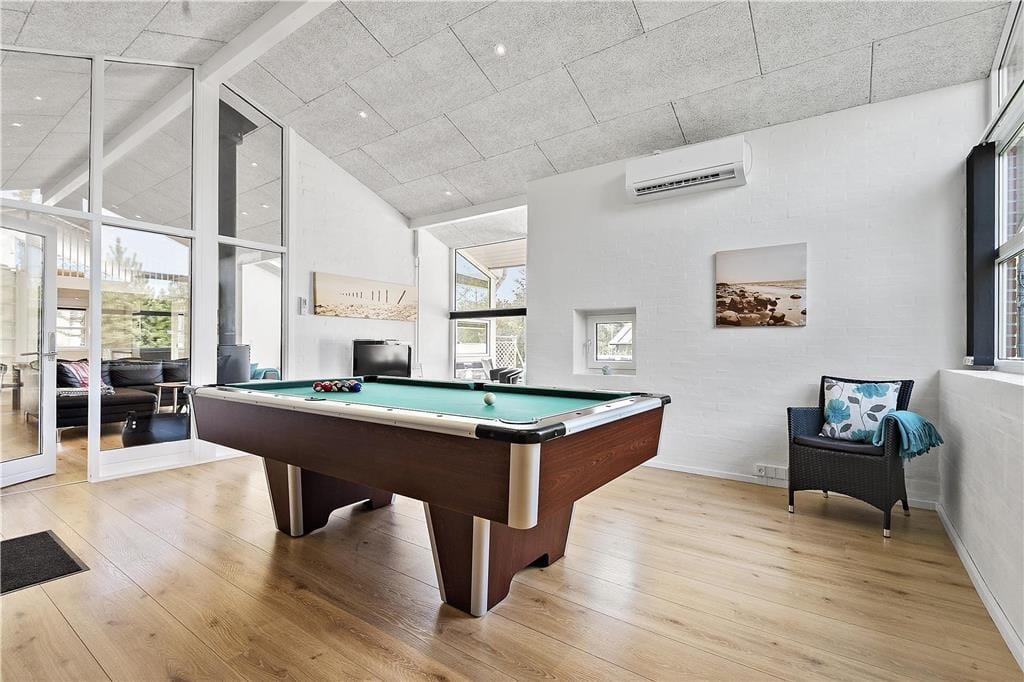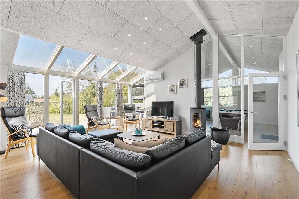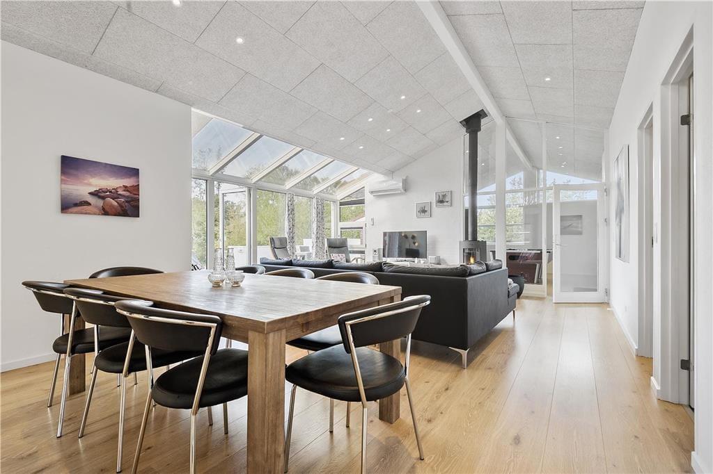 Sommerhuset måler hele 150 m2, og takket være den glimrende planløsning kan I nemt samles otte personer inden døre. De fire soveværelser er alle indrettet med gode dobbeltsenge, og fra stuen har I adgang til en hems, der kan bruges som en ekstra soveplads eller til børnenes leg i løbet af dagen. På det største af de to badeværelser står et lækkert spabad, og i det tilstødende aktivitetsrum finder I saunaen. Får I lyst til et slag pool, bordtennis eller dart, kan I slå jer løs i aktivitetsrummet, der desuden byder på en fladskærm med Wii. I kan også gøre klar til en hyggeaften i stuen, som er et skønt opholdsrum med flot lysindfald og åbent forbindelse til køkkenet. Er det køligt udenfor, kan I tænde varmepumpen og glæde jer over, at solcellerne leverer miljøvenlig energi – og I kan også lade varmen fra den hyggeskabende brændeovn sprede sig.