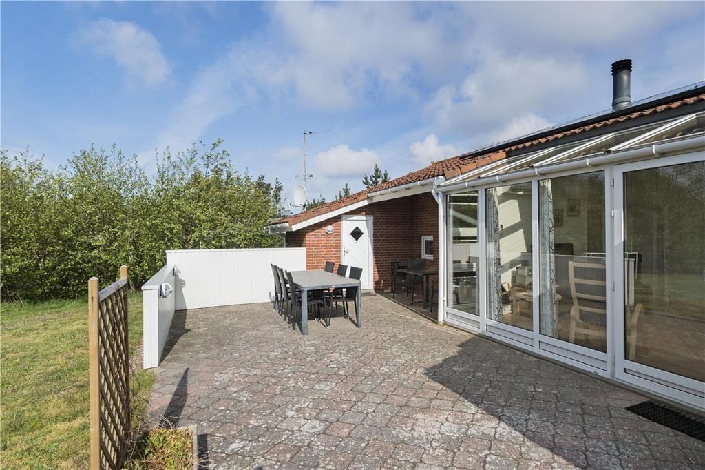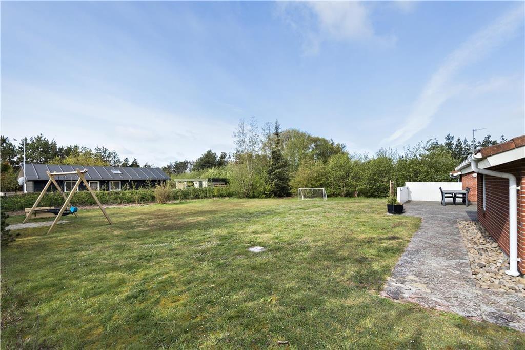 På lyse og lune dage kan ferielivet flyttes udenfor på den 1854 m2 store grund. Øst for sommerhuset ligger en lille morgenterrasse, og senere på dagen kan I rykke hen på den store fliseterrasse, der ligger mod syd med udsigt til den grønne have. På græsplænen er der gyngestativ, sandkasse og et lille fodboldmål, og foran sommerhuset er der plads til parkering på grusarealet.