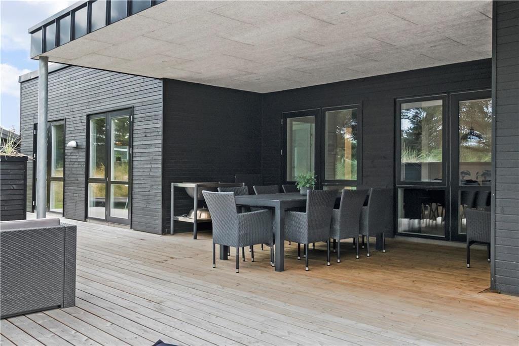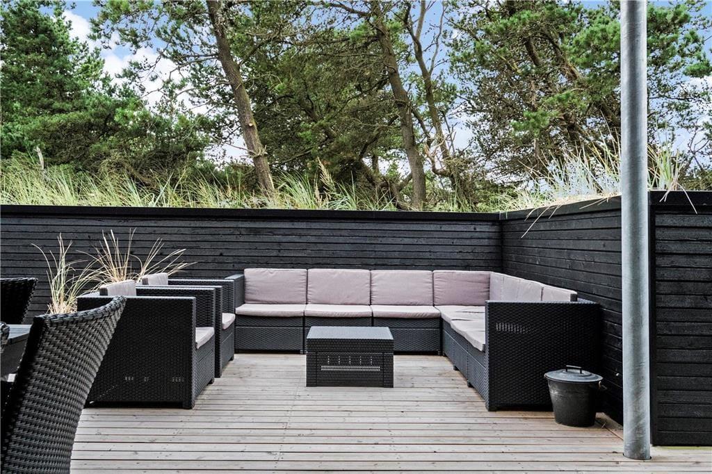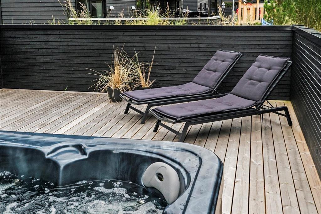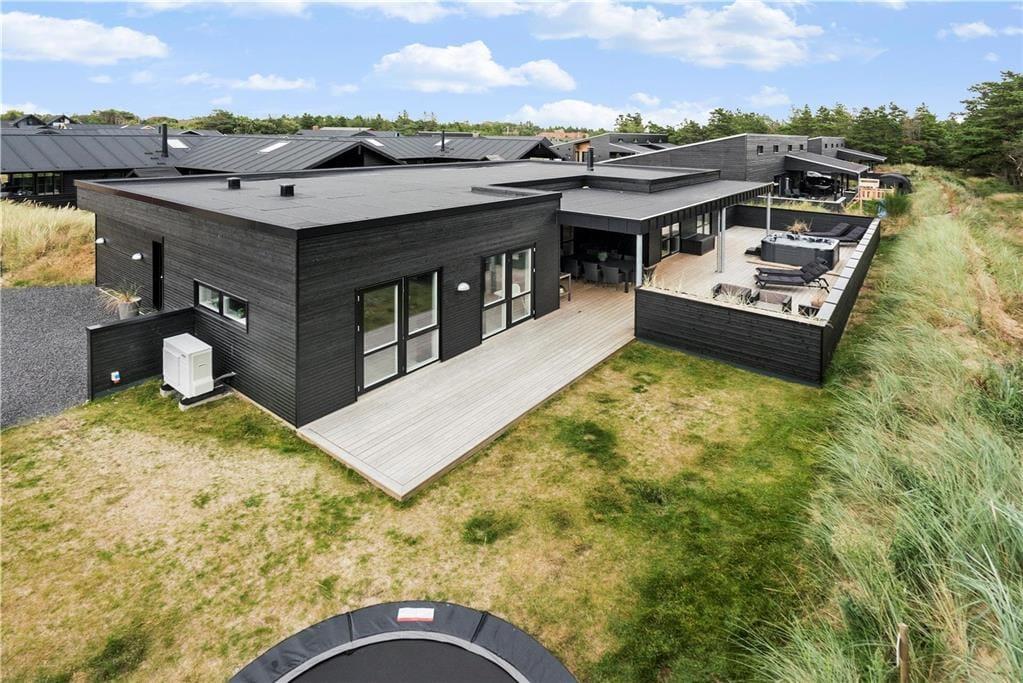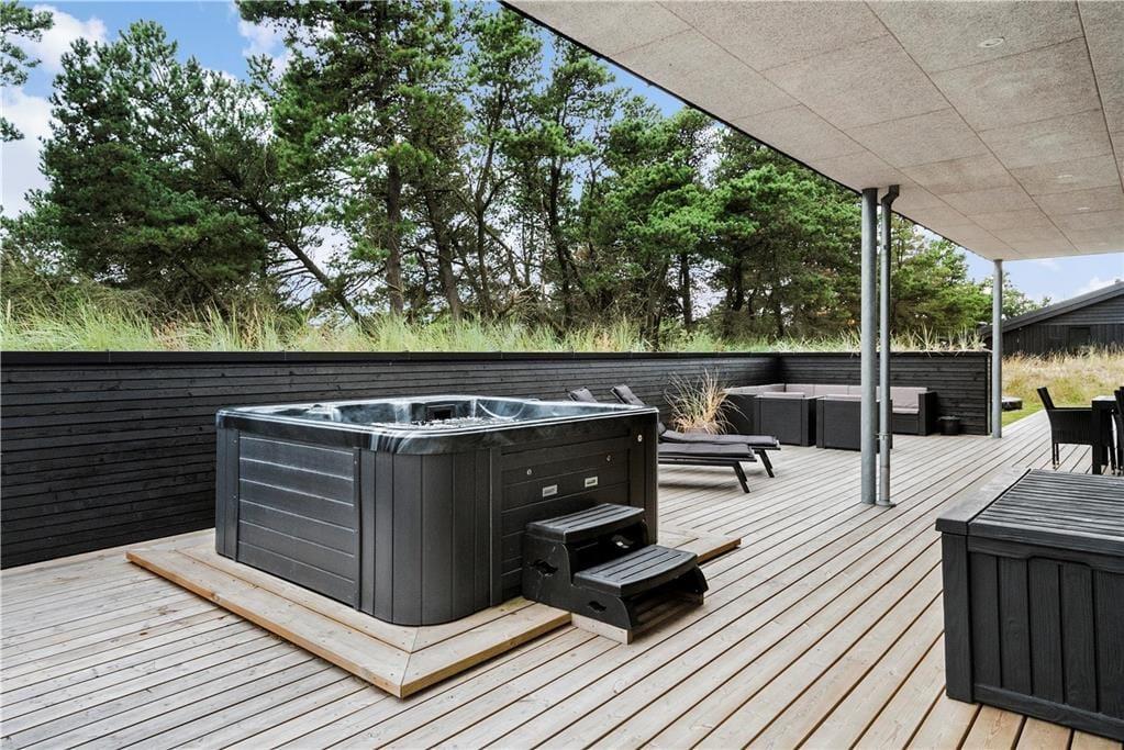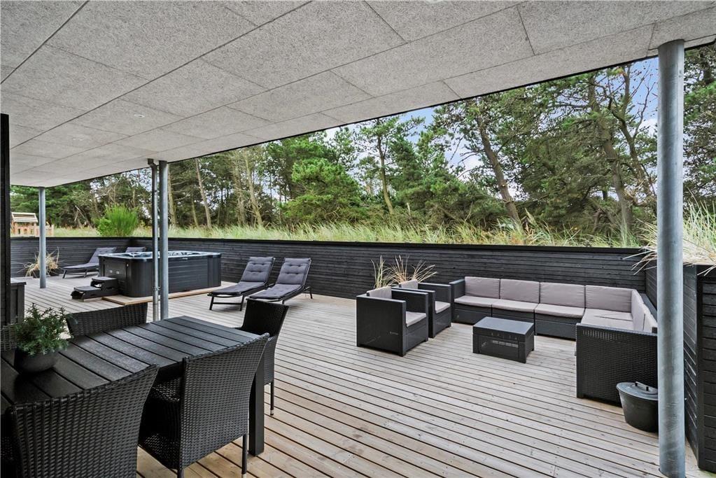 Luksusferielivet kan også foldes ud i fulde drag under åben himmel. For privatlivets og æstetikkens skyld er der anlagt marehalmsklædte ”sandklitter” rundt om grunden, og den sydvendte, delvist overdækkede terrasse skærmes yderligere af plankeværk. Loungemøbler og liggestole vil formentlig særligt komme i brug, når sommersolen skinner, mens grundens gynge, sandkasse og trampolin samt det skønne udendørs spabad er et hit også på køligere årstider.