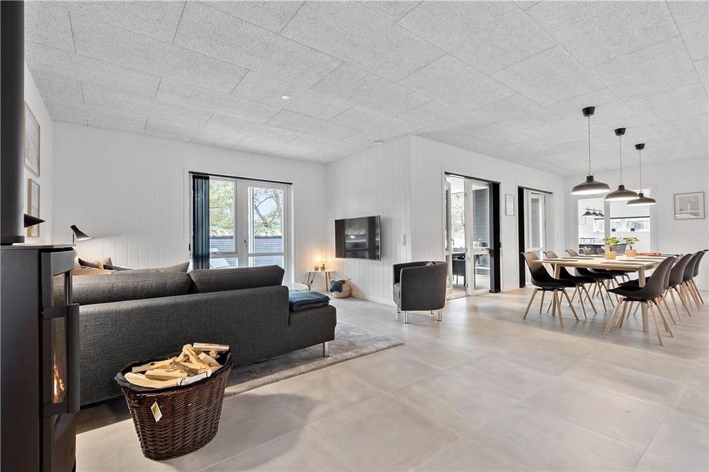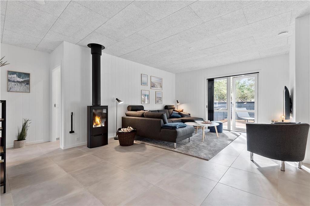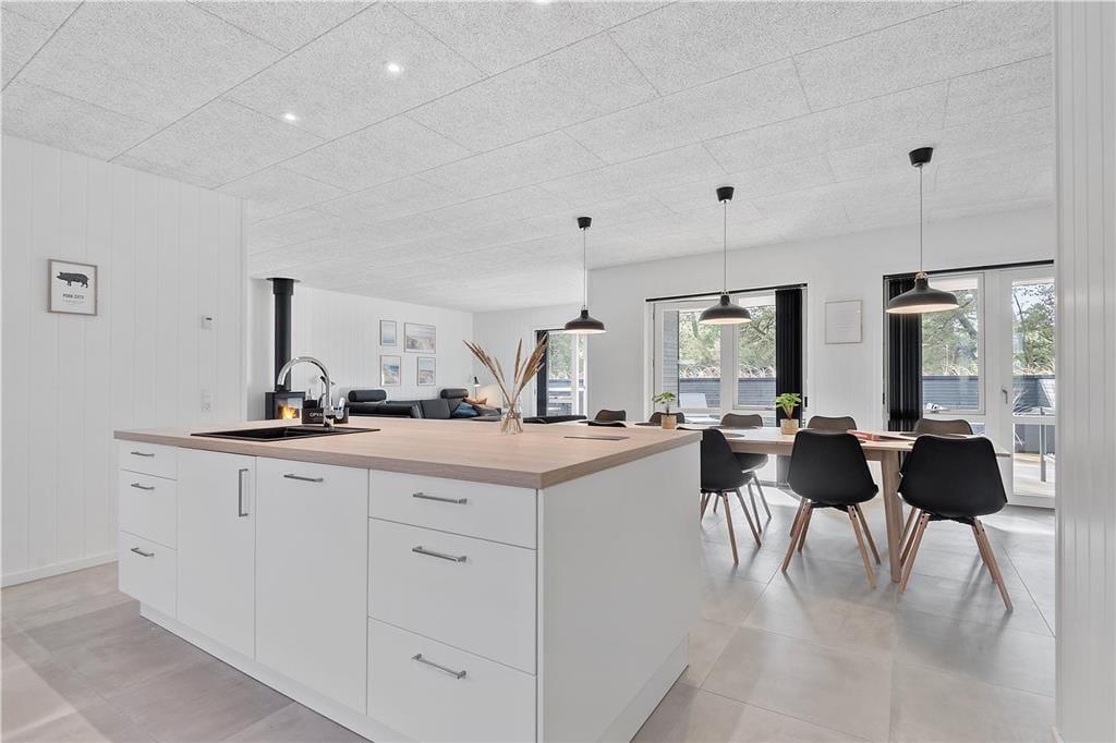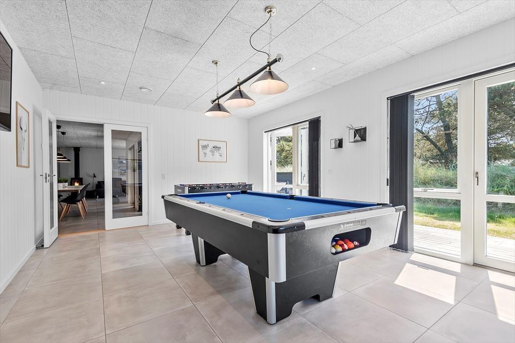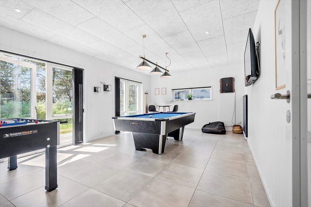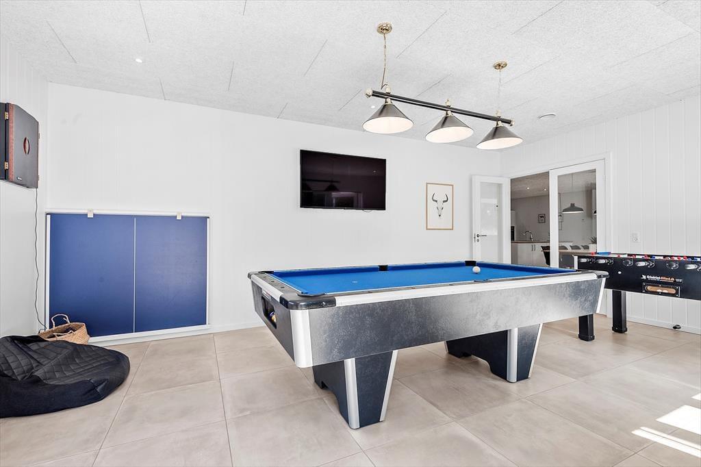 Komfort og kvalitet er kodeord for sommerhuset, der er opført så sent som i 2019 og måler hele 171 m2. Indretningen er stilfuld og lækker, og rundt omkring i huset finder I mange herlige opholdspladser, hvor I kan hygge jer i stor stil. For eksempel er det herligt at flade ud i sofaafdelingen nær brændeovnen i husets store stue, hvor I også kan samles ved langbordet, når det er spisetid. Stuen er integreret med et lækkert køkken, så selv når I forbereder aftensmaden, kan I tage del i den fælles feriehygge. Når I virkelig vil koble af, er der sauna og karbad på det ene af husets to badeværelser – og skal der være lidt mere gang i den, kan I dyste i pool, bordfodbold, bordtennis og dart i aktivitetsrummet. Flot belysning, akustiklofter og varmepumpen hører til de diskrete detaljer, der skaber en behagelig rumfornemmelse inden døre. Overalt i sommerhuset er der desuden gulvvarme, også på de fire soveværelser, der alle er udstyret med tv og gode dobbeltsenge.