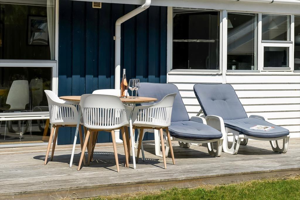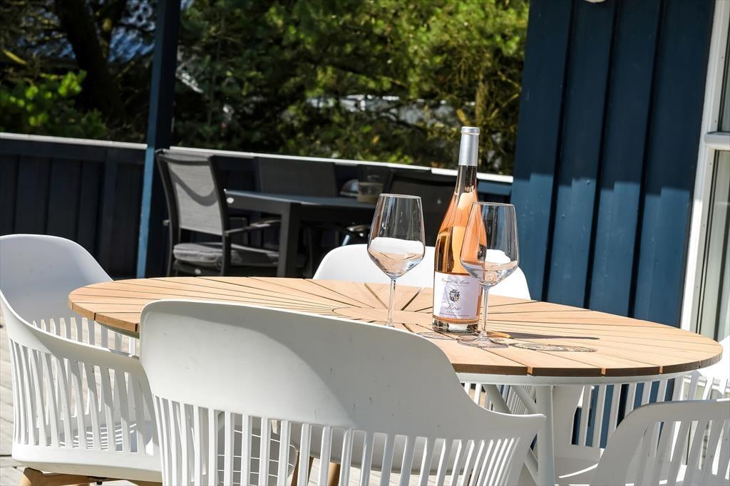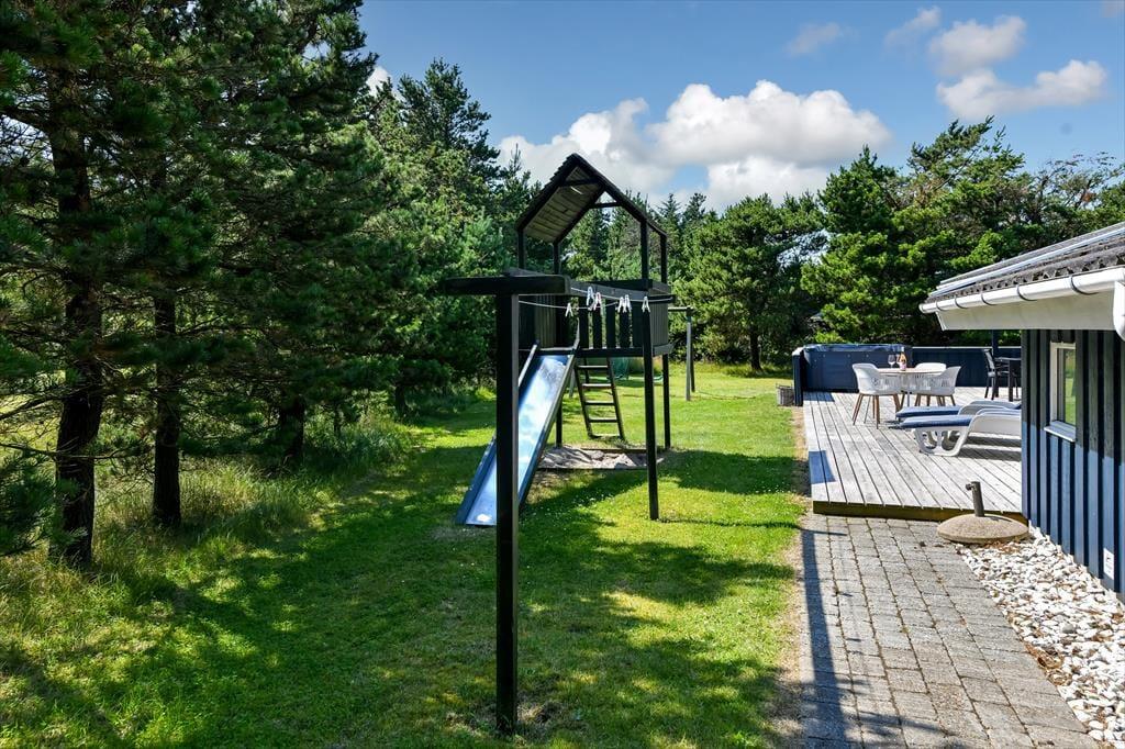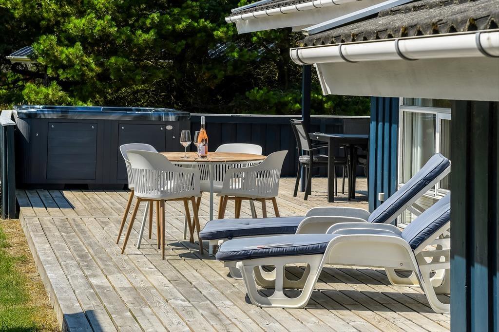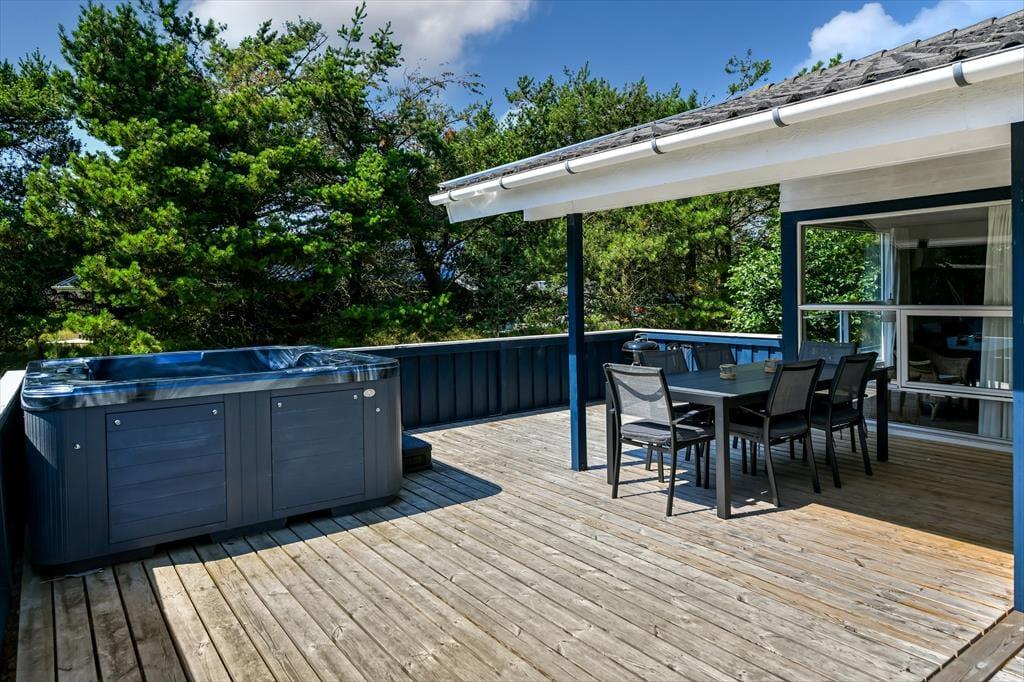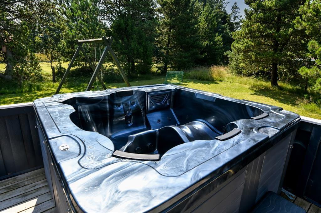 Livsnydertilværelsen kan også oplagt udspille sig ude i det fri på sommerhusets store træterrasse. Her kan I slikke sol eller få en siesta under parasollen, og om aftenen, kan I hygge jer med grill og gode middage på den overdækkede del af terrassen – eventuelt mens børnene leger færdig inden sengetid på naturgrunden, der er udstyret med gyngestativ, legetårn, sandkasse og fodboldmål. En perfekt afslutning på dagen er et udendørs spabad, for der er ikke noget som at læne sig tilbage i et varmt bad med frit udsyn til stjernehimlen.