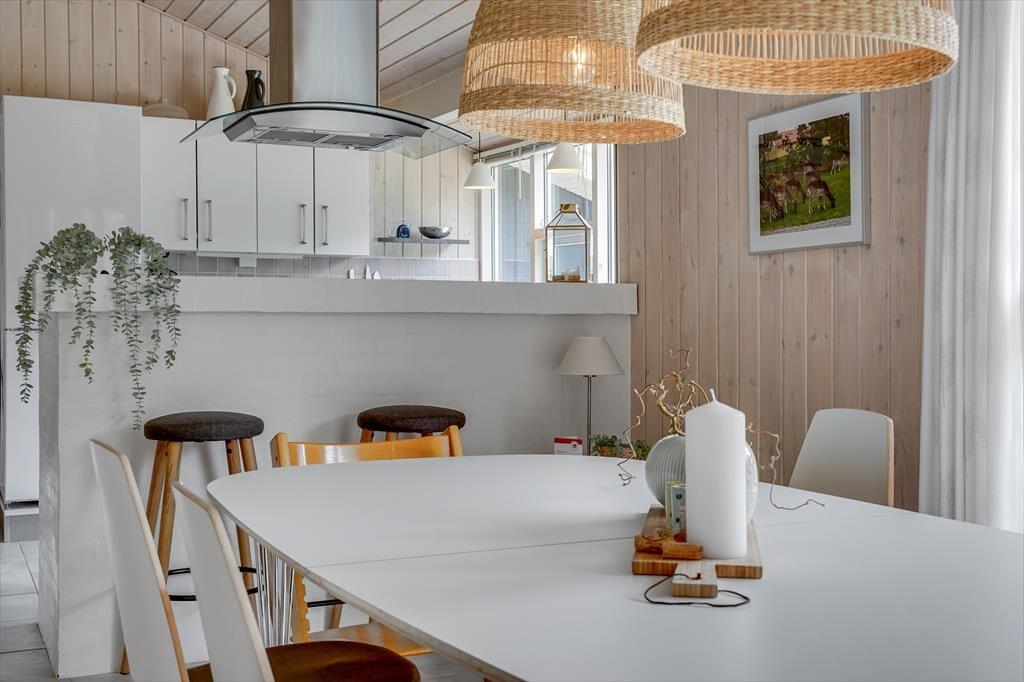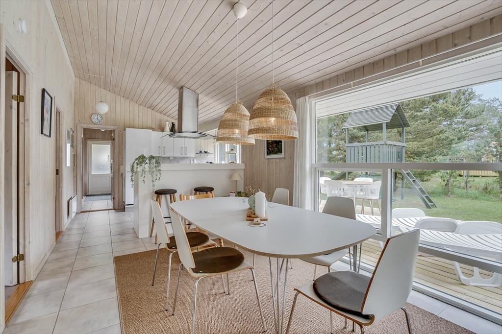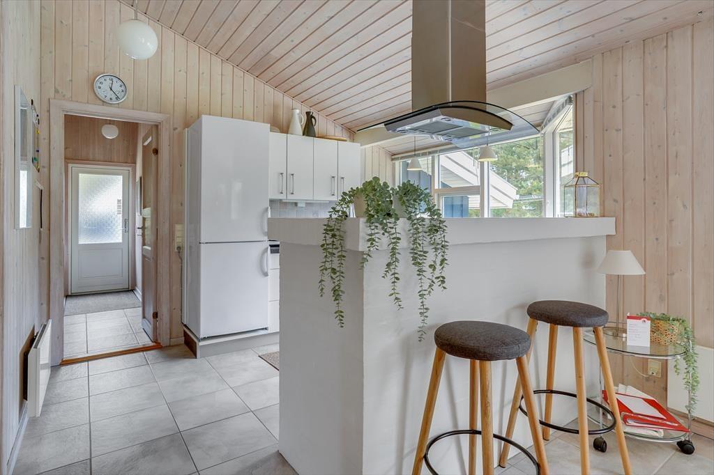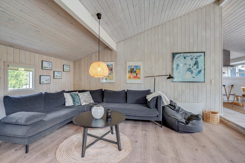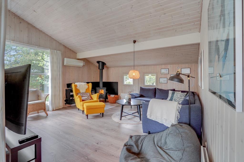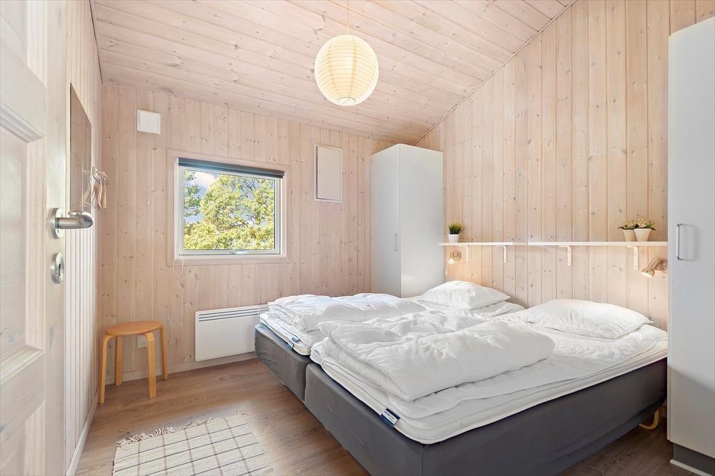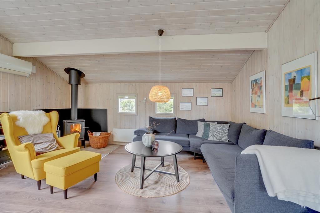Det 100 m2 store sommerhus er renoveret på vellykket vis, så indretningen er lys og atmosfæren indbydende. Husets skønne opholdsrum indbyder til mange hyggestunder omkring spisebordet og i sofaafdelingen nær brændeovnen, og i det åbne og veludstyrede køkken har I god plads til at kokkerere. På de tre soveværelser kan I se frem til en god nats søvn i de komfortable senge, og når I er klar til at stå op, er der mulighed for at blive frisket op med et brusebad på det store badeværelse. Er I mere i humør til wellness og afslapning, kan det lade sig gøre i saunaen på badeværelset.