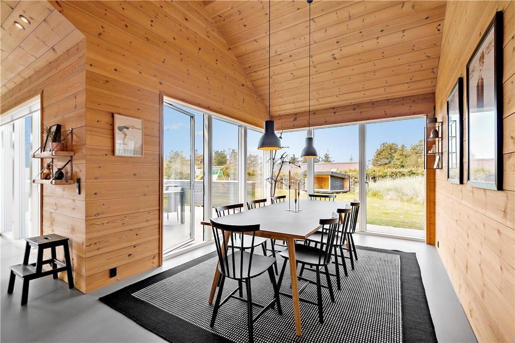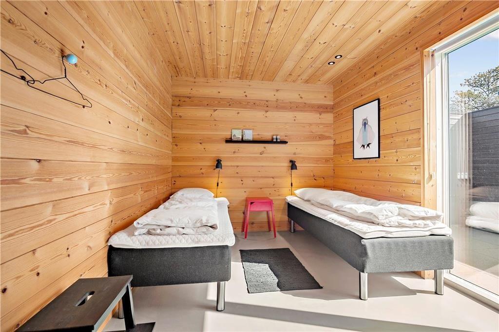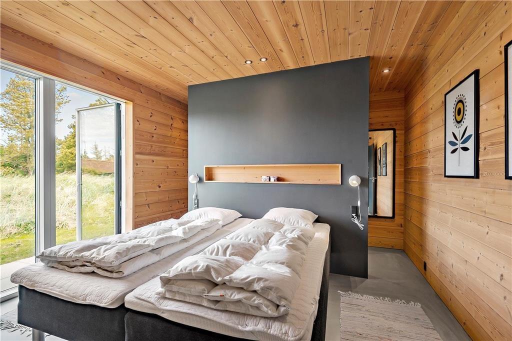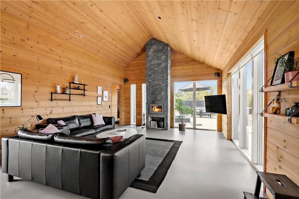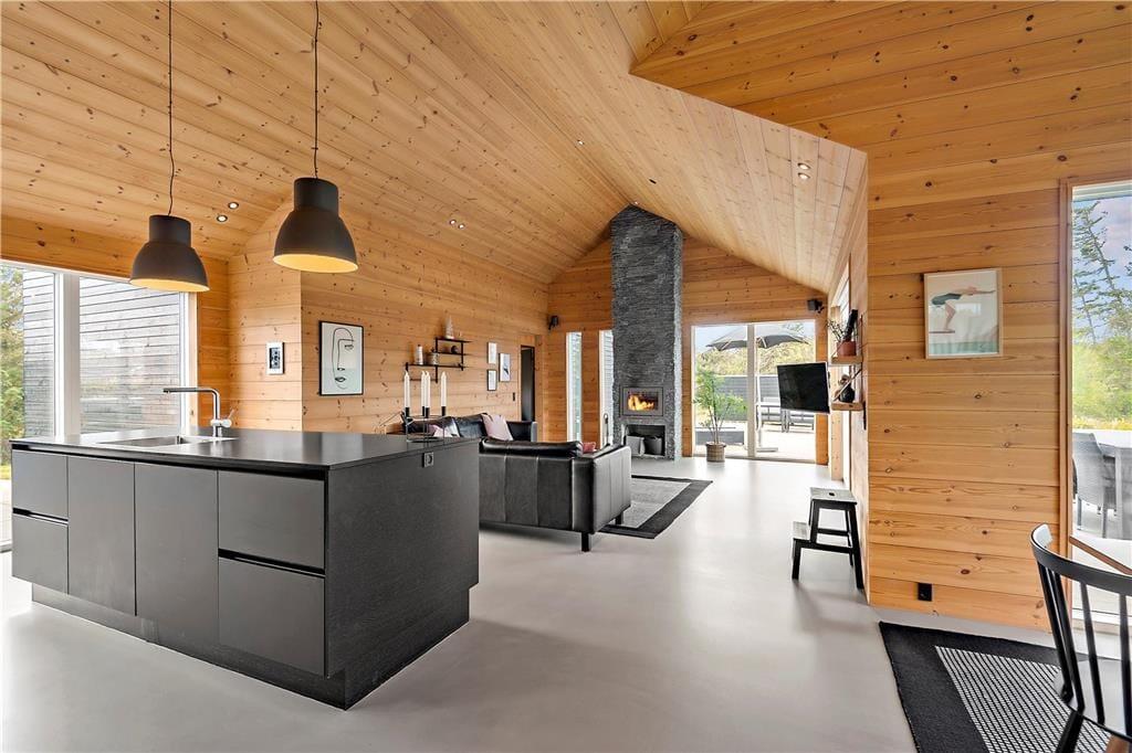 Det indendørs driverliv kommer til at foregå i fornemme omgivelser, for det 180 m2 store træsommerhus er arkitekttegnet og fyldt med lækkert design. Et flot cementgulv med indlagt gulvvarme pryder alle rummene, og det giver en spændende kontrast til væggenes klassiske træbeklædning. Pejseindsatsen i den højloftede stue hører også til et af husets mange fede detaljer, og den moderne, åbne køkkenafdeling, aktivitetsrummet og badeværelset med spabad er desuden værd at bemærke. I alt er der to badeværelser i huset, og i udhuset finder I en sauna, der vil forsøde ferielivet på en kølig dag. På gennemtænkt vis er badeværelserne og de fire soveværelser ligeligt fordelt i hver sin ende af sommerhuset – og det er eksempelvis hensigtsmæssigt for to børnefamilier, der gerne vil holde ferie sammen.