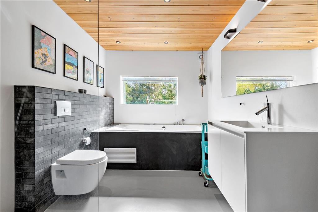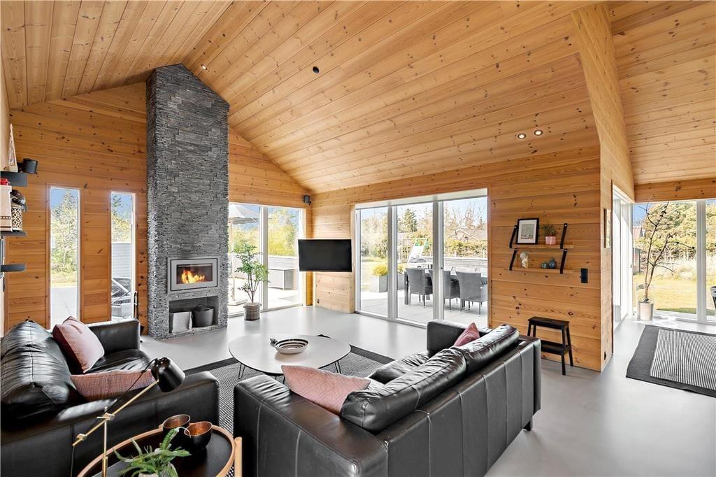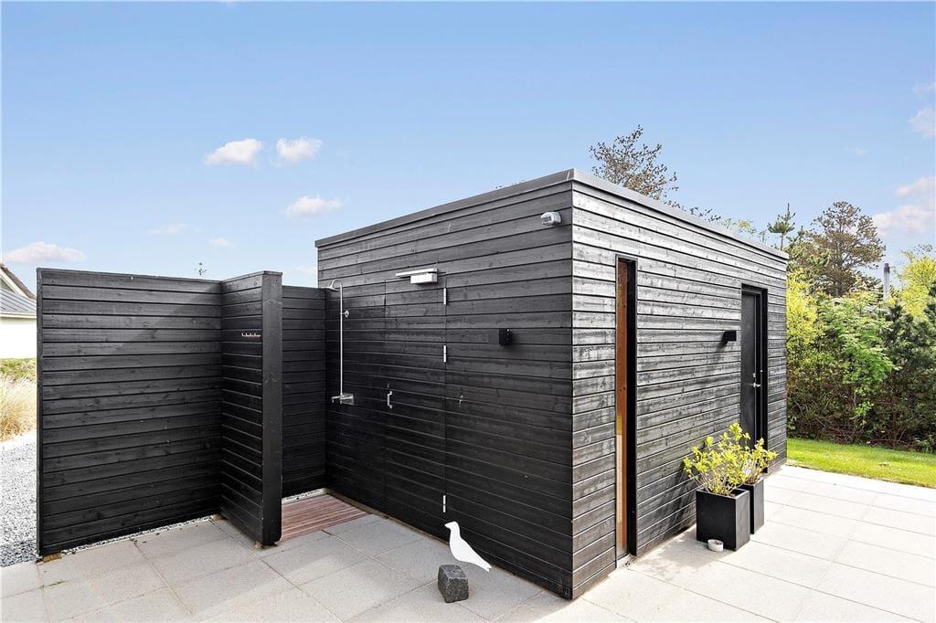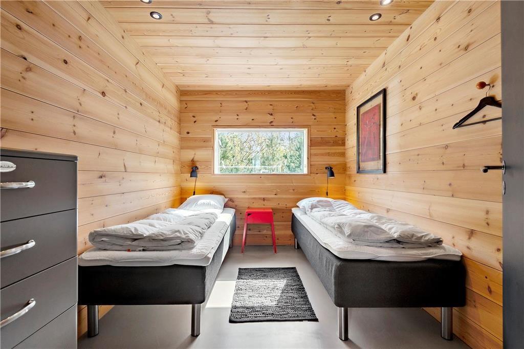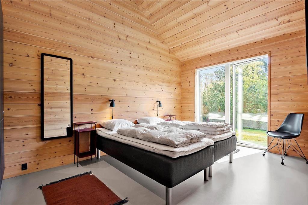 Det indendørs driverliv kommer til at foregå i fornemme omgivelser, for det 180 m2 store træsommerhus er arkitekttegnet og fyldt med lækkert design. Et flot cementgulv med indlagt gulvvarme pryder alle rummene, og det giver en spændende kontrast til væggenes klassiske træbeklædning. Pejseindsatsen i den højloftede stue hører også til et af husets mange fede detaljer, og den moderne, åbne køkkenafdeling, aktivitetsrummet og badeværelset med spabad er desuden værd at bemærke. I alt er der to badeværelser i huset, og i udhuset finder I en sauna, der vil forsøde ferielivet på en kølig dag. På gennemtænkt vis er badeværelserne og de fire soveværelser ligeligt fordelt i hver sin ende af sommerhuset – og det er eksempelvis hensigtsmæssigt for to børnefamilier, der gerne vil holde ferie sammen.