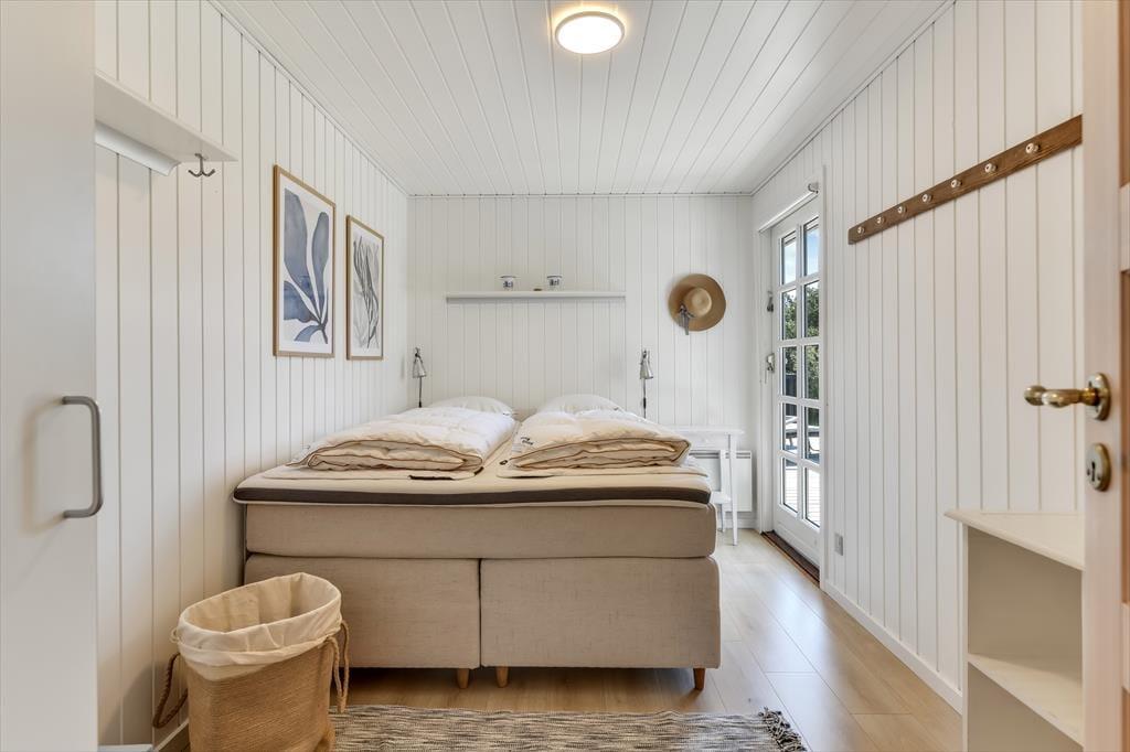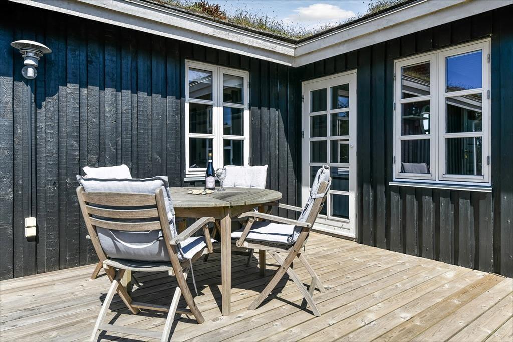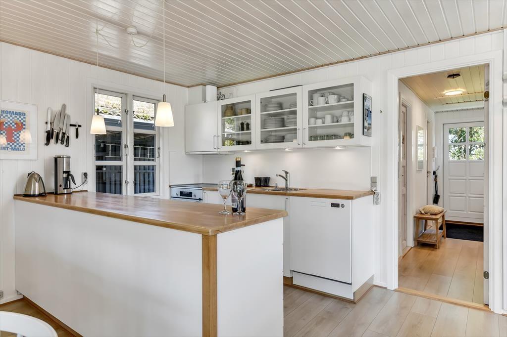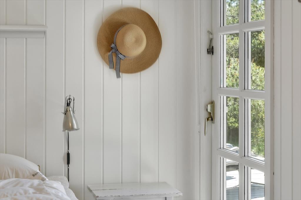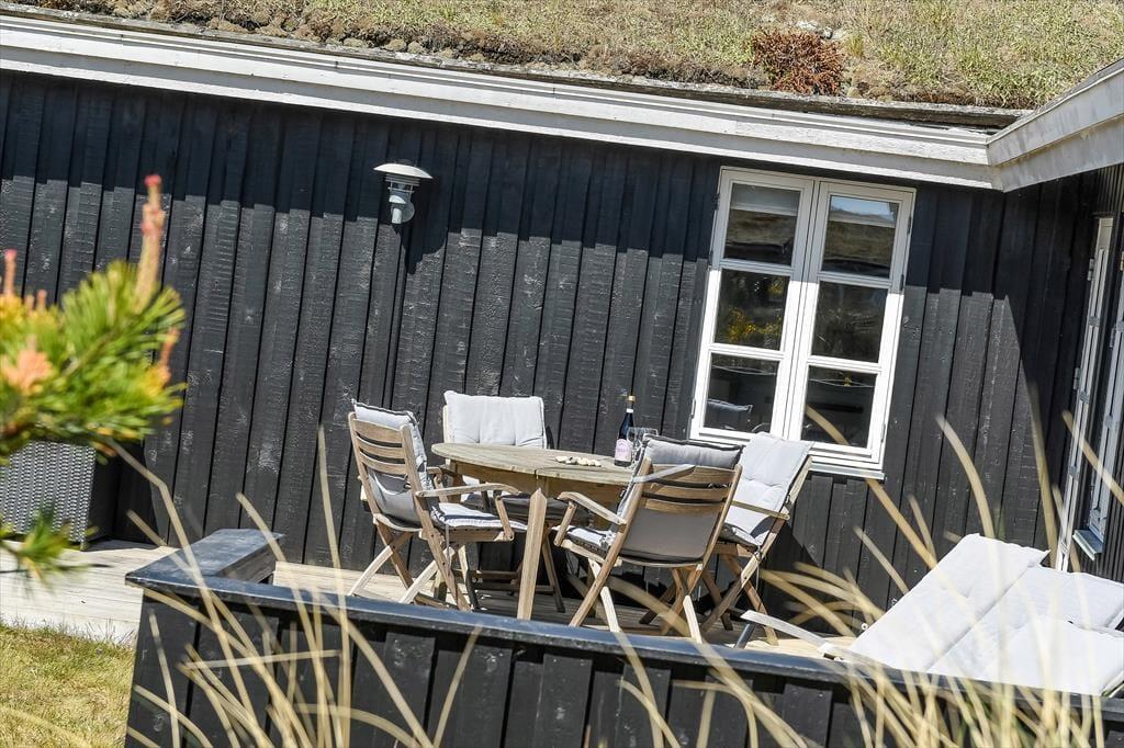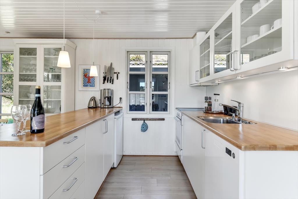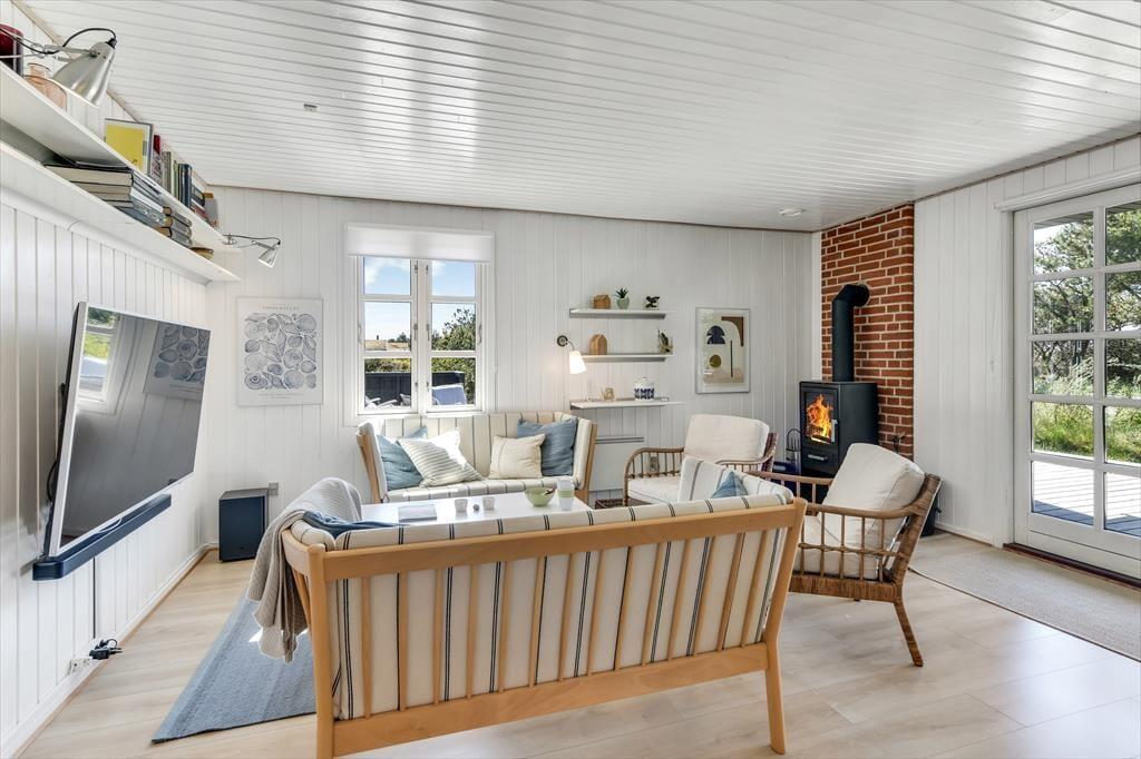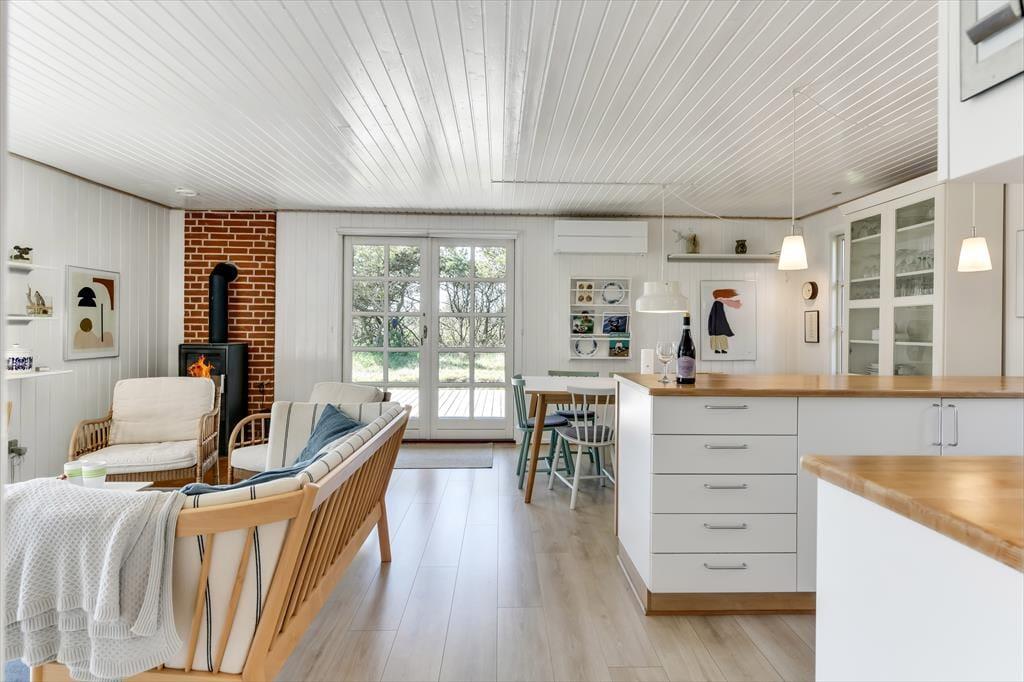 Huset har græs på taget, sortmalet træfacade og hvide vinduesrammer – et rigtigt sommerhus, som emmer og fred og idyl. Indvendig er der lyst og indbydende, og indretningen understøtter ferieturens hyggelige samvær med venner og familie. I stuen er der spisebord og sofagruppe, som bliver lunet ekstra op af brændeovnen i hjørnet. Det tosidede køkken ligger i åben forbindelse med opholdsrummet, så madlavningen kan blive en naturlig del af samværet. Huset indeholder tre soverum, hvoraf det største har direkte udgang til terrassen – det er en særlig luksus at kunne gå direkte fra sengen og ud i dagens første solstråler. Endelig får I to badeværelser med brus.