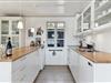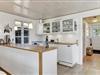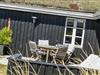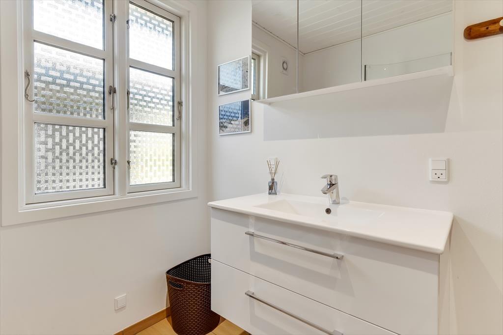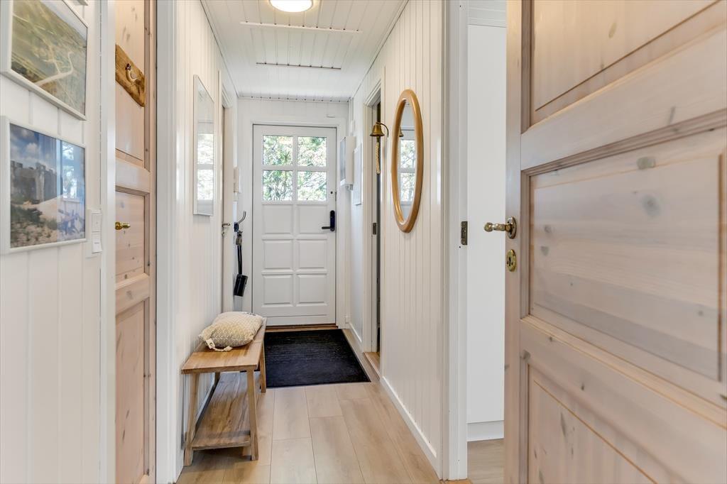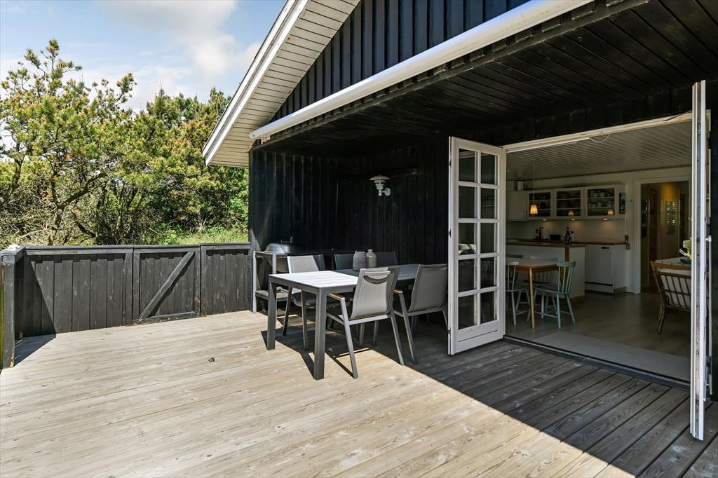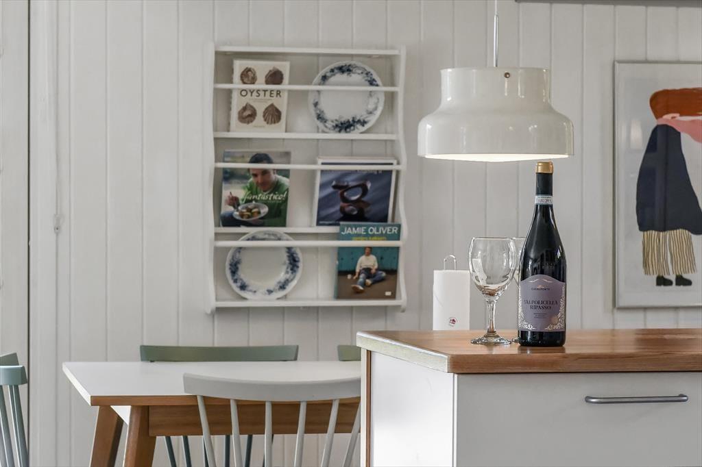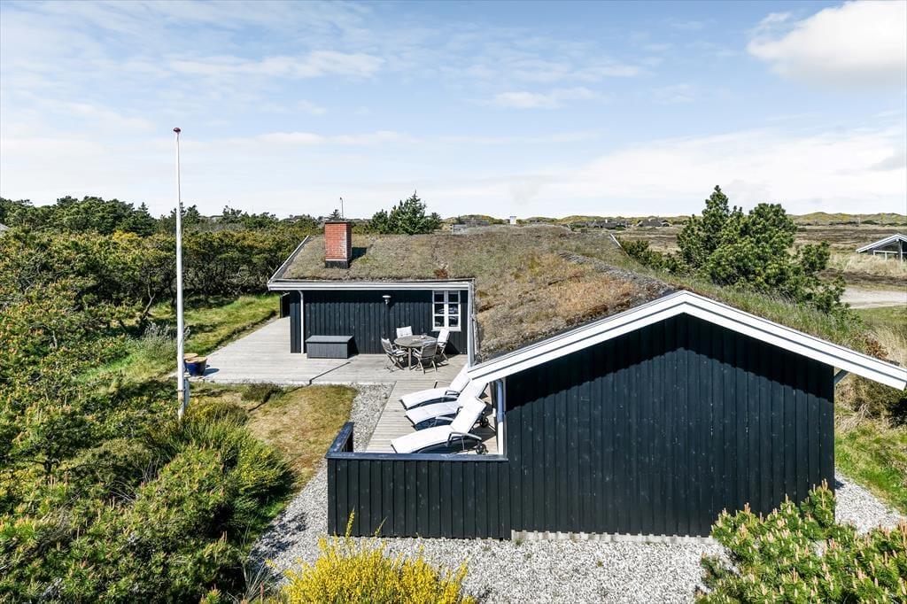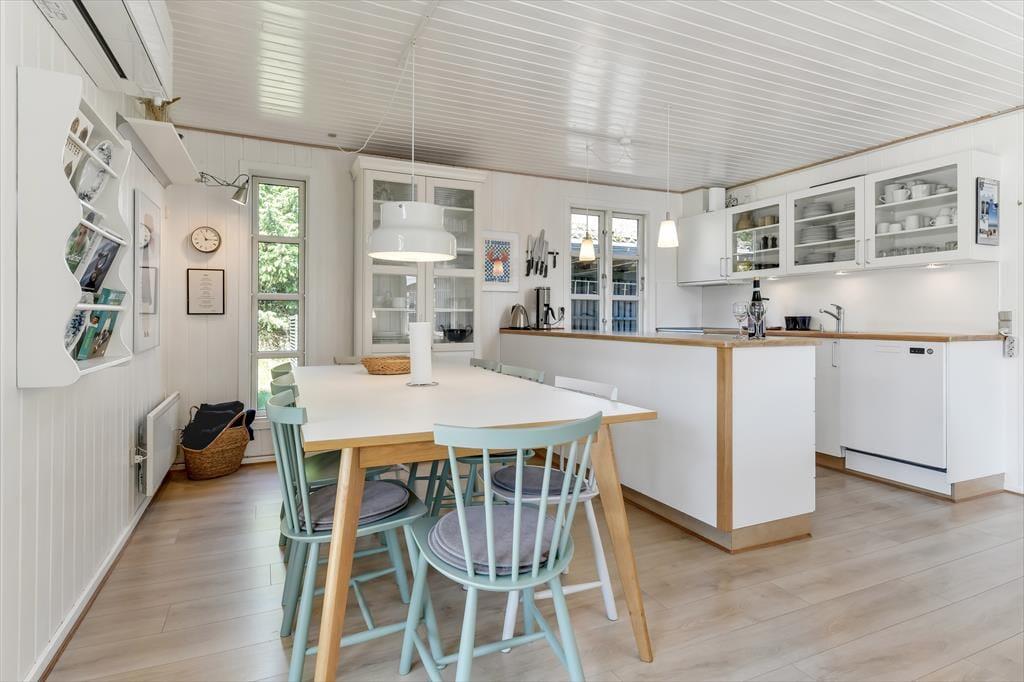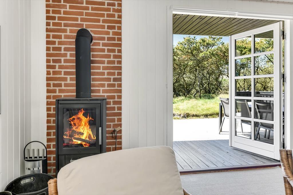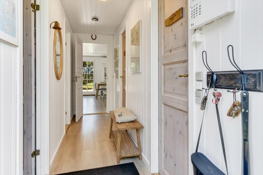 Huset har græs på taget, sortmalet træfacade og hvide vinduesrammer – et rigtigt sommerhus, som emmer og fred og idyl. Indvendig er der lyst og indbydende, og indretningen understøtter ferieturens hyggelige samvær med venner og familie. I stuen er der spisebord og sofagruppe, som bliver lunet ekstra op af brændeovnen i hjørnet. Det tosidede køkken ligger i åben forbindelse med opholdsrummet, så madlavningen kan blive en naturlig del af samværet. Huset indeholder tre soverum, hvoraf det største har direkte udgang til terrassen – det er en særlig luksus at kunne gå direkte fra sengen og ud i dagens første solstråler. Endelig får I to badeværelser med brus.