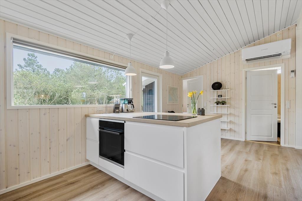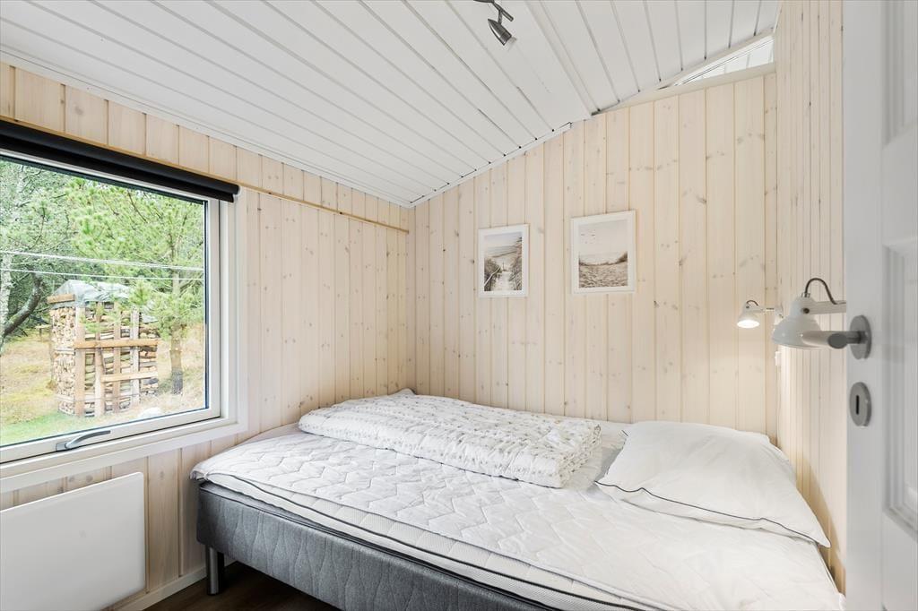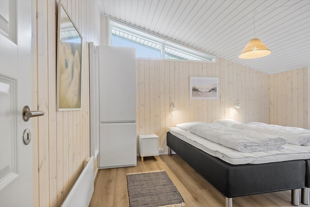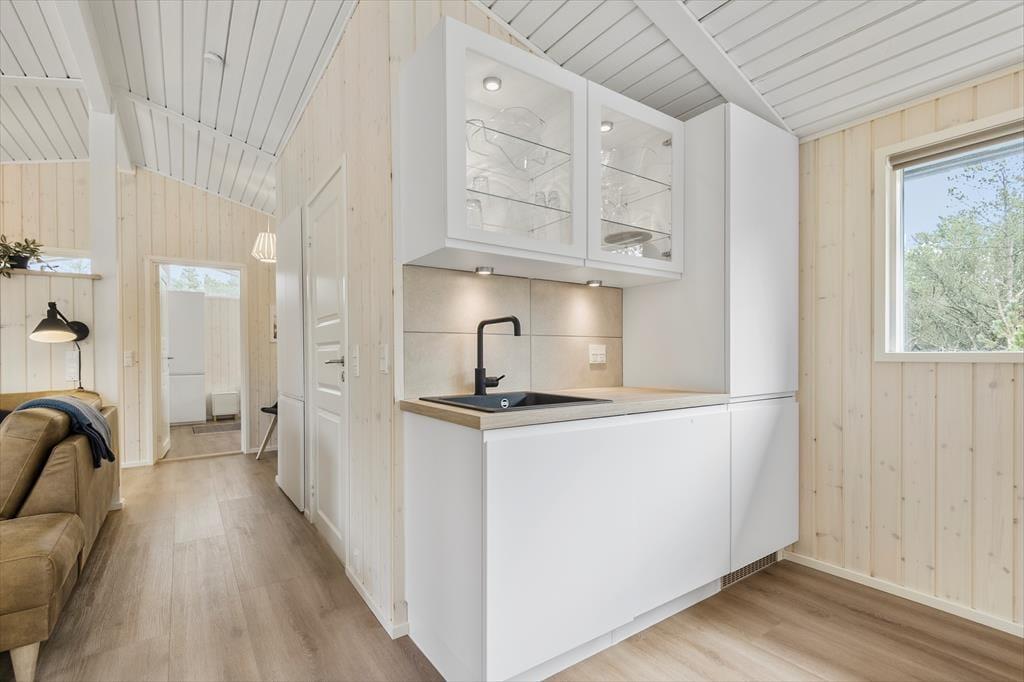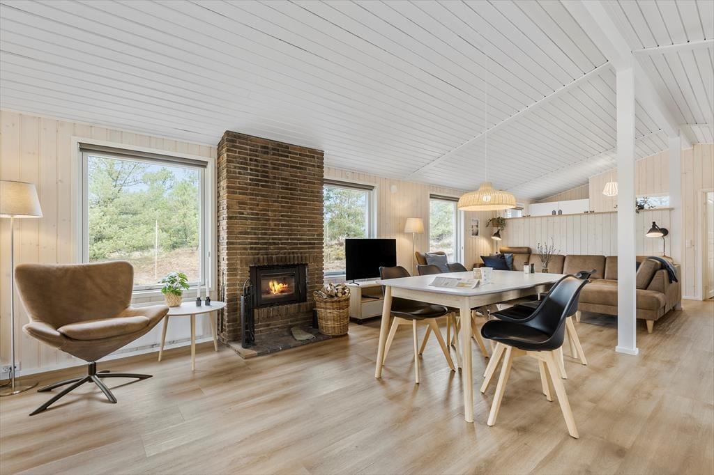 Sommerhuset er ikke bare blevet renoveret, men også tilbygget i 2023, så der nu er 102 flotte kvadratmeter at brede ferielivet ud på. Blandt andet kan I se frem til at kokkerere i et lækkert køkken med stilfuldt interiør og gode hvidevarer – og det er for øvrigt godt integreret med stuen, så I kan hyggesnakke med resten af selskabet, selvom der skal røres i gryderne. En af de klassiske detaljer, der er bevaret i stuen, er indbygningspejsen, så I kan nyde varmen og skæret fra flammerne, når I slapper af i sofaen. Fladskærms-tv’et står klar til at levere underholdningen, hvis ikke I bare laderne tankerne flyve, mens I kigger ud på naturgrunden gennem stuens store vinduer. De fire soveværelser, der alle er udstyret med dobbeltseng, er fordelt i begge ender af huset, og planløsningen fuldendes af et brusebadeværelse og et gæstetoilet.