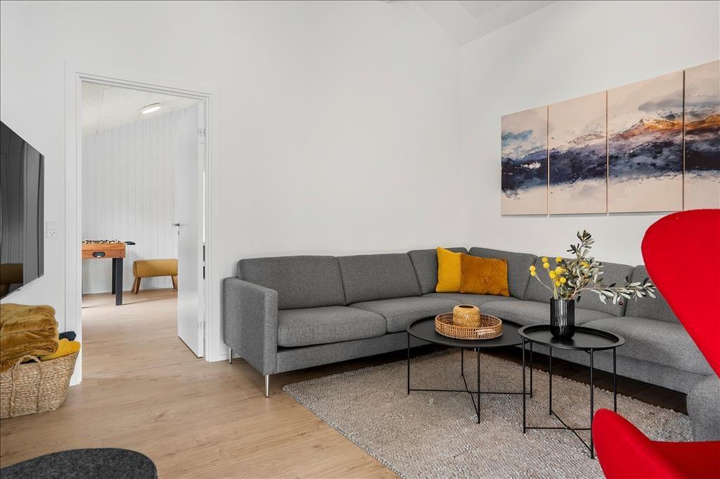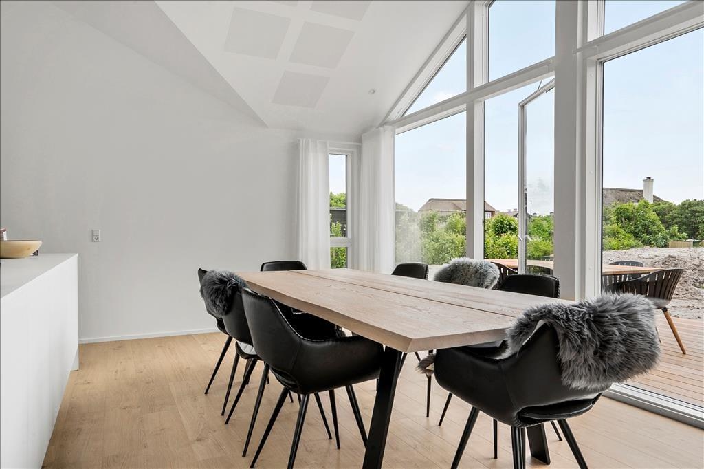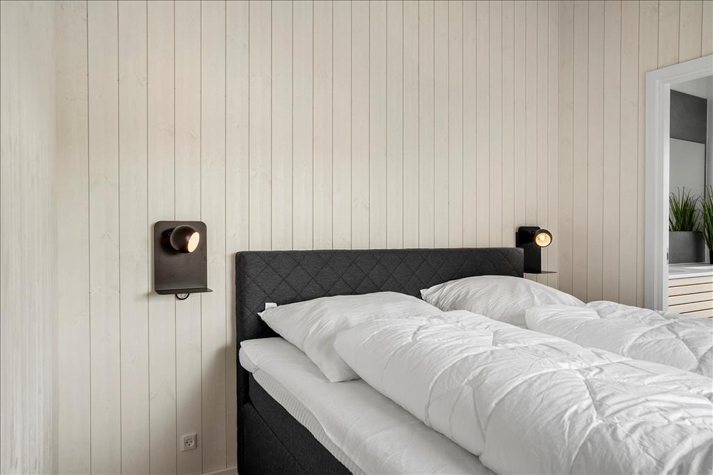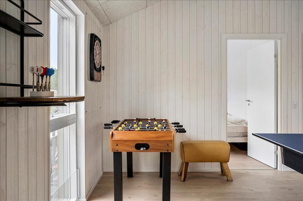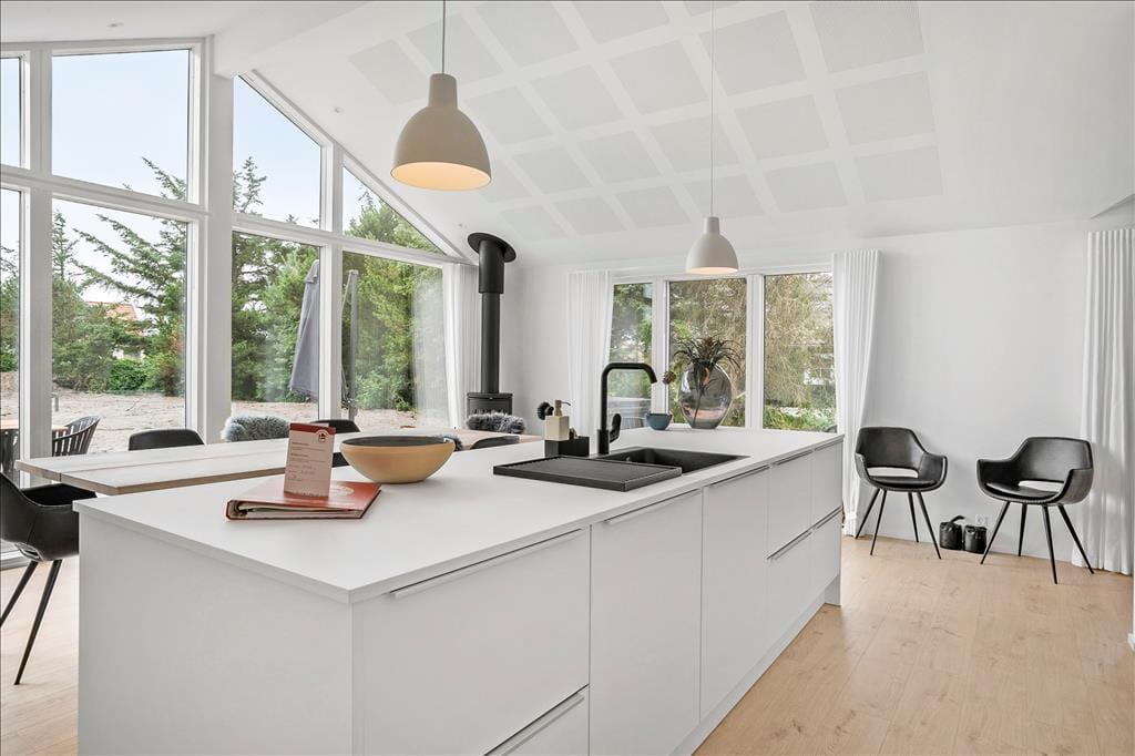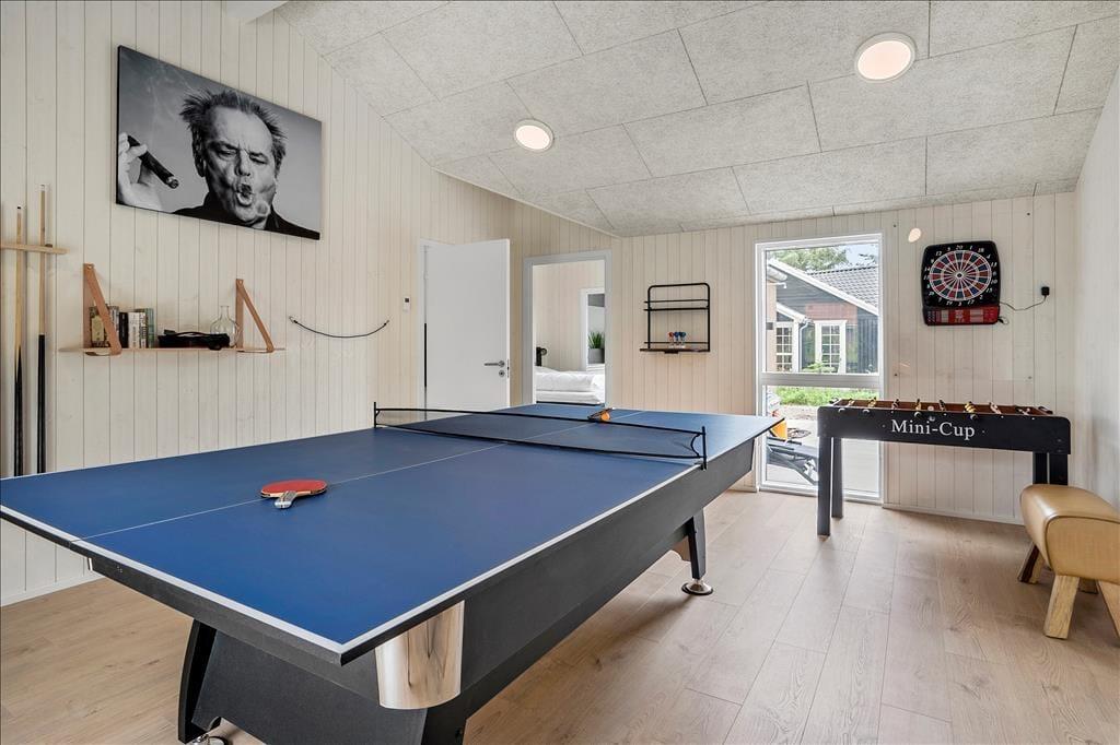 Det 140 m2 store sommerhus er opført i 2021, så rammerne om ferielivet er rummelige, moderne indrettede og særdeles indbydende. Med fem gode soveværelser og tre ditto badeværelser kan I uden problemer samles ti personer her i huset – og her er den gennemtænkte planløsning for øvrigt værd at bemærke, for rummene er opdelt i tre afsnit, så I kan trække jer tilbage, når det er ved at være sengetid. I løbet af dagen er det herligt at samles i sommerhusets flotte opholdsafdeling, hvor køkken-alrum og stue ligger i åben forbindelse. Her er der brændeovn og stilfuldt møblement, og de store vinduespartier er med til at skabe en lys og let atmosfære. Stemningen er også god i det tilstødende aktivitetsrum, hvor I kan spille pool og bordfodbold eller streame film på tv’et, der har Chromecast tilsluttet.