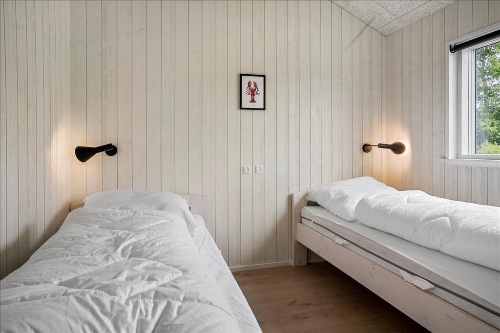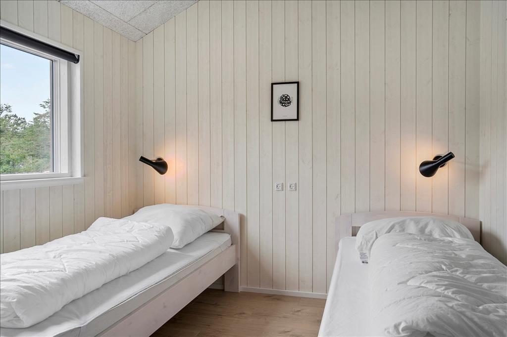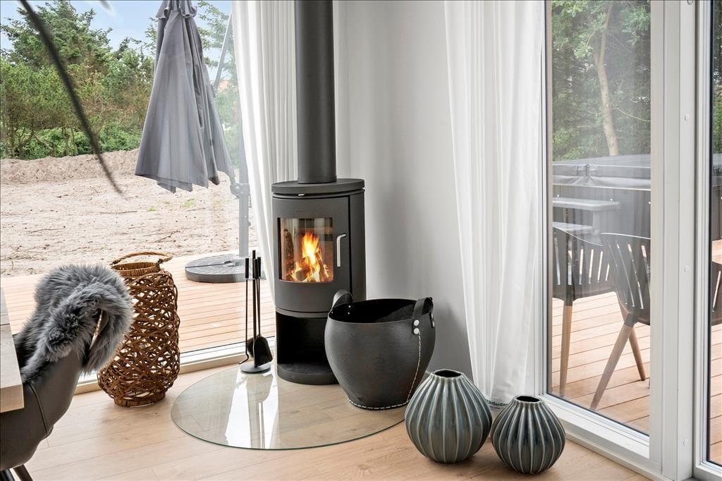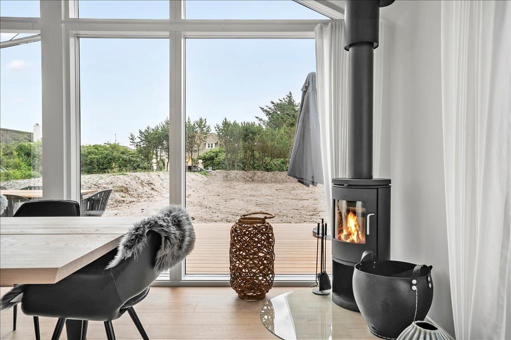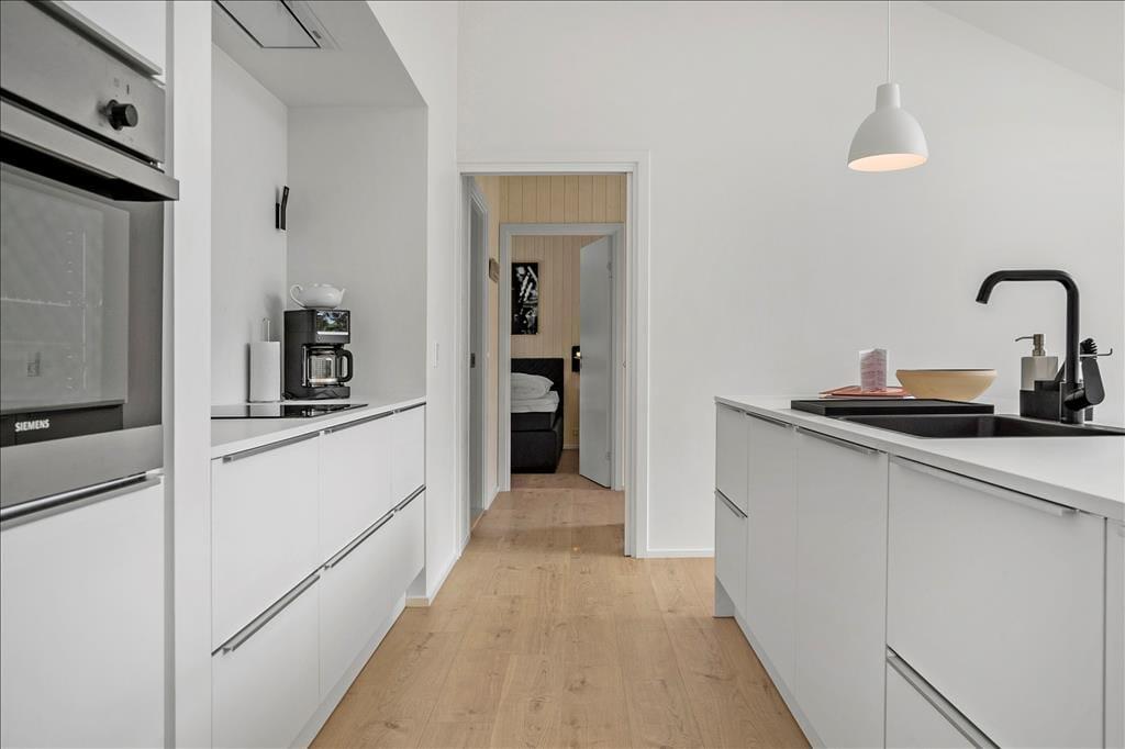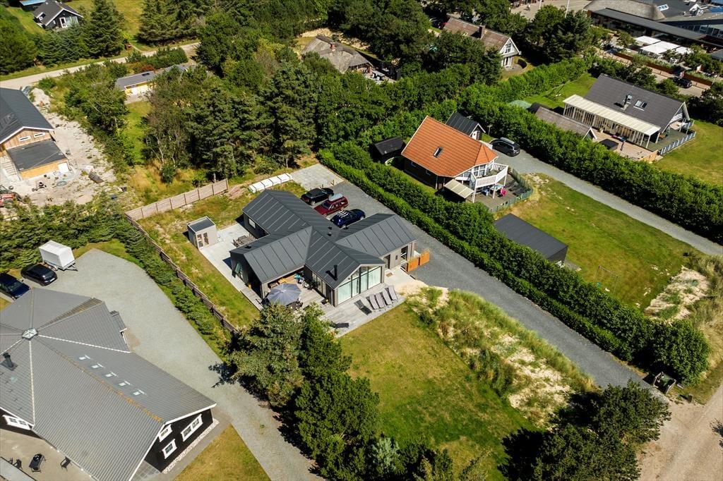 Det 140 m2 store sommerhus er opført i 2021, så rammerne om ferielivet er rummelige, moderne indrettede og særdeles indbydende. Med fem gode soveværelser og tre ditto badeværelser kan I uden problemer samles ti personer her i huset – og her er den gennemtænkte planløsning for øvrigt værd at bemærke, for rummene er opdelt i tre afsnit, så I kan trække jer tilbage, når det er ved at være sengetid. I løbet af dagen er det herligt at samles i sommerhusets flotte opholdsafdeling, hvor køkken-alrum og stue ligger i åben forbindelse. Her er der brændeovn og stilfuldt møblement, og de store vinduespartier er med til at skabe en lys og let atmosfære. Stemningen er også god i det tilstødende aktivitetsrum, hvor I kan spille pool og bordfodbold eller streame film på tv’et, der har Chromecast tilsluttet.