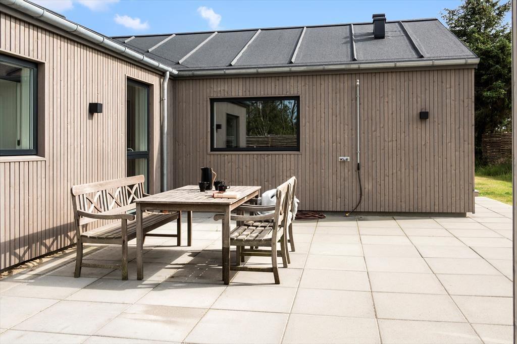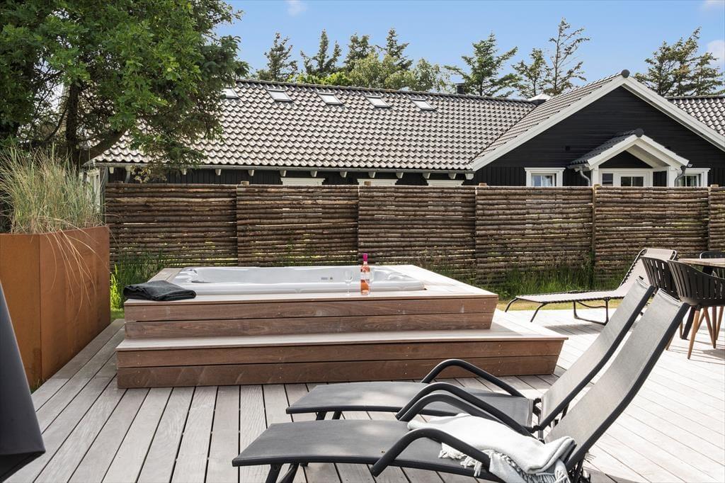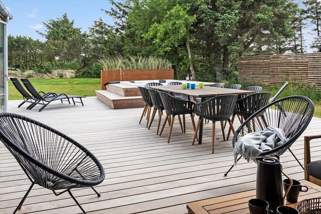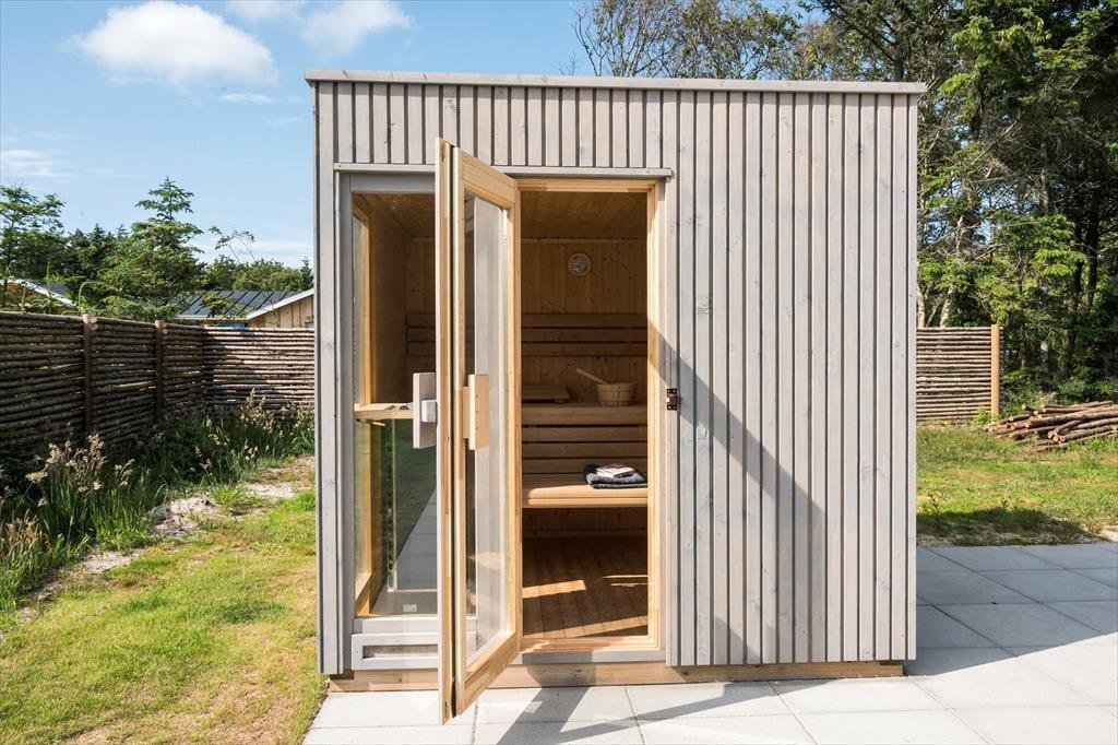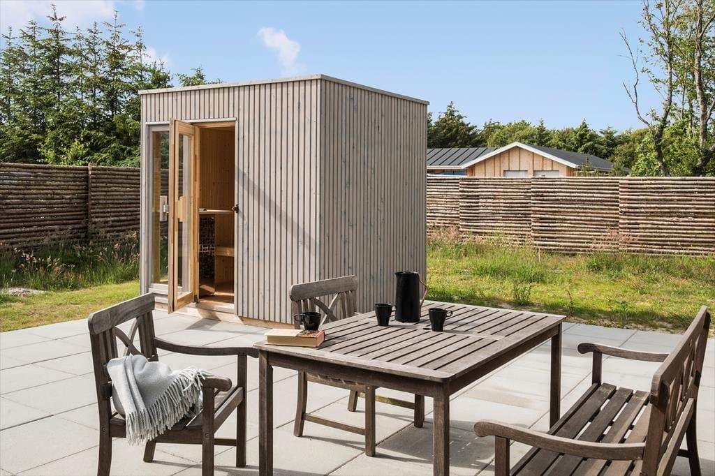 Ude i det fri på den 1.543 store grund breder flot anlagte terrasser sig syd og vest for sommerhuset. En del af terrassen er overdækket og indrettet som et dejligt loungeområde – og når I ikke sidder her, er det også skønt at samles til solbeskinnet sommerfrokost omkring langbordet eller at tage en slapper i spabadet ved aftentid. Spabadet kan kombineres med en tur i saunaen, og efter jeres wellness-stund er det muligt at blive frisket op under udendørsbruseren.