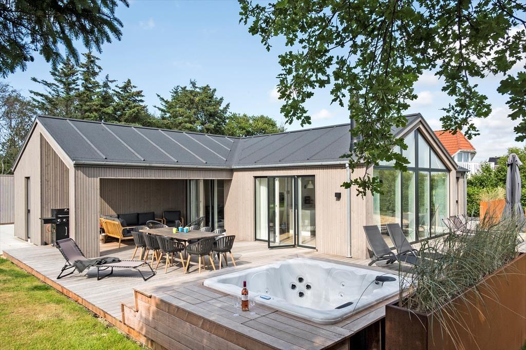Dette moderne luksussommerhus er den perfekte base for livsnyderne, der trænger til en afslappende ferie ved vestkysten. Huset er stort, smagfuldt indrettet og udstyret med både sauna og spabad på terrassen, og som et stort plus ligger det bare 200 meter fra Hvidbjerg Strand.