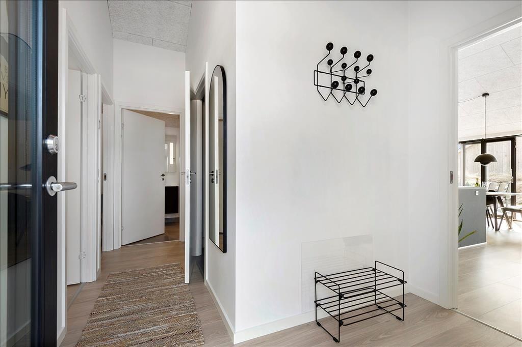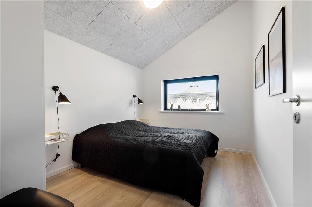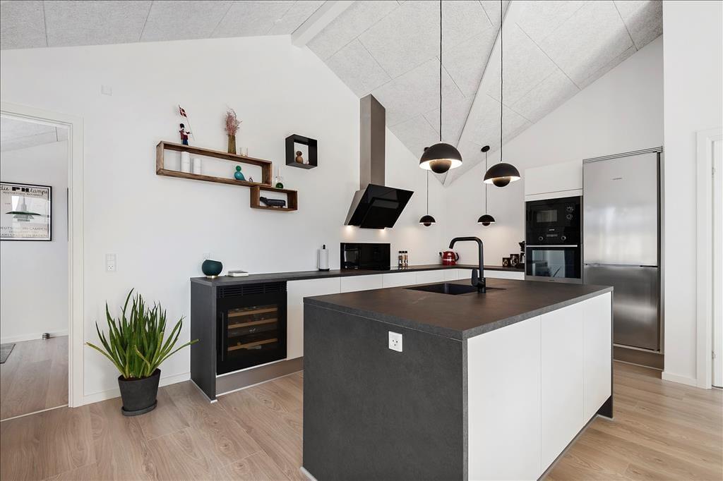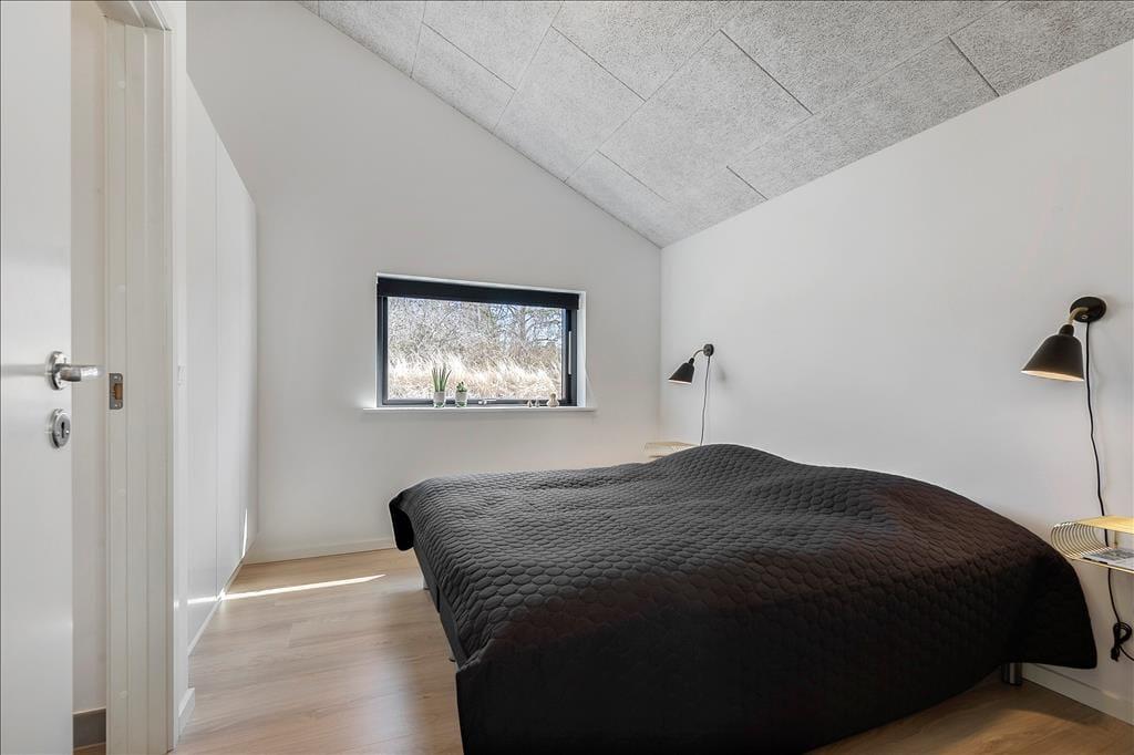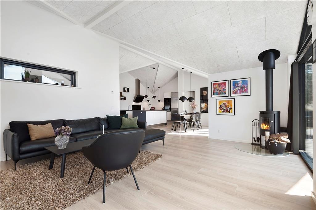 I sommerhuset er der hele 124 m2 at brede sig på, og med tre soveværelser og to badeværelser kan I nemt være op til seks feriegæster samlet. I alle rum er der loft til kip og flotte gulve, og det moderne interiør er på enkel vis primært holdt i sort-hvide nuancer. Den elegante indretningsstil pryder selvfølgelig også opholdsrummet, som er et stort og højloftet rum med et skønt lysindfald. Kan I lide at lave mad, kan I virkelig folde jer ud i den åbne køkkenafdeling, der er lækkert indrettet med gode hvidevarer og masser af arbejdsplads, og efter et skønt måltid mad omkring spisebordet er det perfekt at slænge sig i sofaafdelingen nær brændeovnen. Huset byder også på en god internetforbindelse 500/500, og ladestik til elbil.