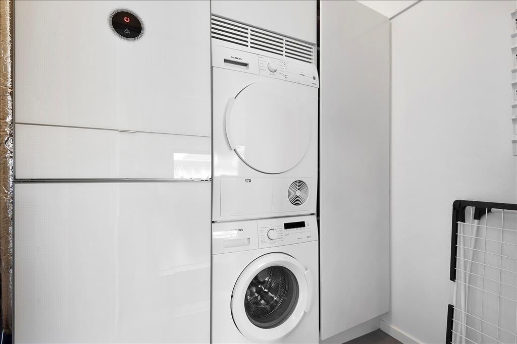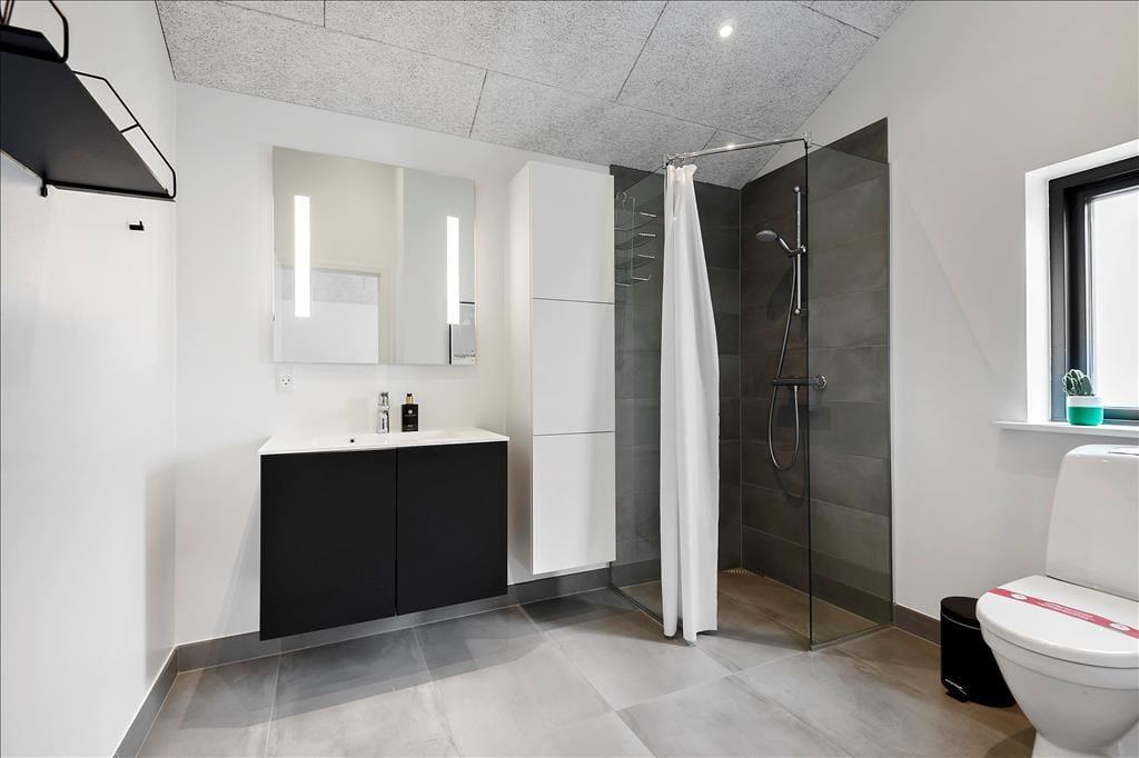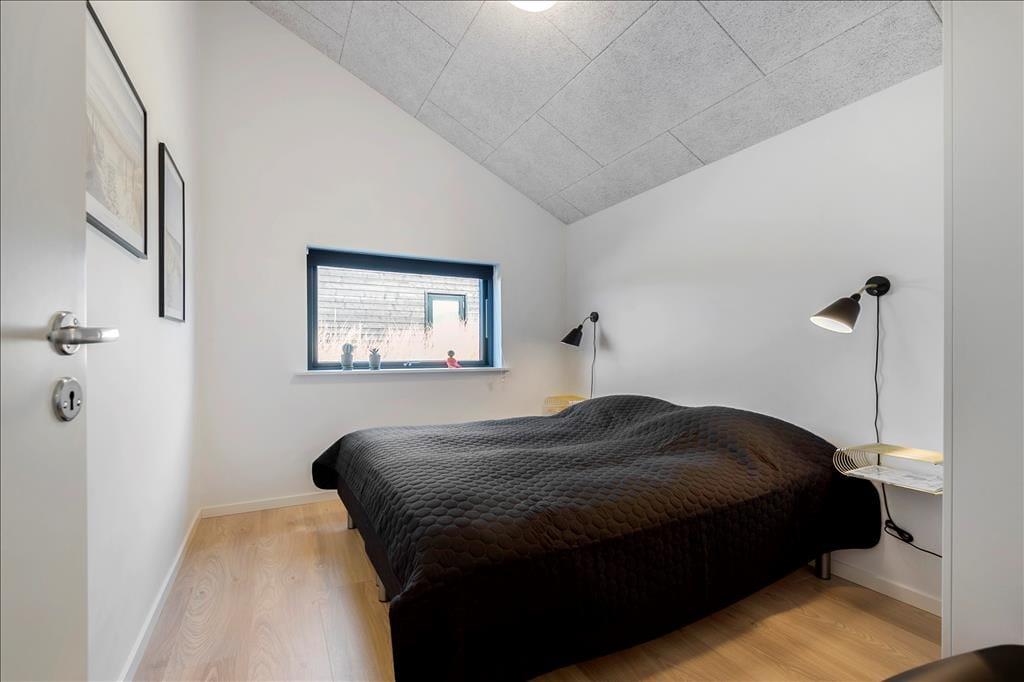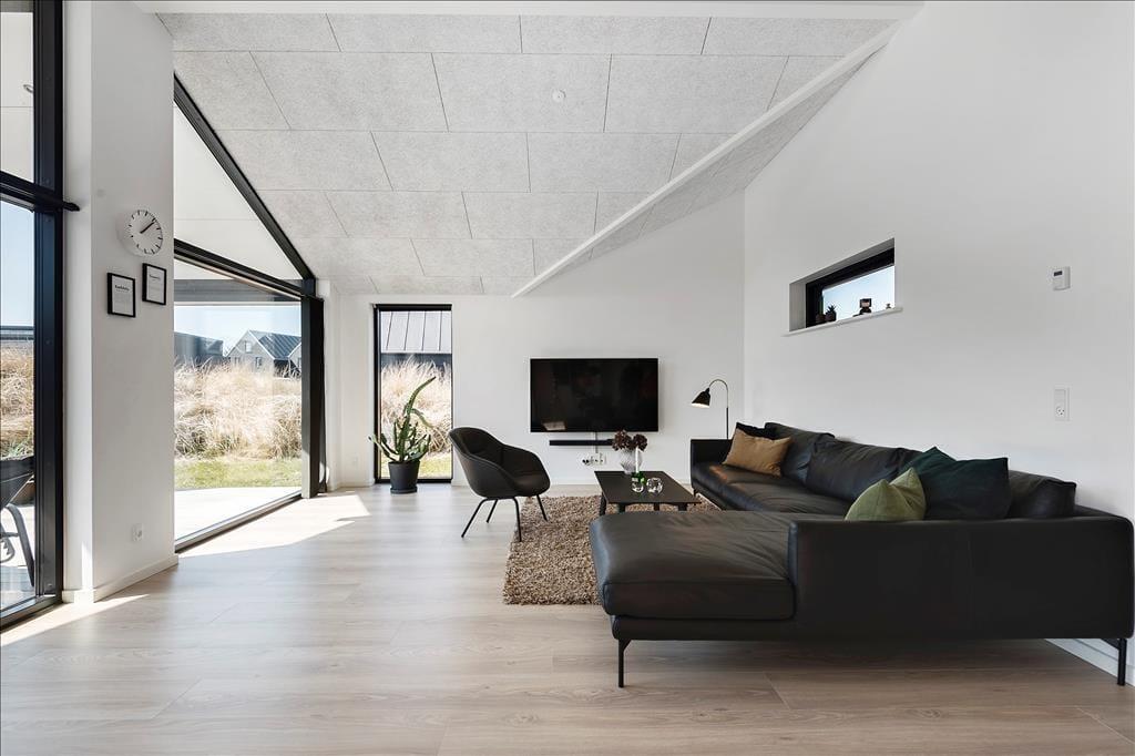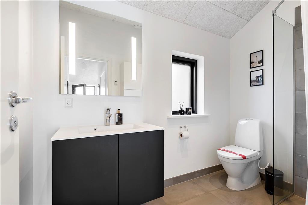 I sommerhuset er der hele 124 m2 at brede sig på, og med tre soveværelser og to badeværelser kan I nemt være op til seks feriegæster samlet. I alle rum er der loft til kip og flotte gulve, og det moderne interiør er på enkel vis primært holdt i sort-hvide nuancer. Den elegante indretningsstil pryder selvfølgelig også opholdsrummet, som er et stort og højloftet rum med et skønt lysindfald. Kan I lide at lave mad, kan I virkelig folde jer ud i den åbne køkkenafdeling, der er lækkert indrettet med gode hvidevarer og masser af arbejdsplads, og efter et skønt måltid mad omkring spisebordet er det perfekt at slænge sig i sofaafdelingen nær brændeovnen. Huset byder også på en god internetforbindelse 500/500, og ladestik til elbil.