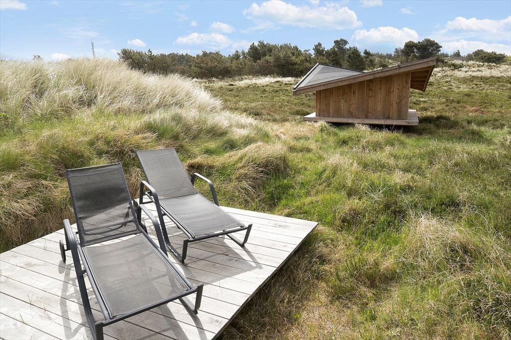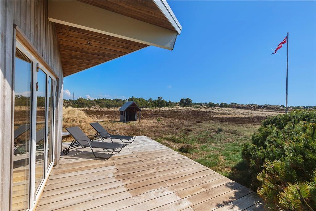 Sommerhusets mange døre gør det nemt at smutte ud i det fri, når vejret indbyder til solbadning og sommerfrokoster under åben himmel. Der er flere dejlige terrasseområder at vælge imellem, og alle ligger smukt placeret med udsigt over jeres egen store naturgrund og videre ud over det åbne hedelandskab – og nogle steder kan I endda se Blåvandshuk Fyr knejse i horisonten. På jeres egen grund står en udendørs bruser, så I hurtigt kan få et opfriskende bad efter strandturen, inden aftenen byder på grillmiddag og hyggeligt familiesamvær.