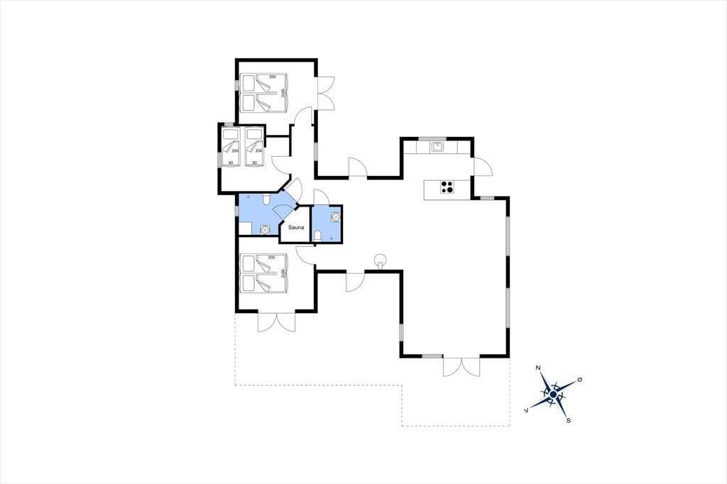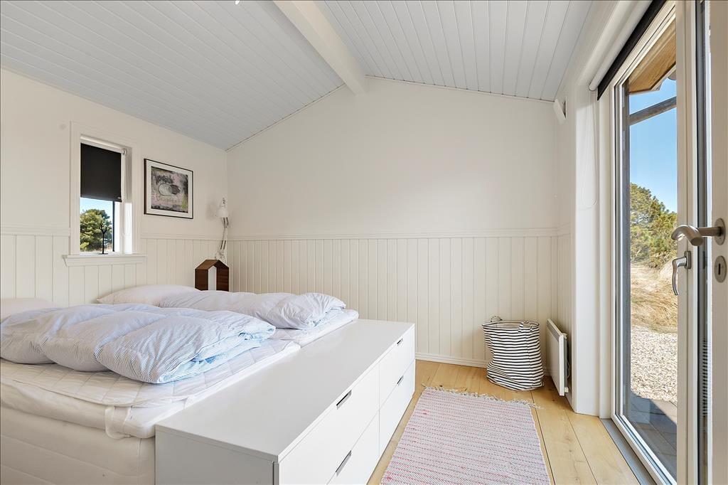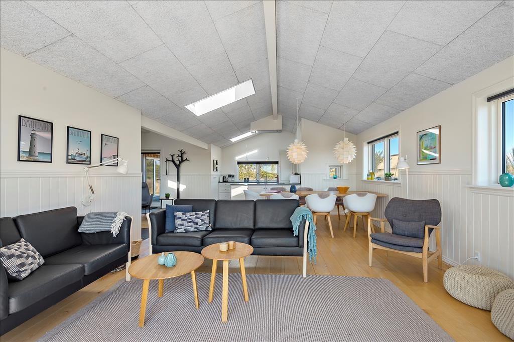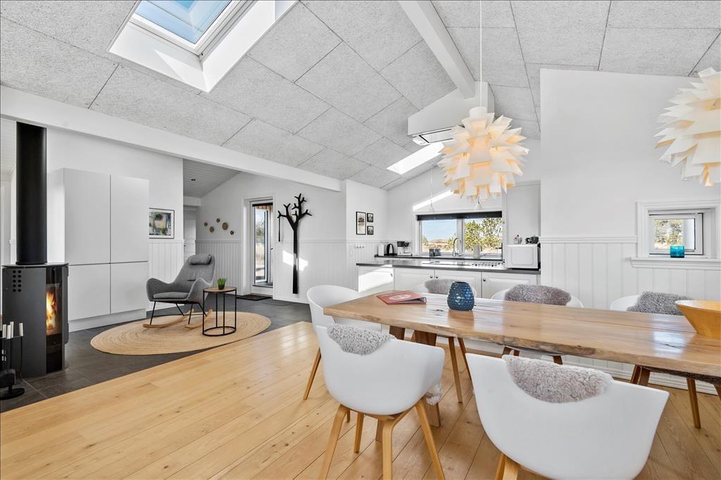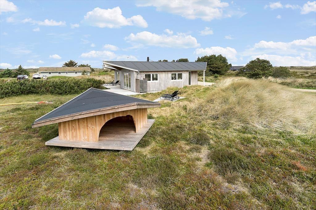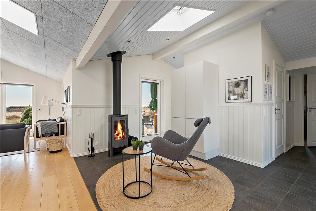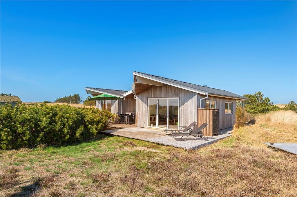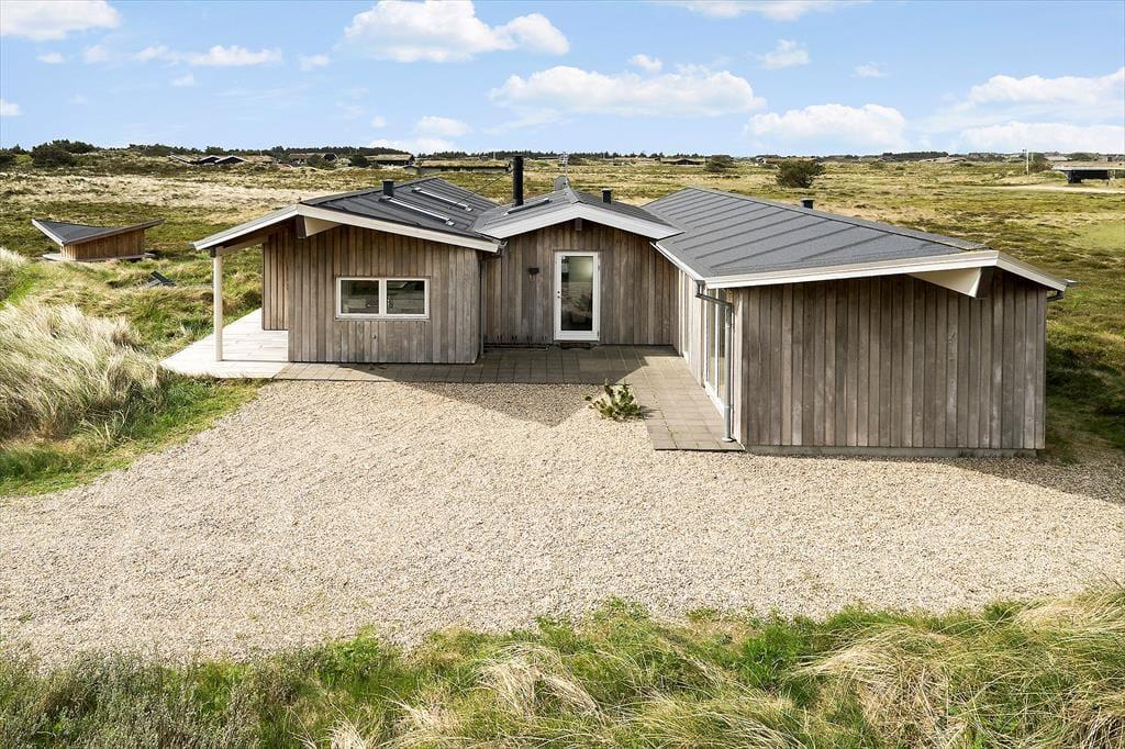 Her på adressen ligger et velproportioneret sommerhus, der har et moderne look med sin spændende arkitektur og sin rustikke facade i ubehandlet egetræ. Det ubehandlet egetræ får en naturlig patina som gør, at huset naturligt falder til i den vestjyske natur. Takket være planløsningen og de mange kvadratmeter kan I nemt og bekvemt samles seks personer i huset. Rummene er lyse og indbydende, og rundt omkring er der dejlige detaljer at hæfte sig ved: For eksempel er der gode dobbeltsenge på de tre soveværelser, mens det ene af de to badeværelser er udstyret med en sauna, så I rigtigt kan slappe af og nyde ferielivet. Stuen er et herligt sted at hygge sig sammen, for her er der stilrent møblement, en brændeovn og et åbent køkken med god arbejdsplads. Noget af det fineste er nu næsten udsigten, for synet af de åbne vidder udenfor vinduerne er med til at gøre ferien uforglemmelig.