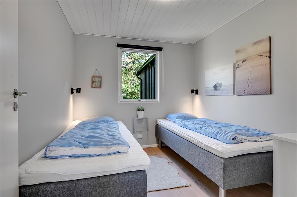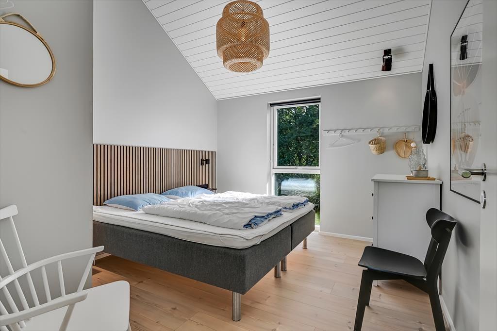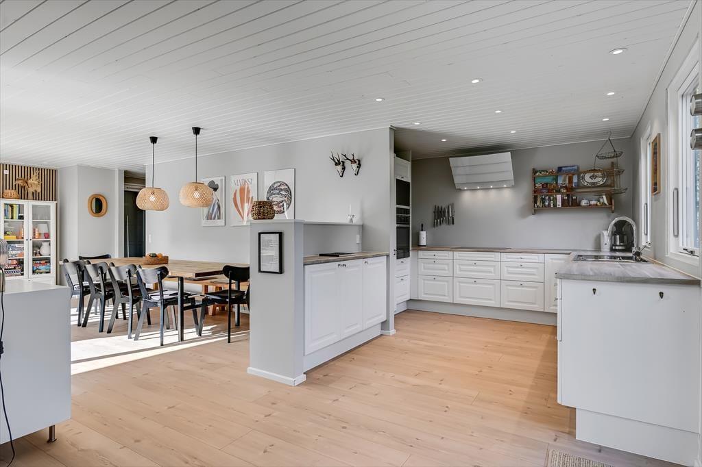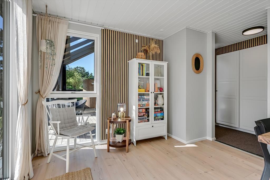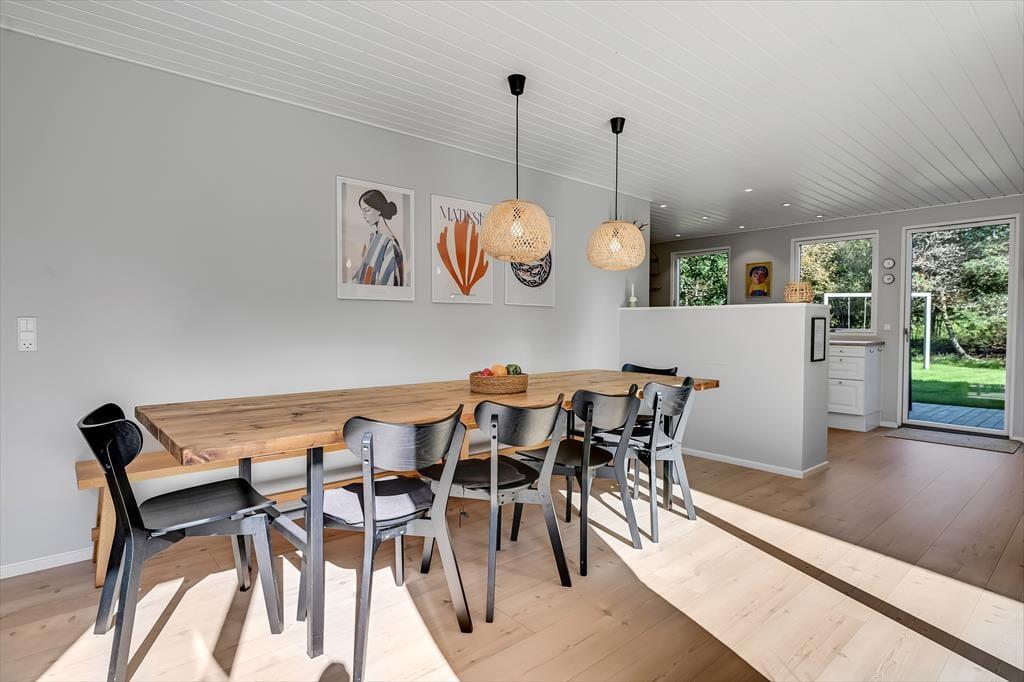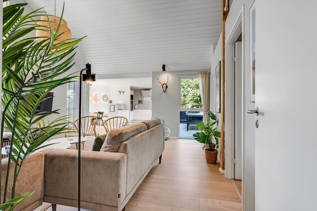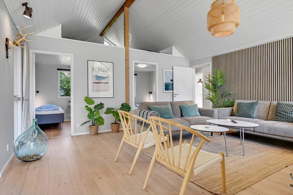 Under opførelsen blev der lagt vægt på at skabe en formfuldendt feriebolig, og resultatet er virkelig tilfredsstillende: Hver eneste af husets 144 m2 præsenterer sig på så indbydende vis, at det er en ren fornøjelse at opholde sig inden døre. De mange vinduer sørger for et godt lysindfald og udsigt til den grønne grund, og glasdørene gør det nemt at tage terrassemiljøet i brug. Sommerhusets samlingspunkt er en stor opholdsafdeling med køkken-alrum og stue i åben forbindelse. Her er der god plads til at hygge sig i fælles flok – også med madlavningen, for i det veludstyrede køkken kan I sagtens stå flere og kokkerere. Planløsningen byder desuden på to badeværelser, der er udstyret med bruseniche og gulvvarme, og ved sengetid kan I finde jer godt til rette på de fire soveværelser – og eventuelt også i alkoven, der byder på ekstra sengepladser.