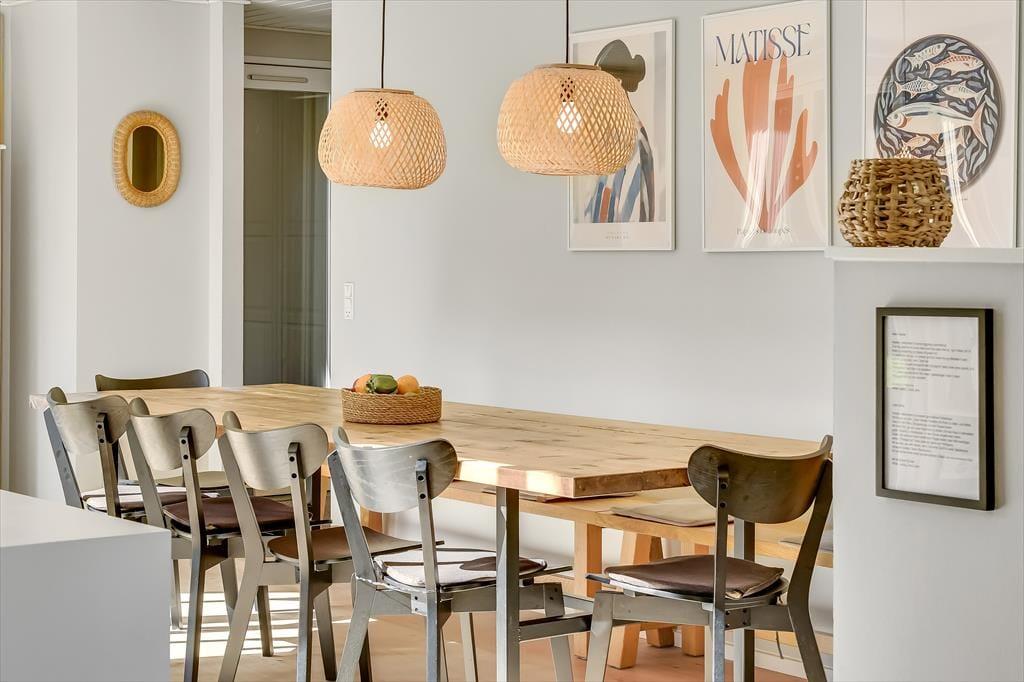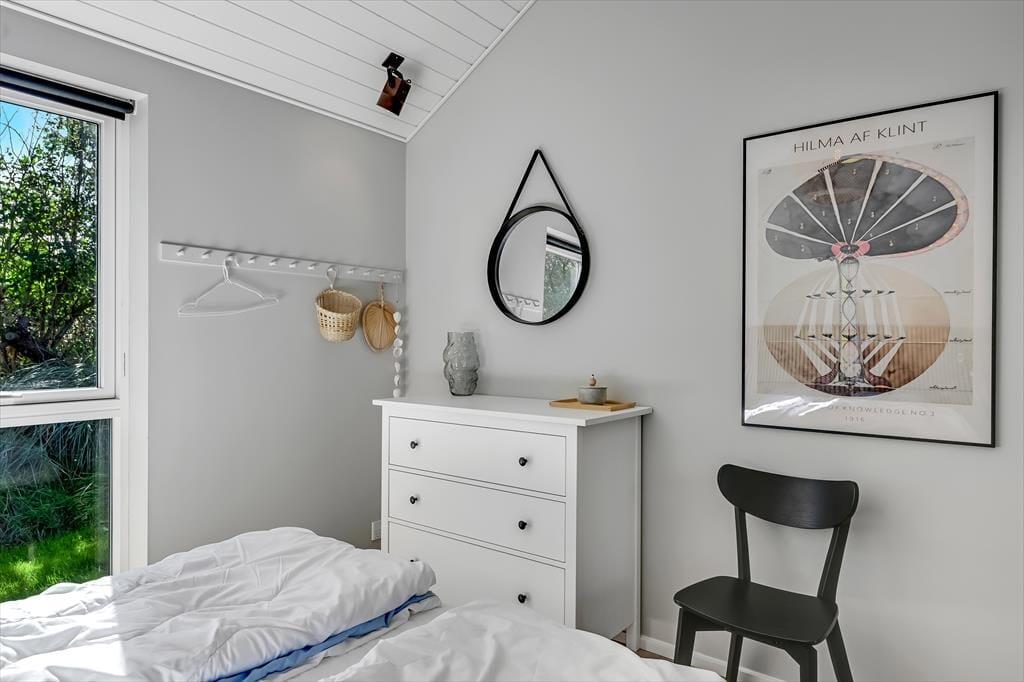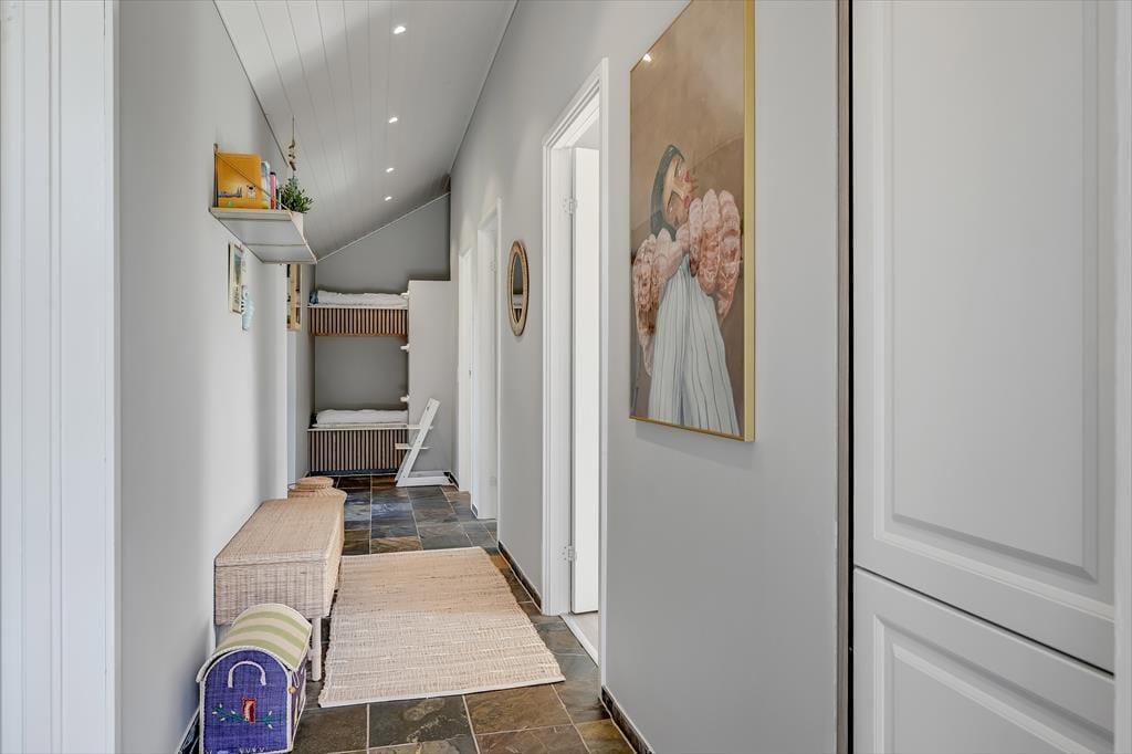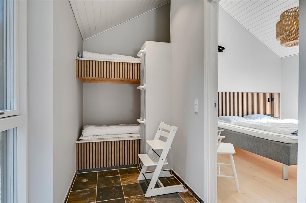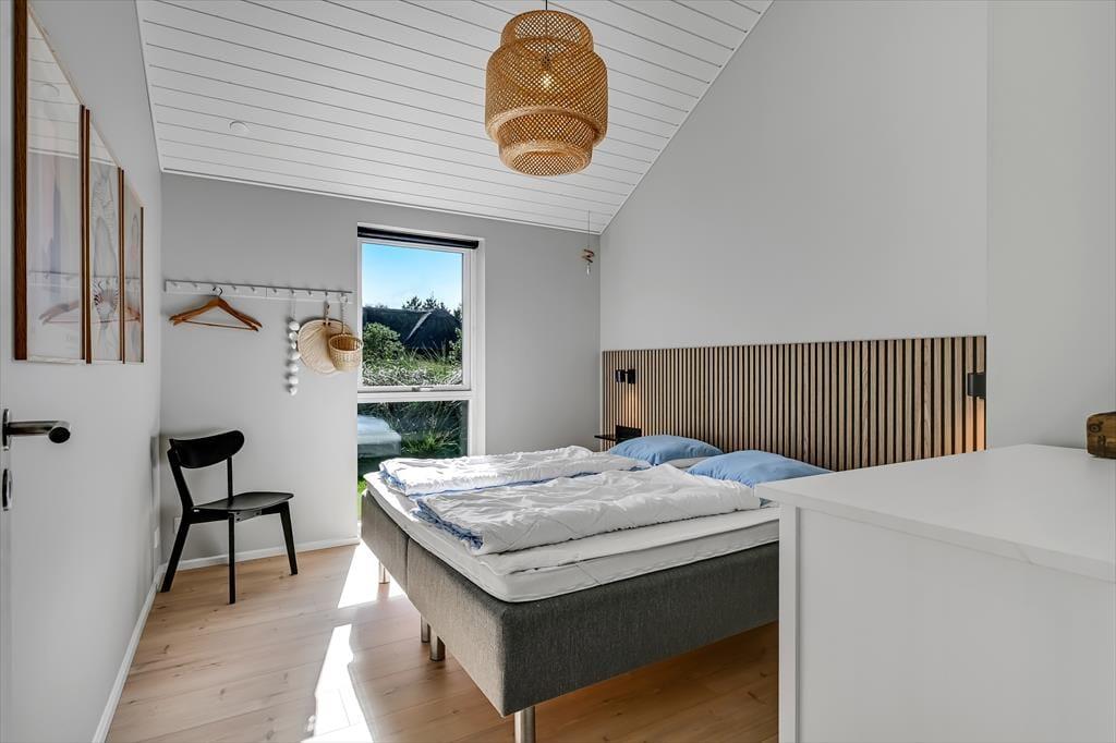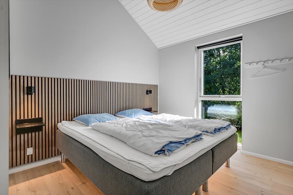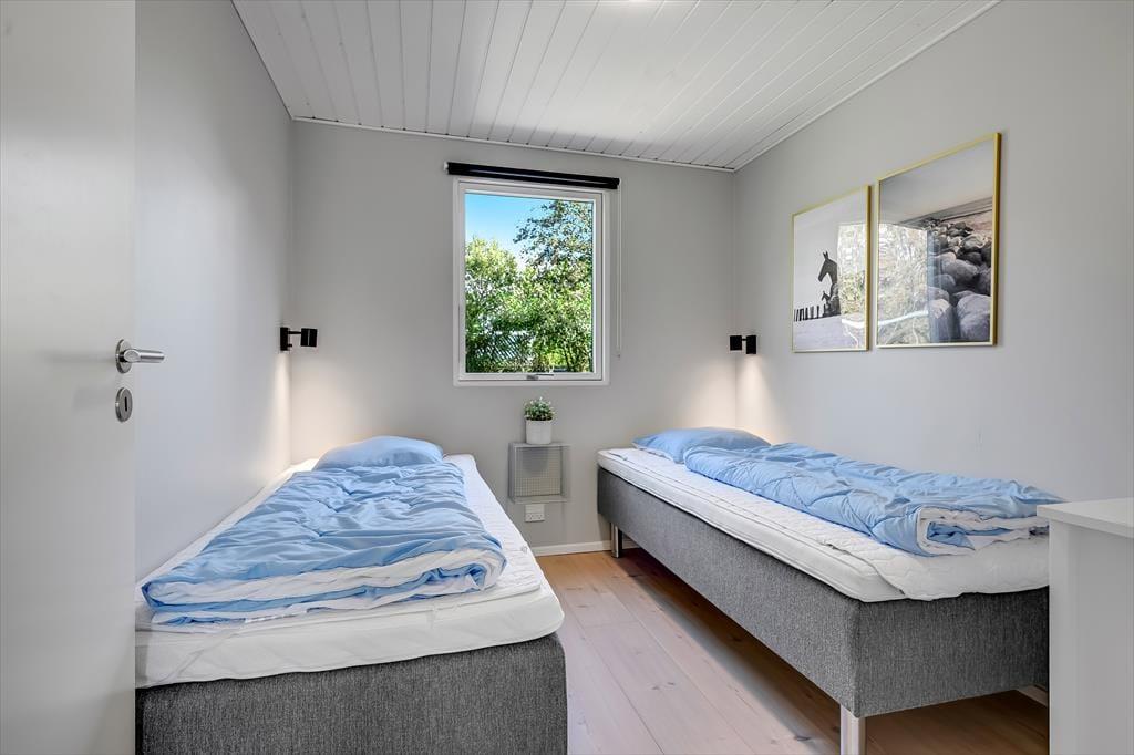 Under opførelsen blev der lagt vægt på at skabe en formfuldendt feriebolig, og resultatet er virkelig tilfredsstillende: Hver eneste af husets 144 m2 præsenterer sig på så indbydende vis, at det er en ren fornøjelse at opholde sig inden døre. De mange vinduer sørger for et godt lysindfald og udsigt til den grønne grund, og glasdørene gør det nemt at tage terrassemiljøet i brug. Sommerhusets samlingspunkt er en stor opholdsafdeling med køkken-alrum og stue i åben forbindelse. Her er der god plads til at hygge sig i fælles flok – også med madlavningen, for i det veludstyrede køkken kan I sagtens stå flere og kokkerere. Planløsningen byder desuden på to badeværelser, der er udstyret med bruseniche og gulvvarme, og ved sengetid kan I finde jer godt til rette på de fire soveværelser – og eventuelt også i alkoven, der byder på ekstra sengepladser.
