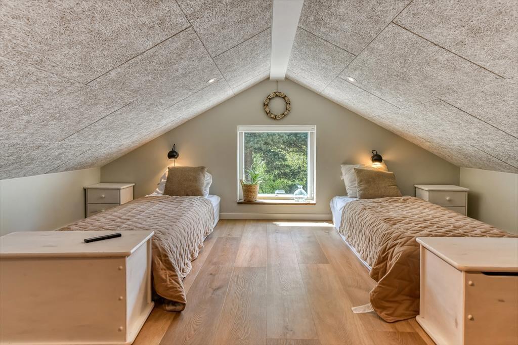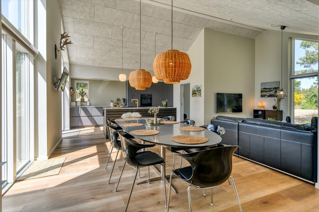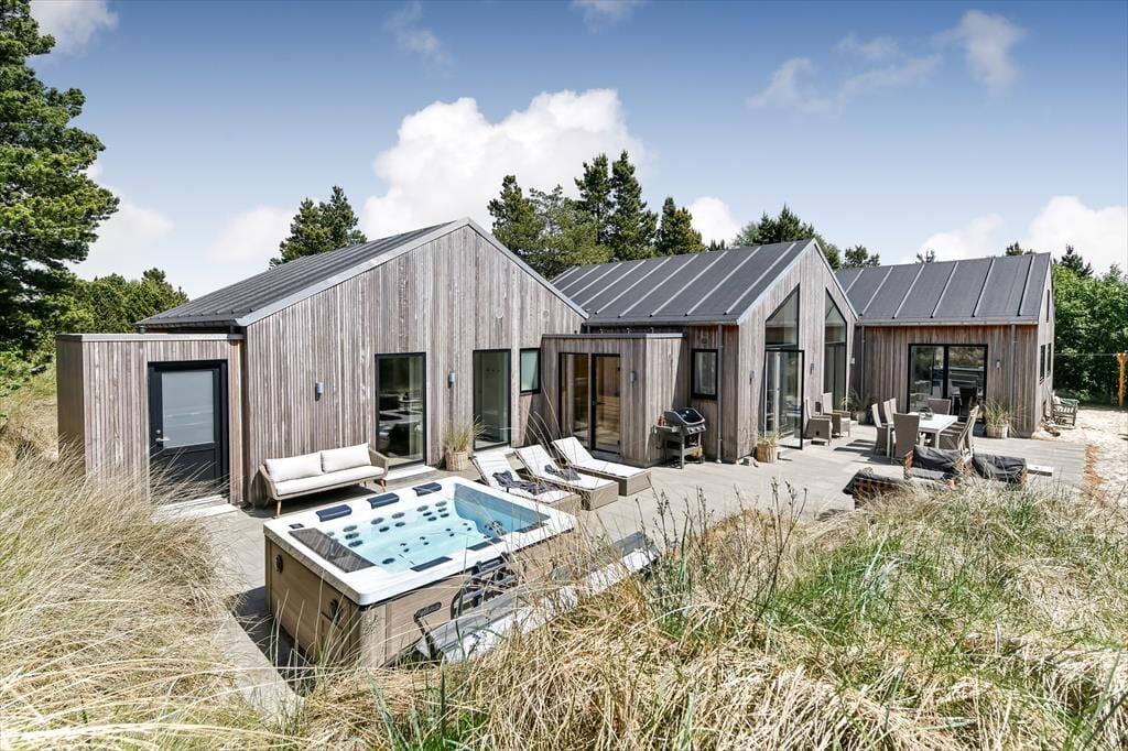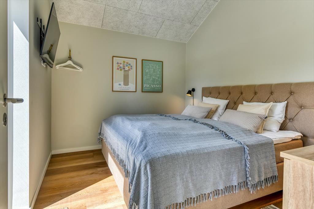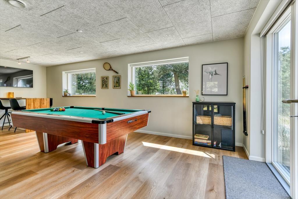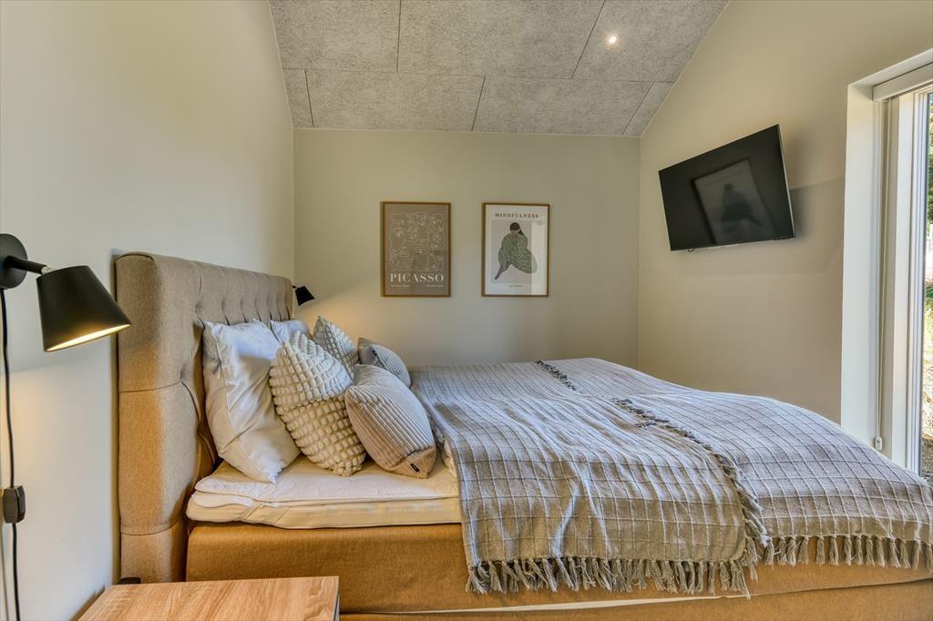Sommerhuset er bygget i 2022 og har et elegant ydre med træbeklædning og store vinduer. Kigger vi indenfor, er indretningen lys og moderne, og det er tydeligt, at materialer og interiør er udvalgt med stor omhu. Den sikre stilsans gør det til en ren fornøjelse at opholde sig inden døre – uanset om tiden bliver brugt på madlavning i det åbne køkken, afslapning i stuen eller pool- og bordtenniskampe i aktivitetsrummet. I kan selvfølgelig også se frem til en god nats søvn på de fire soveværelser, der alle er indrettet med dobbeltsenge. Husets rummelige hems giver plads til yderligere to personer, og heroppe er der for øvrigt et fladskærms-tv, hvilket der også er flere af nedenunder. Planløsningen byder desuden på et bryggers, et gæstetoilet og tre lækre badeværelser, hvoraf det ene er med badekar.