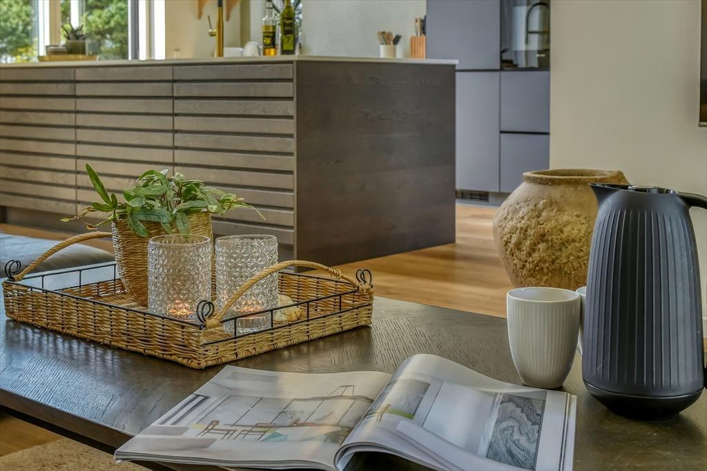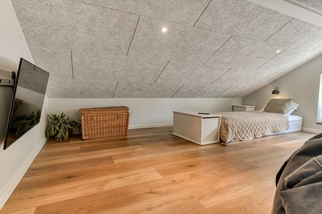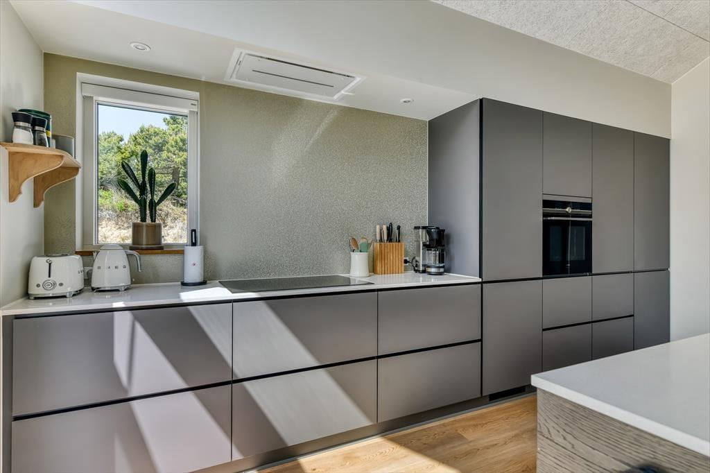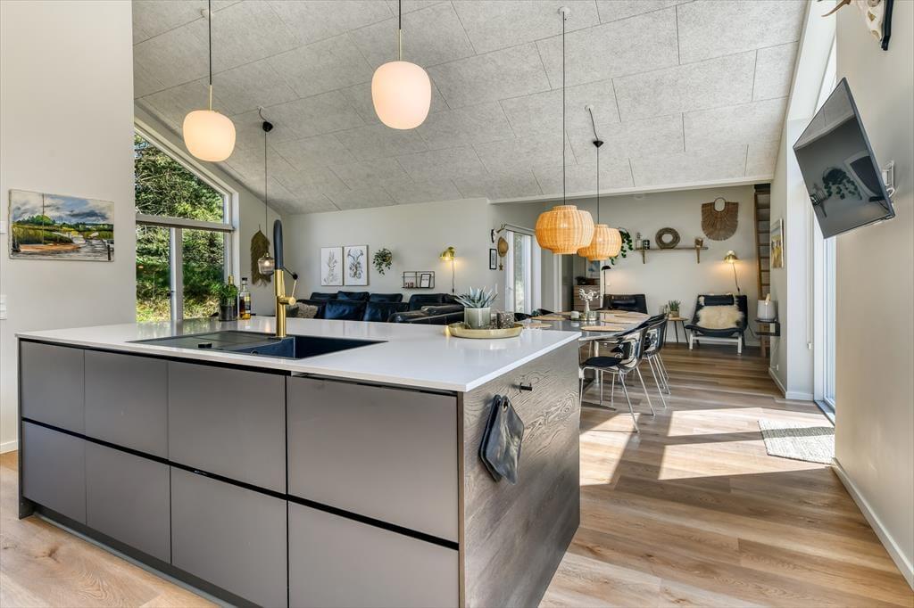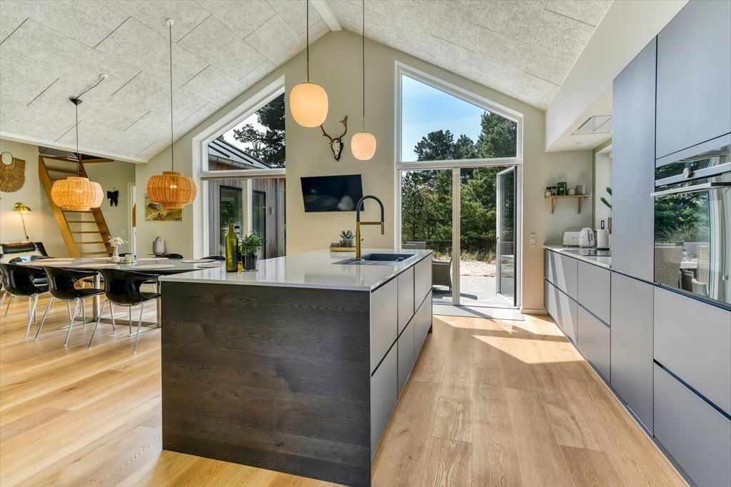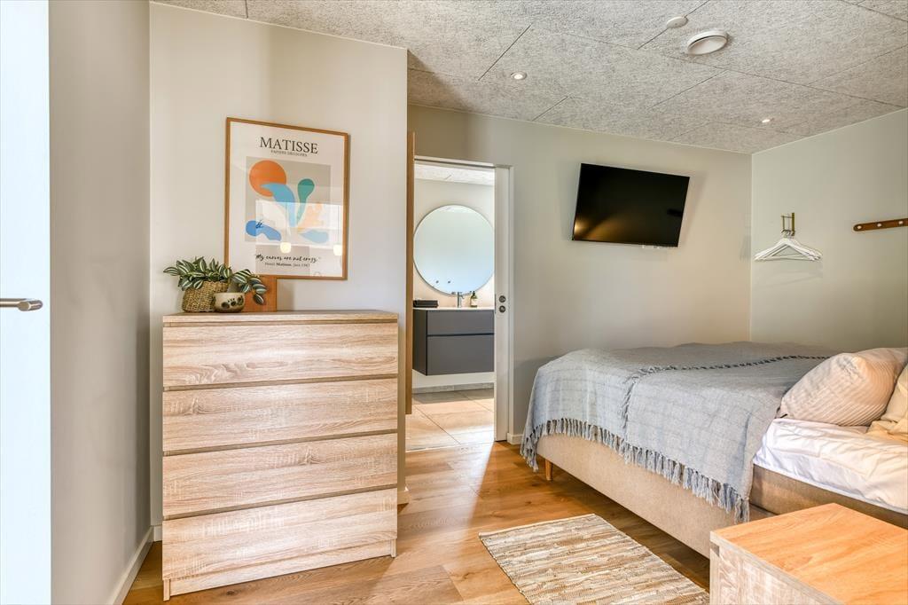 Sommerhuset er bygget i 2022 og har et elegant ydre med træbeklædning og store vinduer. Kigger vi indenfor, er indretningen lys og moderne, og det er tydeligt, at materialer og interiør er udvalgt med stor omhu. Den sikre stilsans gør det til en ren fornøjelse at opholde sig inden døre – uanset om tiden bliver brugt på madlavning i det åbne køkken, afslapning i stuen eller pool- og bordtenniskampe i aktivitetsrummet. I kan selvfølgelig også se frem til en god nats søvn på de fire soveværelser, der alle er indrettet med dobbeltsenge. Husets rummelige hems giver plads til yderligere to personer, og heroppe er der for øvrigt et fladskærms-tv, hvilket der også er flere af nedenunder. Planløsningen byder desuden på et bryggers, et gæstetoilet og tre lækre badeværelser, hvoraf det ene er med badekar.
