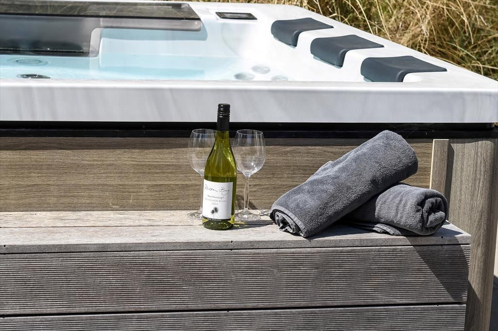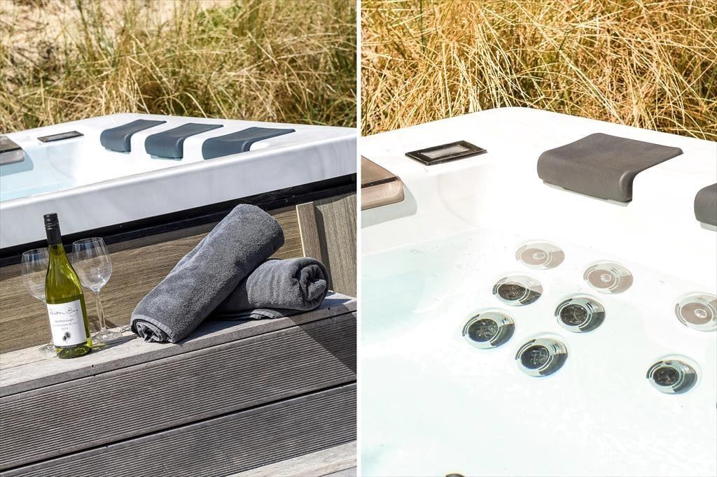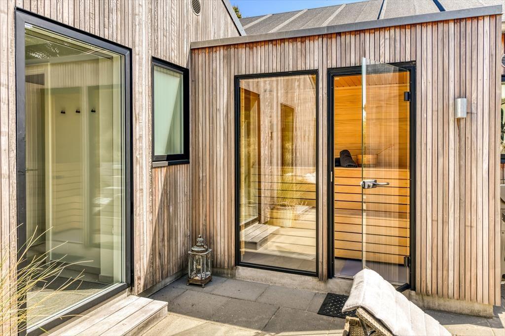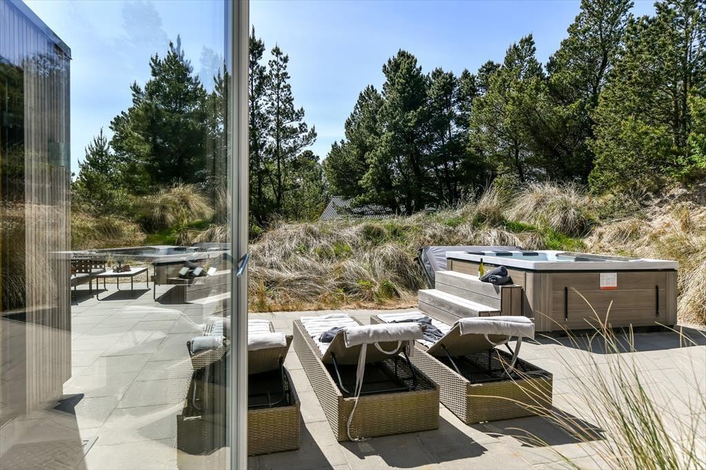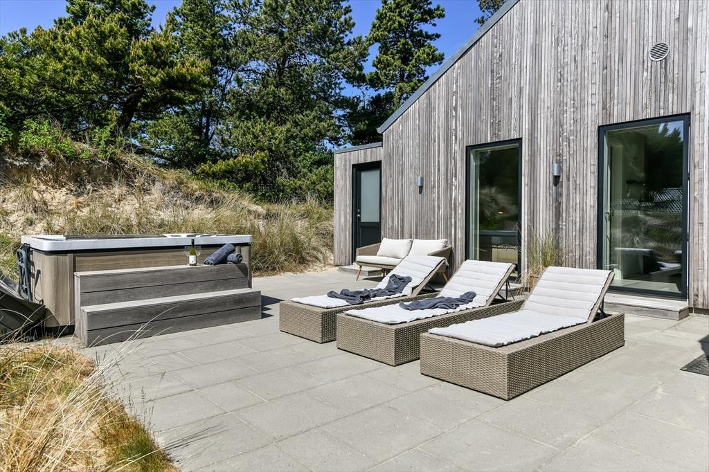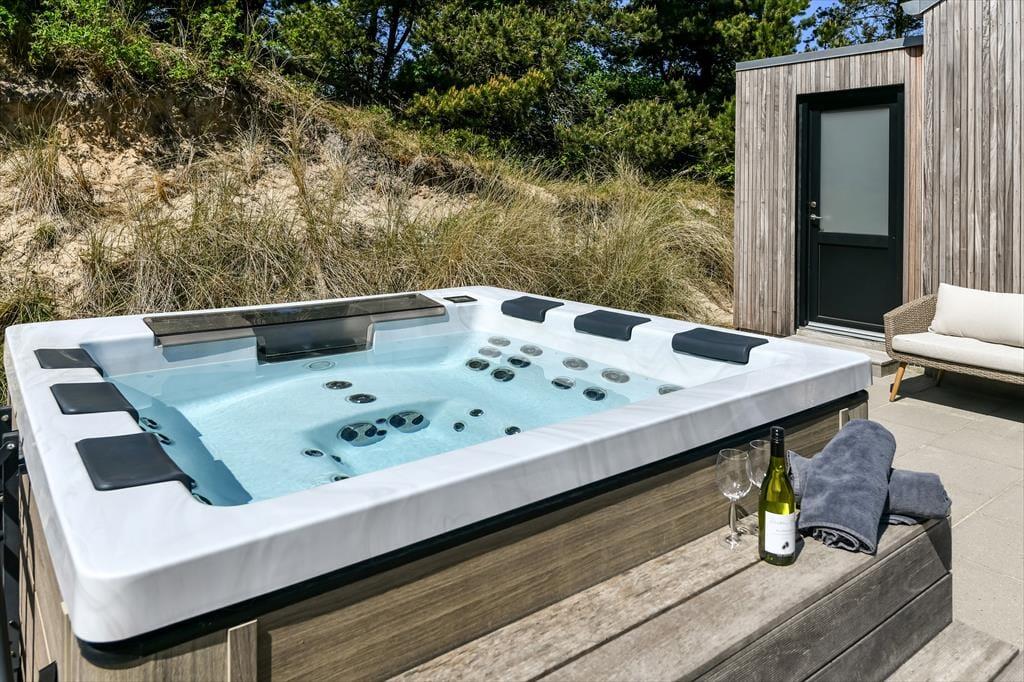 Bademuligheder er der også ude i det fri, for på terrassen venter en hel wellnessafdeling med udendørs spa og sauna. Det er velgørende at kunne slappe af her, når I vender hjem fra dagens udflugter – hvis altså ikke aftenen bliver brugt på en overdådig middag tilberedt på grillen eller hygge i loungemøblerne. Terrassemiljøet, der ligger syd for huset, er stort og solrigt, og mod øst finder I en mindre, men bestemt også dejlig morgenterrasse. Foran huset har I god plads til parkering, og som en praktisk detalje er der oplader til elbil. Når I booker dette hus har I også adgang til at spille golf på 9-hullers-banen ved Blåvandshuk Golf