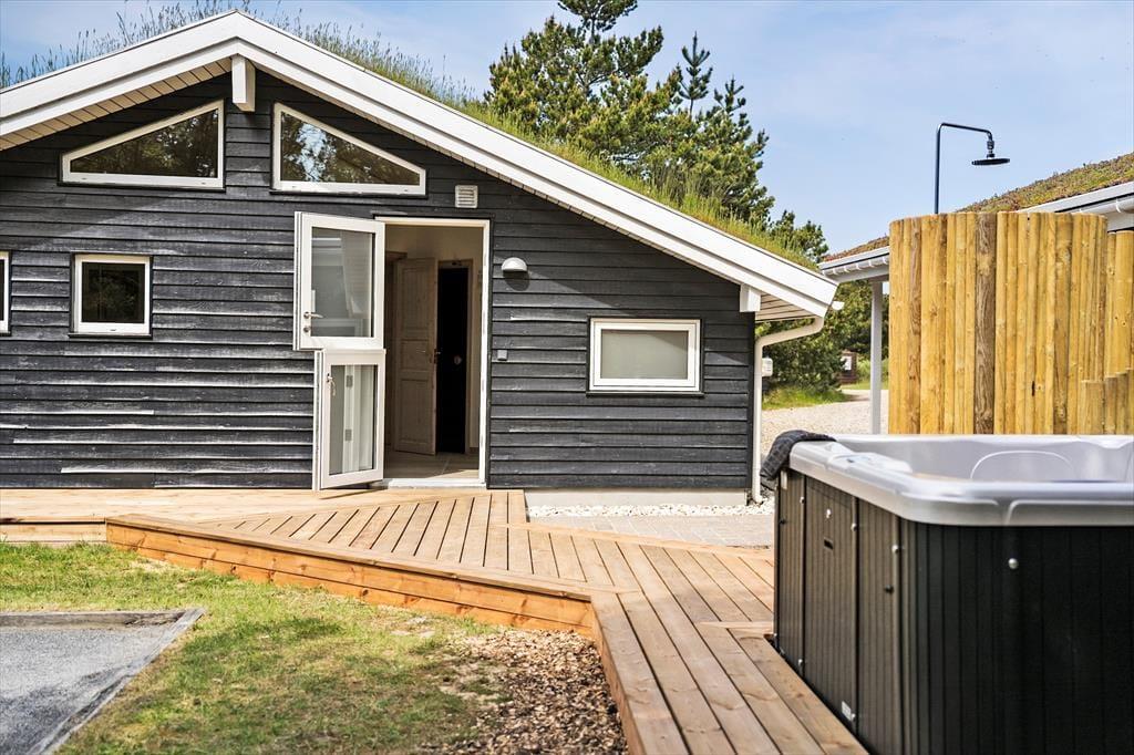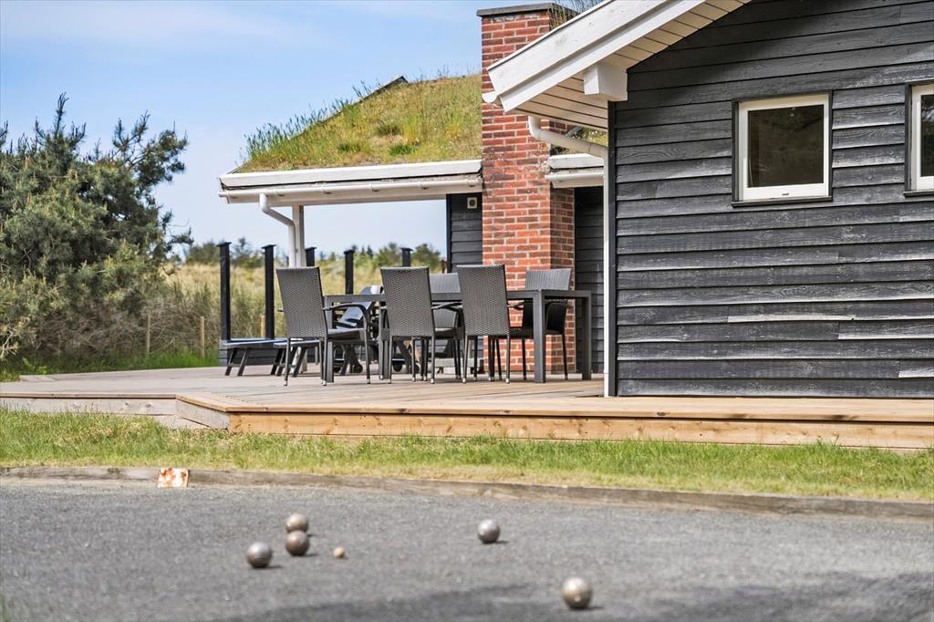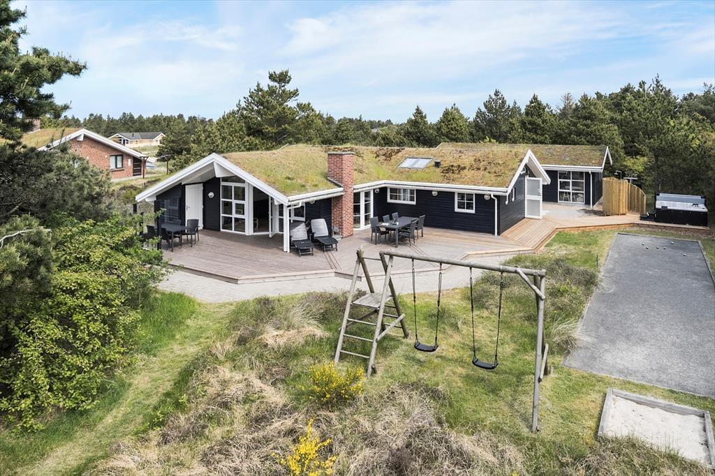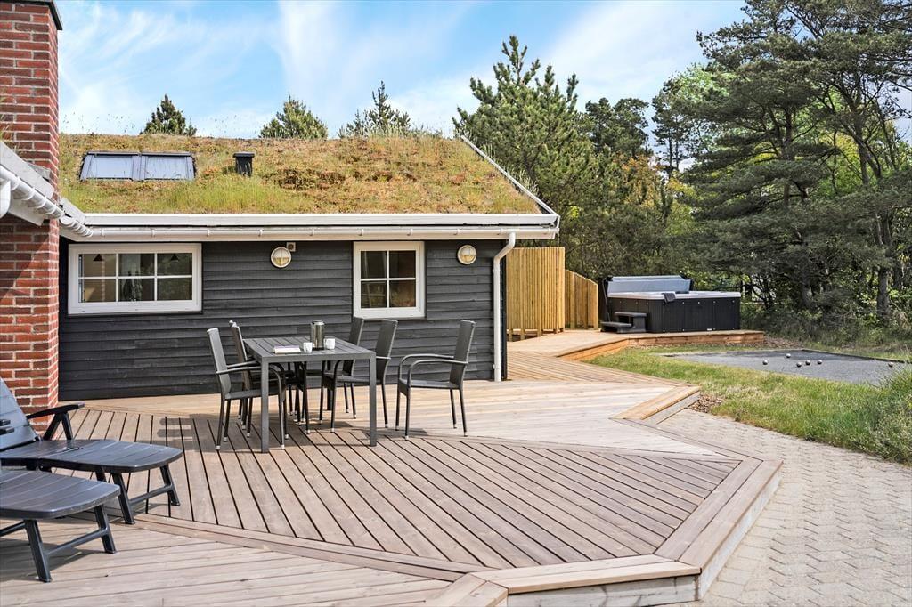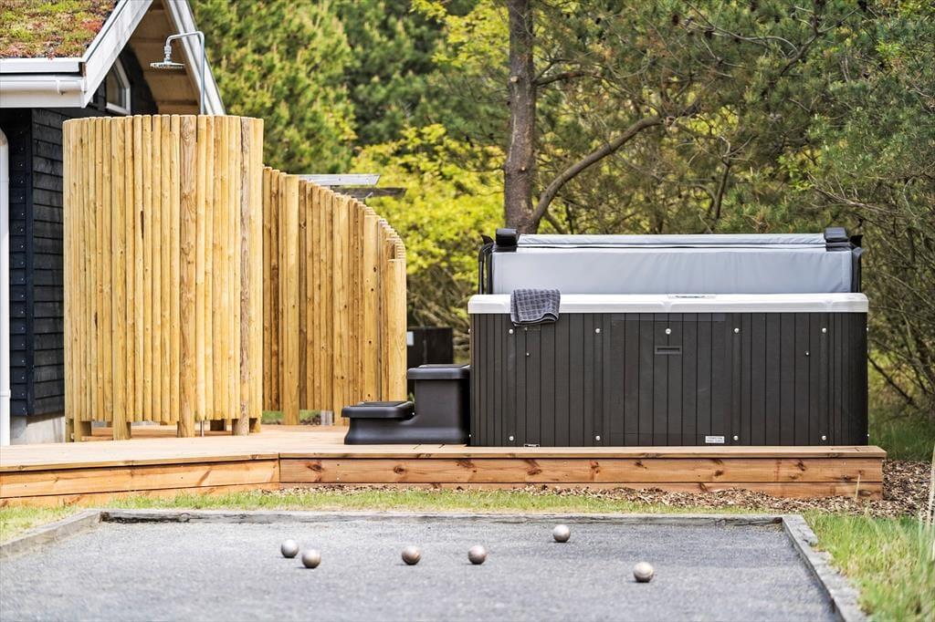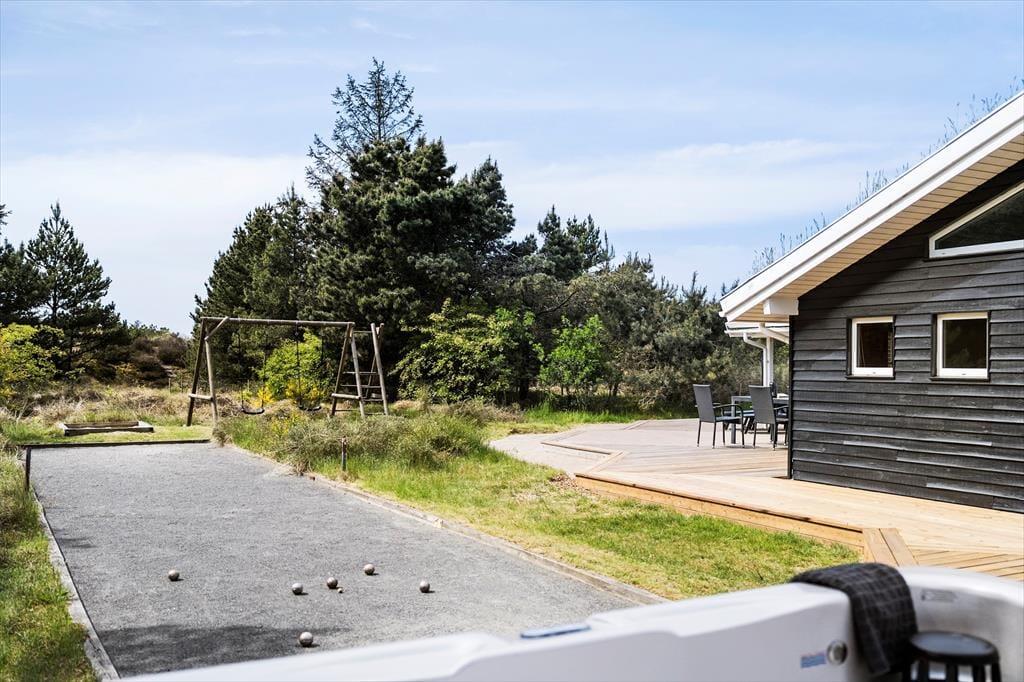 Selvom husets indre er lyst og indbydende, vil I formentlig tilbringe mest mulig tid ude i det fri, når solen skinner. Den 2040 m2 store naturgrund er nemlig særdeles skøn, så her kan I lege, slappe af og nyde ferielivet fuldt ud. Mellem den vilde beplantning er der både petanquebane, sandkasse og legestativ, mens en stor og delvist overdækket træterrasse breder sig syd for sommerhuset. Et udendørs spabad er prikken over i’et, for at sidde her under stjernehimlen bliver helt klart en mindeværdig ferieoplevelse.
