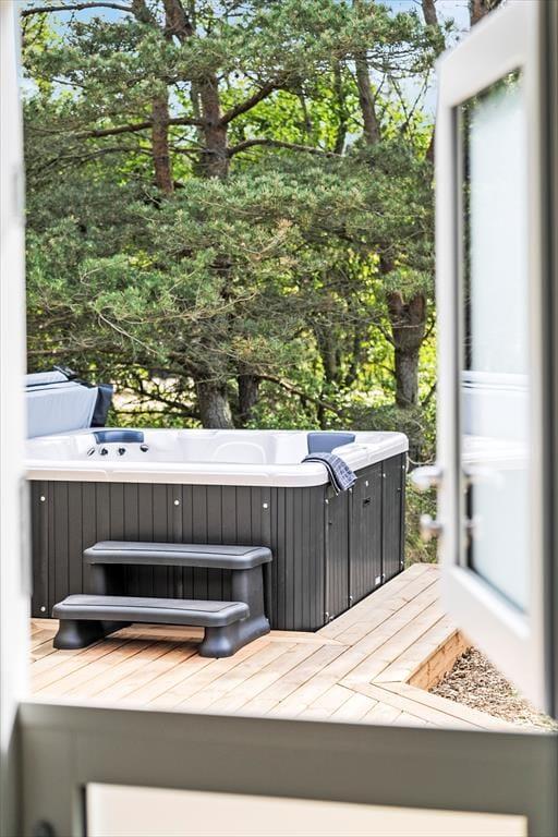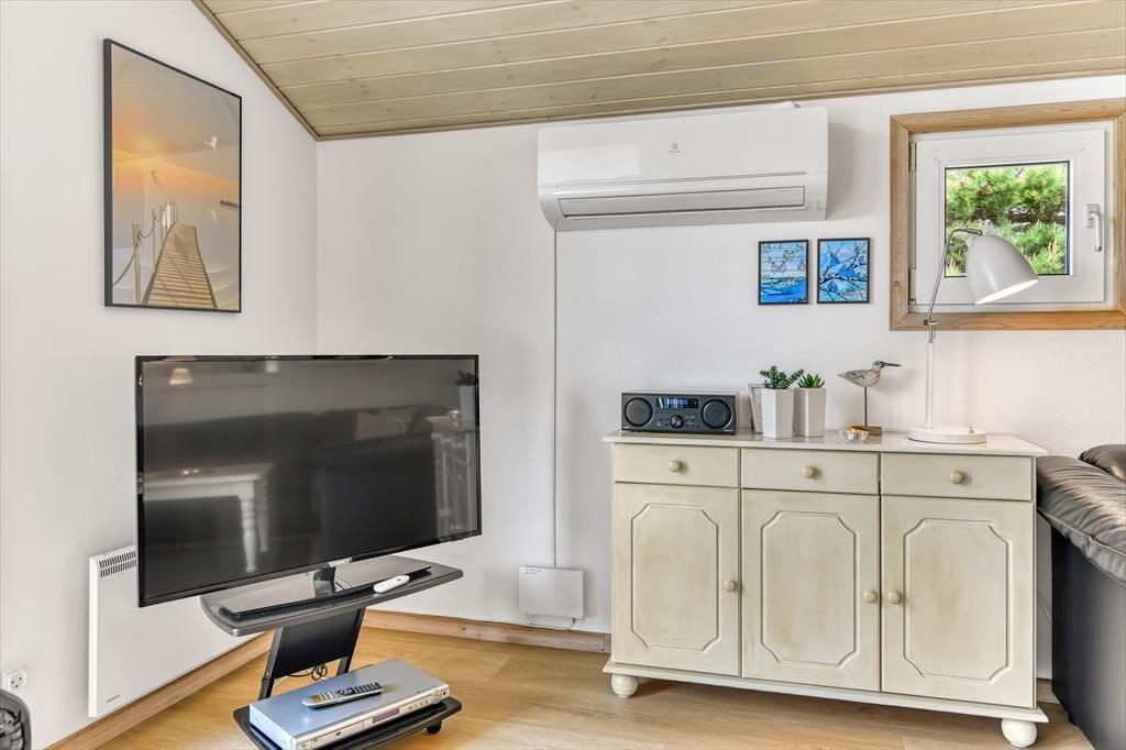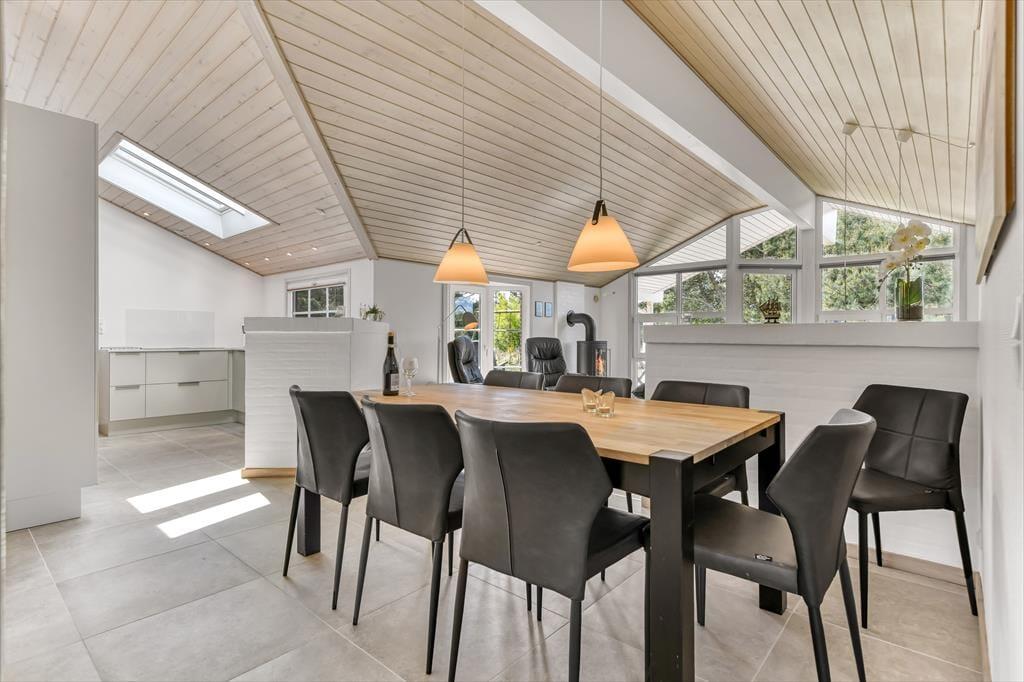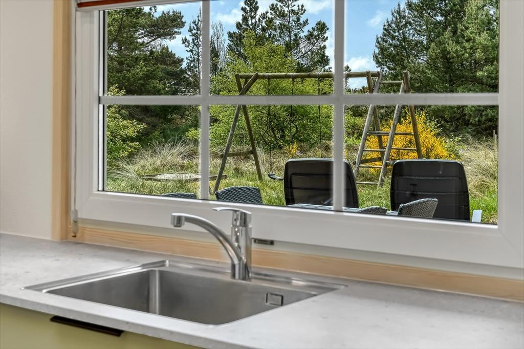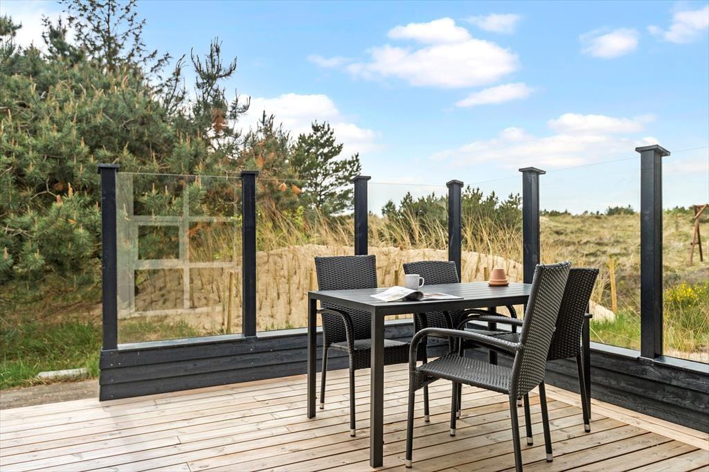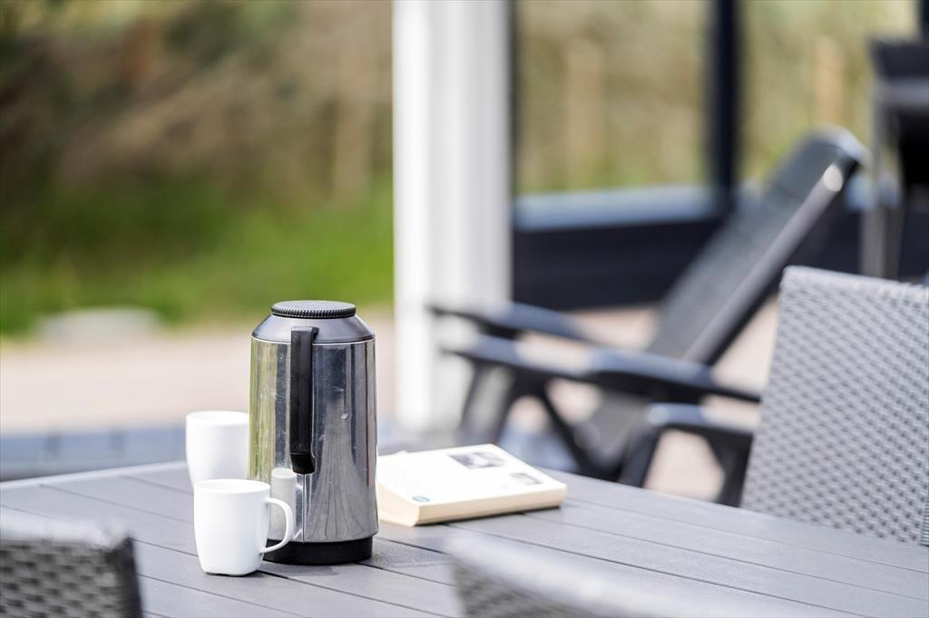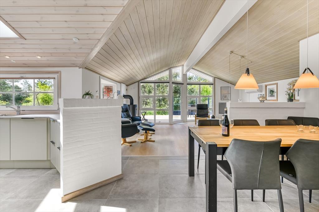 Selvom husets indre er lyst og indbydende, vil I formentlig tilbringe mest mulig tid ude i det fri, når solen skinner. Den 2040 m2 store naturgrund er nemlig særdeles skøn, så her kan I lege, slappe af og nyde ferielivet fuldt ud. Mellem den vilde beplantning er der både petanquebane, sandkasse og legestativ, mens en stor og delvist overdækket træterrasse breder sig syd for sommerhuset. Et udendørs spabad er prikken over i’et, for at sidde her under stjernehimlen bliver helt klart en mindeværdig ferieoplevelse.